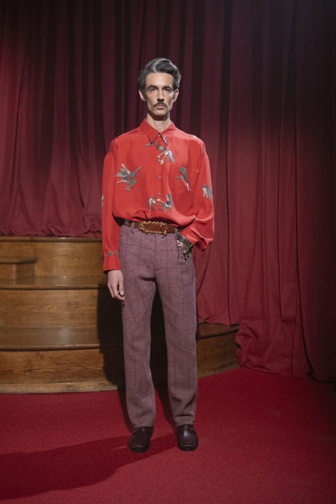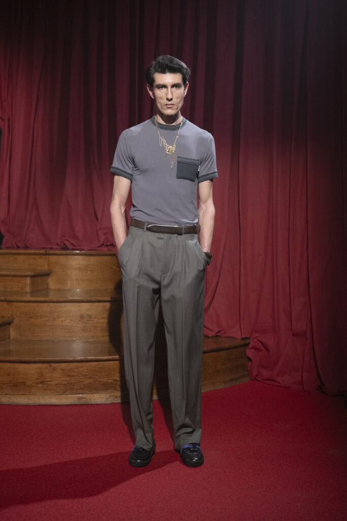 Les silhouettes racontent une histoire de protection, voire de superstition. Les pantalons sont construits pour vriller, enserrer, se révoltant presque contre le porteur. En réponse à cette contrainte physique, la taille se pare d’amulettes : morceaux de ceintures et fragments de sartoria assemblés comme des gris-gris pour conjurer le sort.