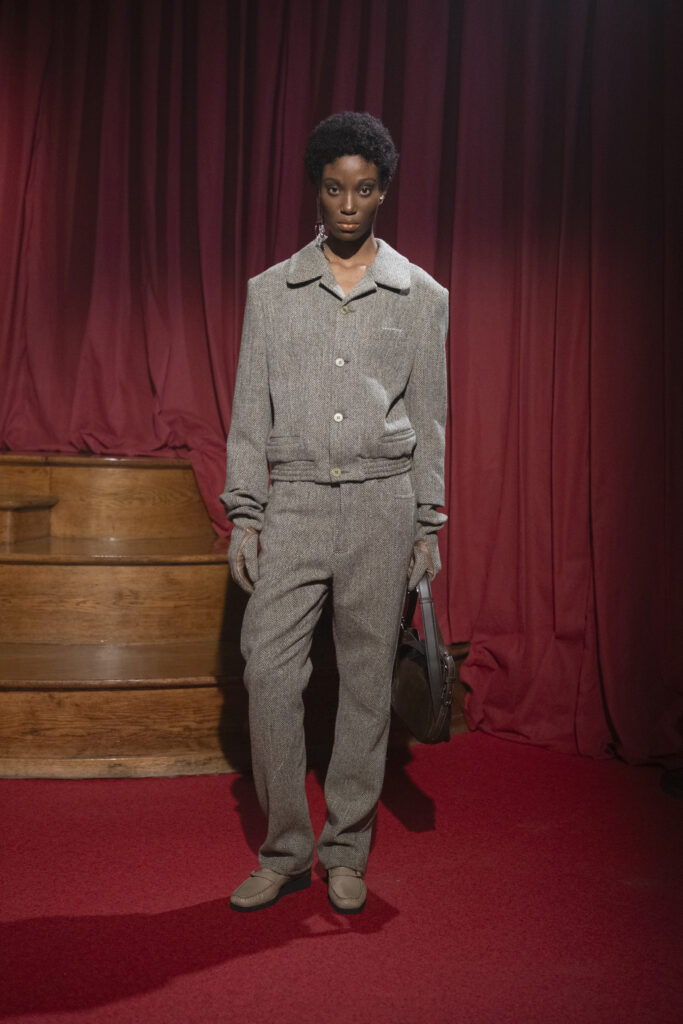 L’intérêt technique de cette collection réside dans le traitement des matières, brouillant les pistes entre le noble et le trivial. Le vestiaire s’appuie sur des piliers britanniques robustes : Shetland, Harris Tweed et mohair, travaillés dans des coupes qui rappellent les tailleurs et twin-sets des années 90.