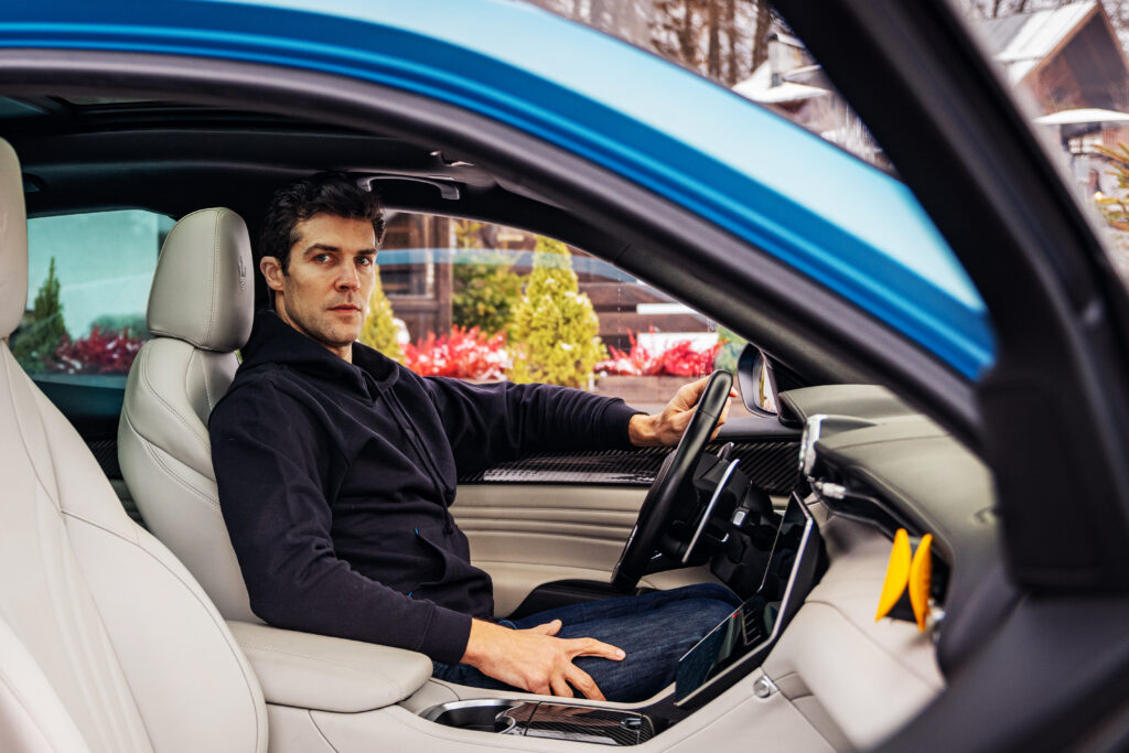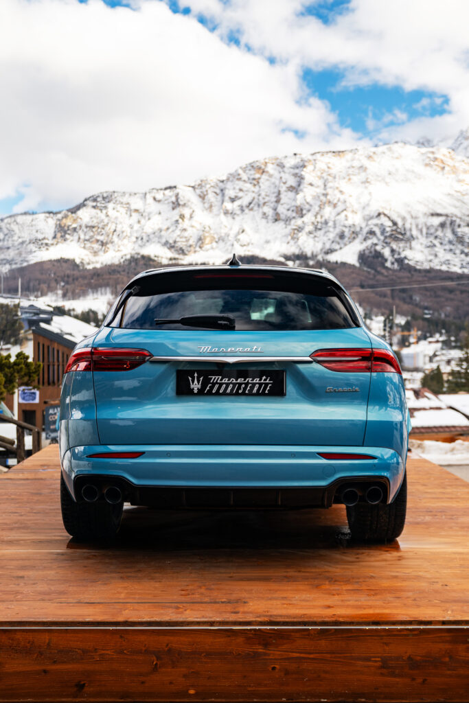 La carrosserie arbore une teinte spécifique, l’Azzurro Aureo. Techniquement, il s’agit d’une laque complexe évoluant d’un bleu profond vers un blanc froid, rappelant la matérialité de la neige et de la glace. Les ateliers de Modène y ont intégré un mica doré, pigmentation subtile qui ne se révèle que sous une certaine incidence de lumière. Les trains roulants sont confiés à des jantes en alliage CRIO de 21 pouces, profitant d’une finition diamantée, tandis que les inserts de calandre abandonnent le chrome ou le noir pour s’aligner sur la teinte carrosserie.