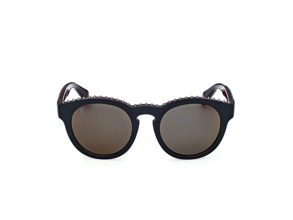 La différence est technique. Un logo s’applique. Un vocabulaire formel se décline. Maison Christian Louboutin ne se contente pas de plaquer sa semelle rouge sur des montures standardisées. Elle la transforme en système de détails sculptés : forme de semelle intégrée aux ponts et barres de sourcils, motif palmette (autre signature de la Maison) gravé sur les branches et cerclages, clous décoratifs empruntés aux collections de maroquinerie. Chaque élément renvoie à l’univers esthétique construit par Christian Louboutin depuis trois décennies. Le résultat n’est pas une simple lunette signée. C’est une lunette qui parle le langage formel de la Maison.