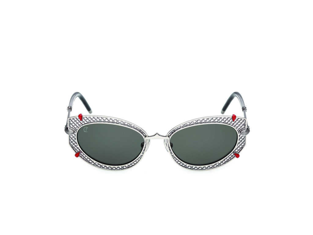 La réponse se trouve dans la collection de lunettes que Maison Christian Louboutin présente ,quatorze modèles — neuf solaires, cinq optiques — qui transforment la semelle rouge en motif ornemental applicable aux montures. Le rouge n’est plus une surface fonctionnelle dissimulée. Il devient insert décoratif sur les faces avant, estampille gravée à l’intérieur des branches, détail coloré sur les charnières. Autrement dit : la semelle rouge ne se porte plus sous le pied. Elle se porte désormais sur le visage, visible et assumée comme ornement.
