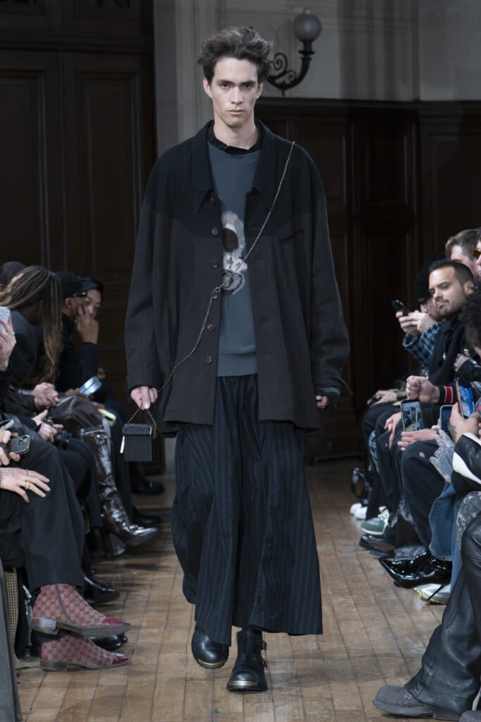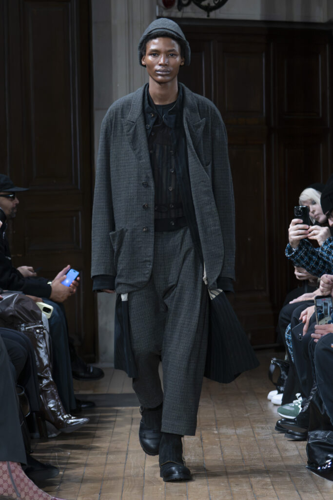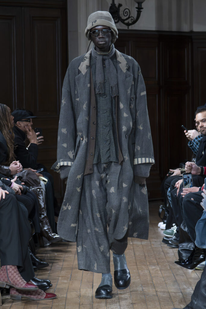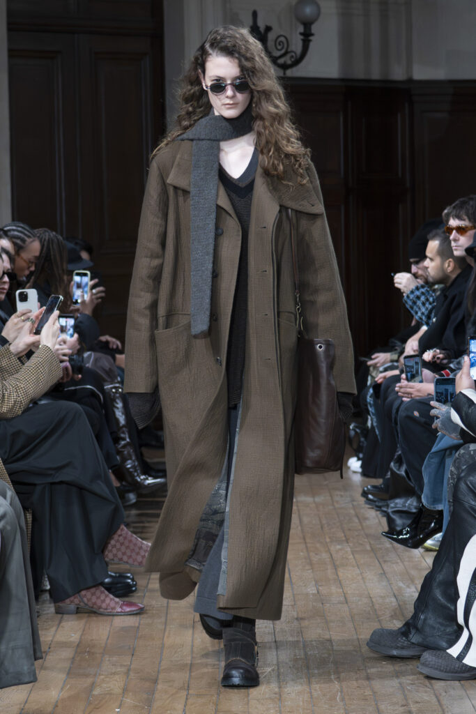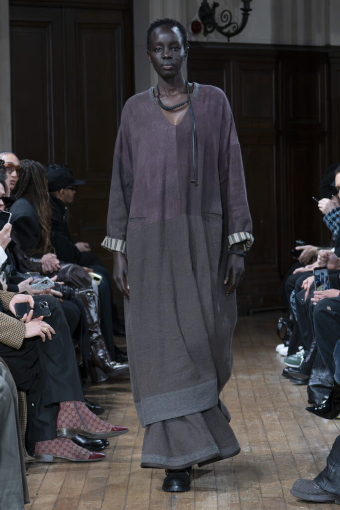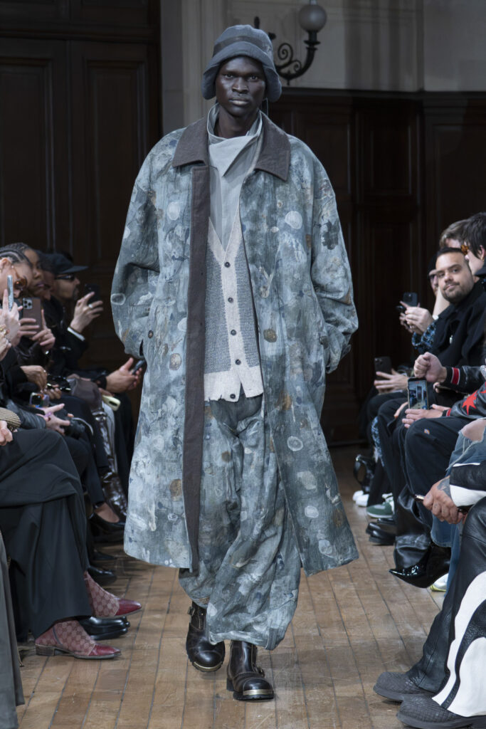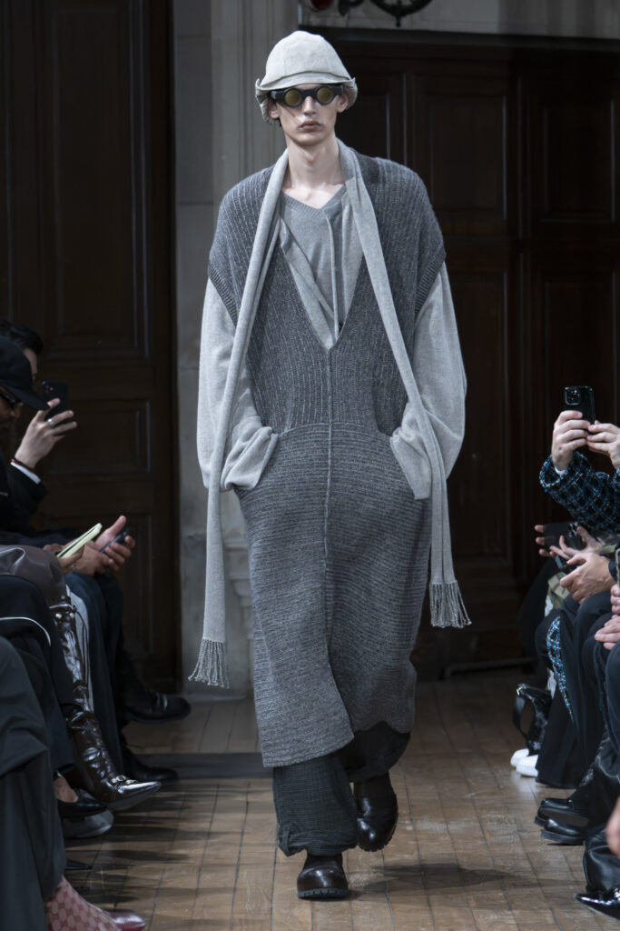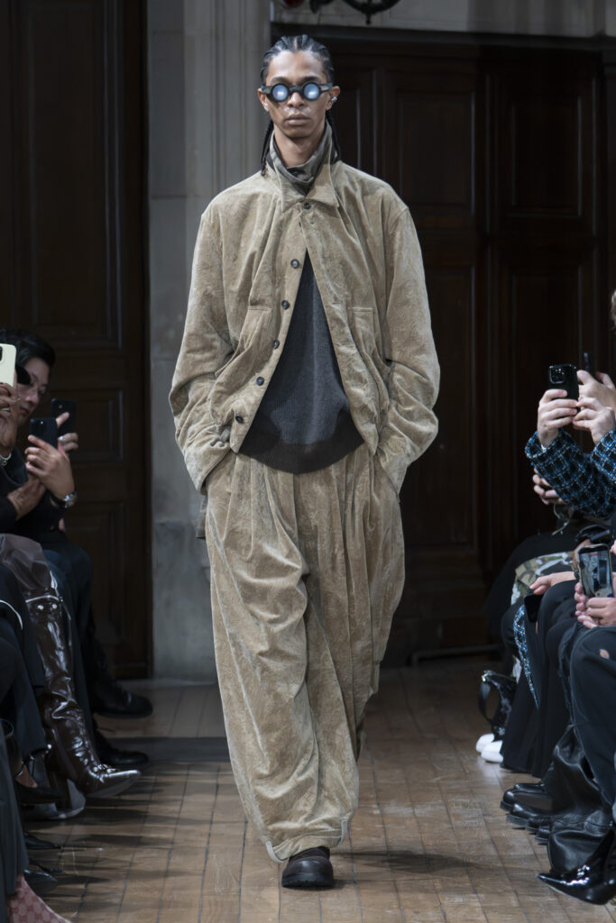 La sélection des matières confirme l’obsession de Chen pour une naturalité brute. Laine, cachemire, chanvre, lin et soie composent une main complexe, où la préciosité de la fibre s’efface devant la texture. Le créateur utilise des fils irréguliers et des bouclés pour préserver les traces du processus de fabrication. Ici, l’imperfection technique — une variation de tension, un fil flammé — n’est ni masquée ni corrigée ; elle est élevée au rang de caractéristique esthétique.