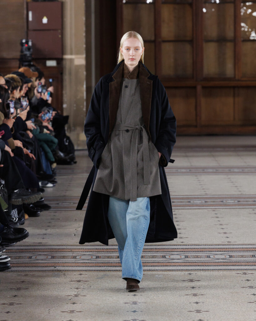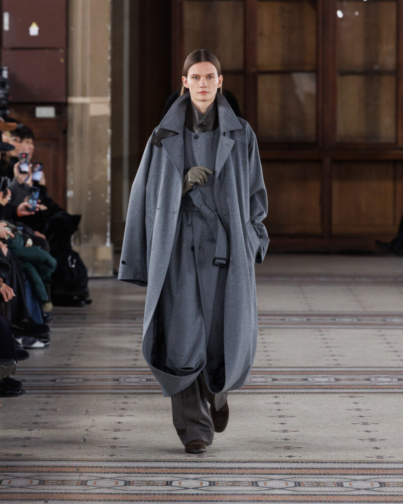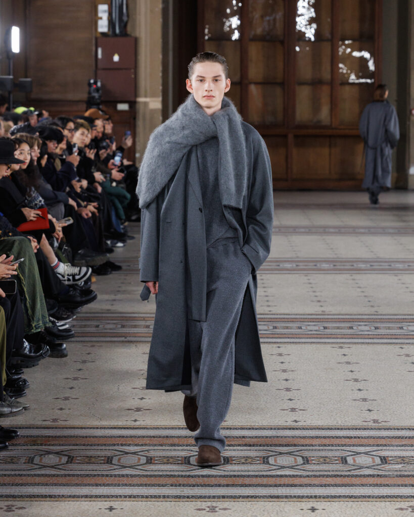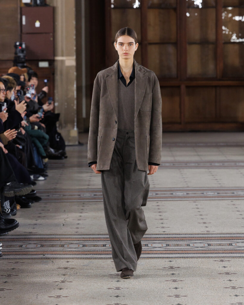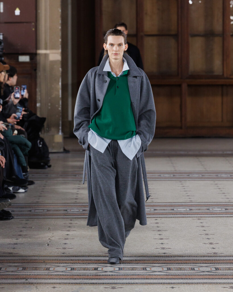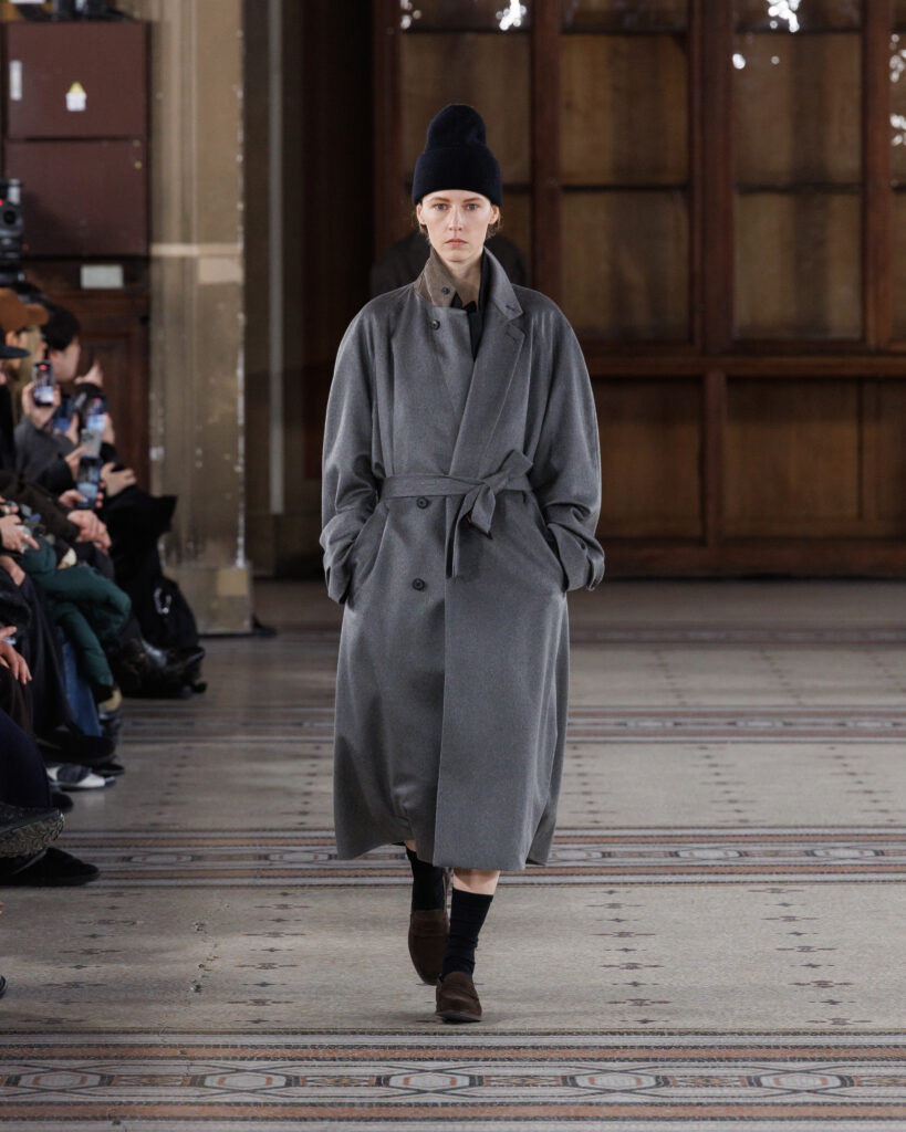 Le manteau gris, pièce centrale, illustre cette technicité invisible. Tissé sur des métiers à navette lents — seuls capables d’emprisonner autant d’air dans la fibre — la flanelle acquiert une texture presque fondante, légèrement feutrée. La fermeture décalée, qualifiée de « Chesterfield déconstruit », n’est pas un artifice de style mais une étude de volume.