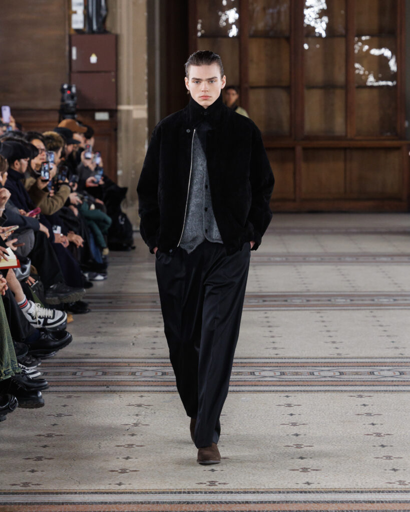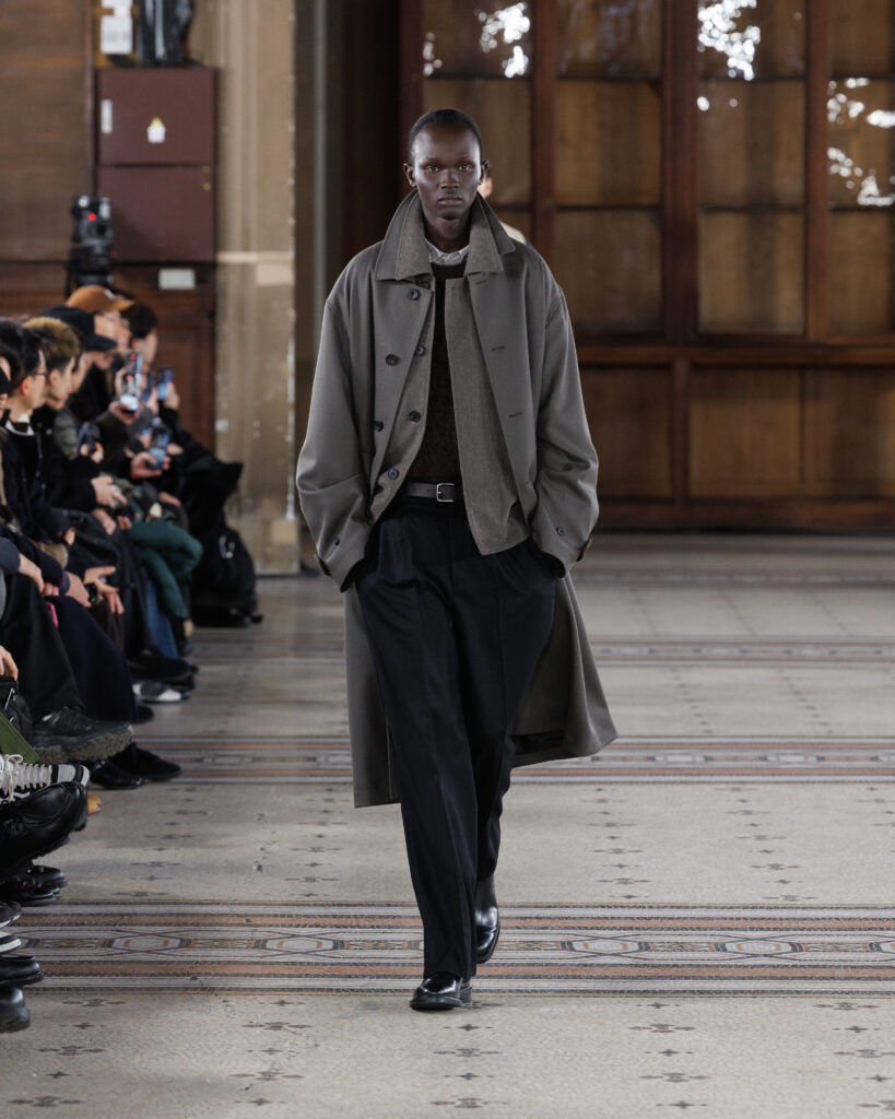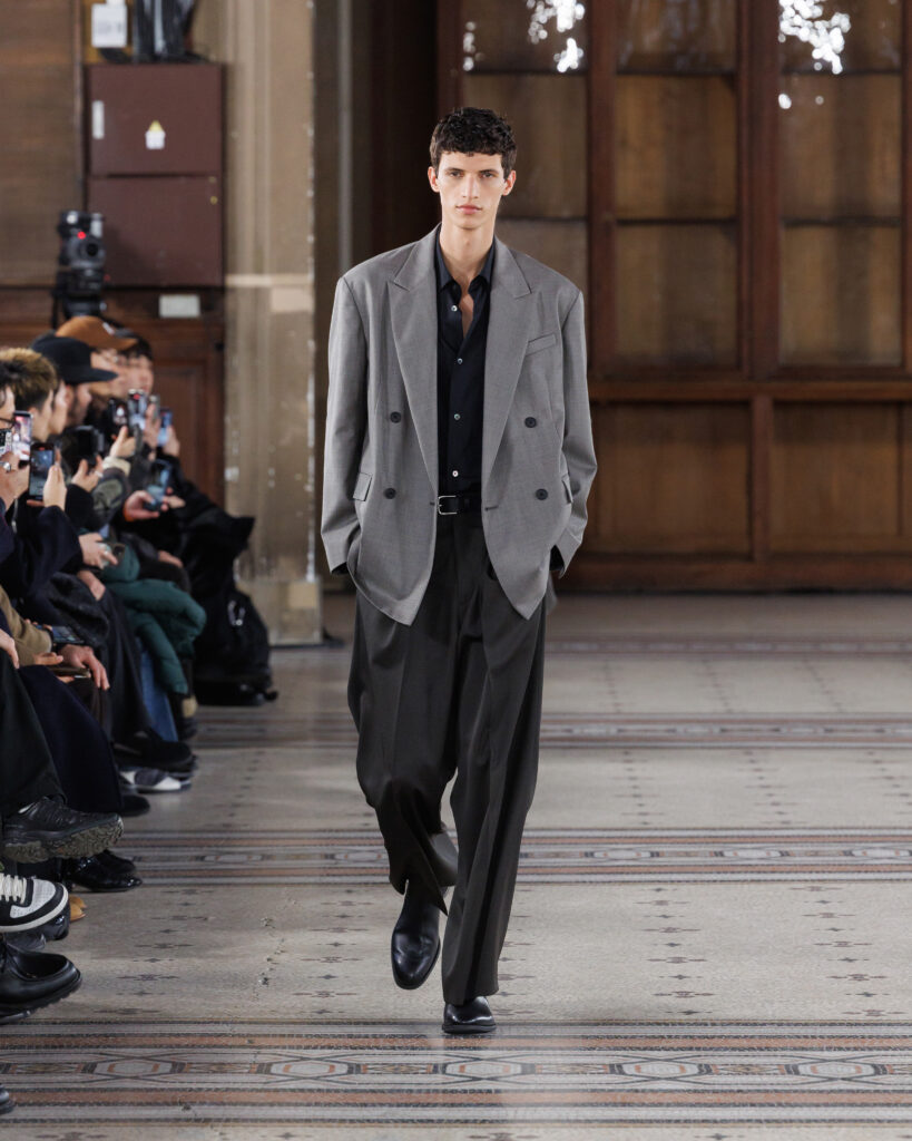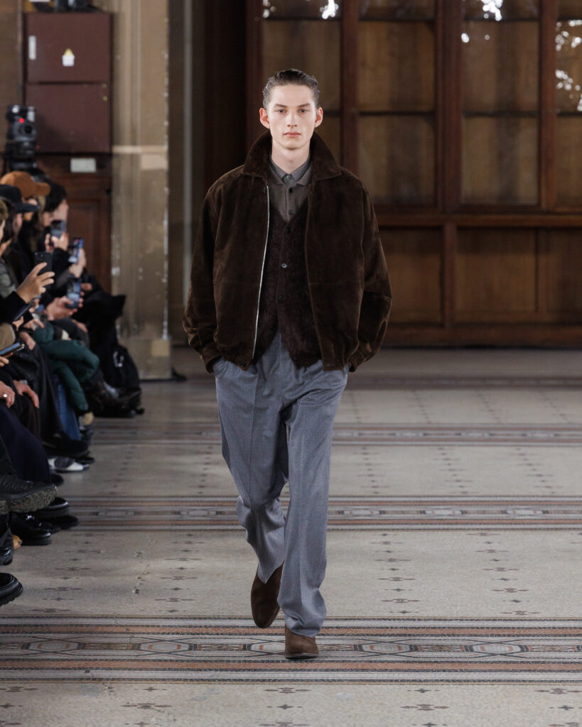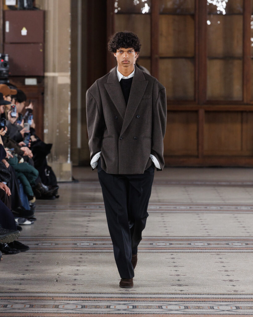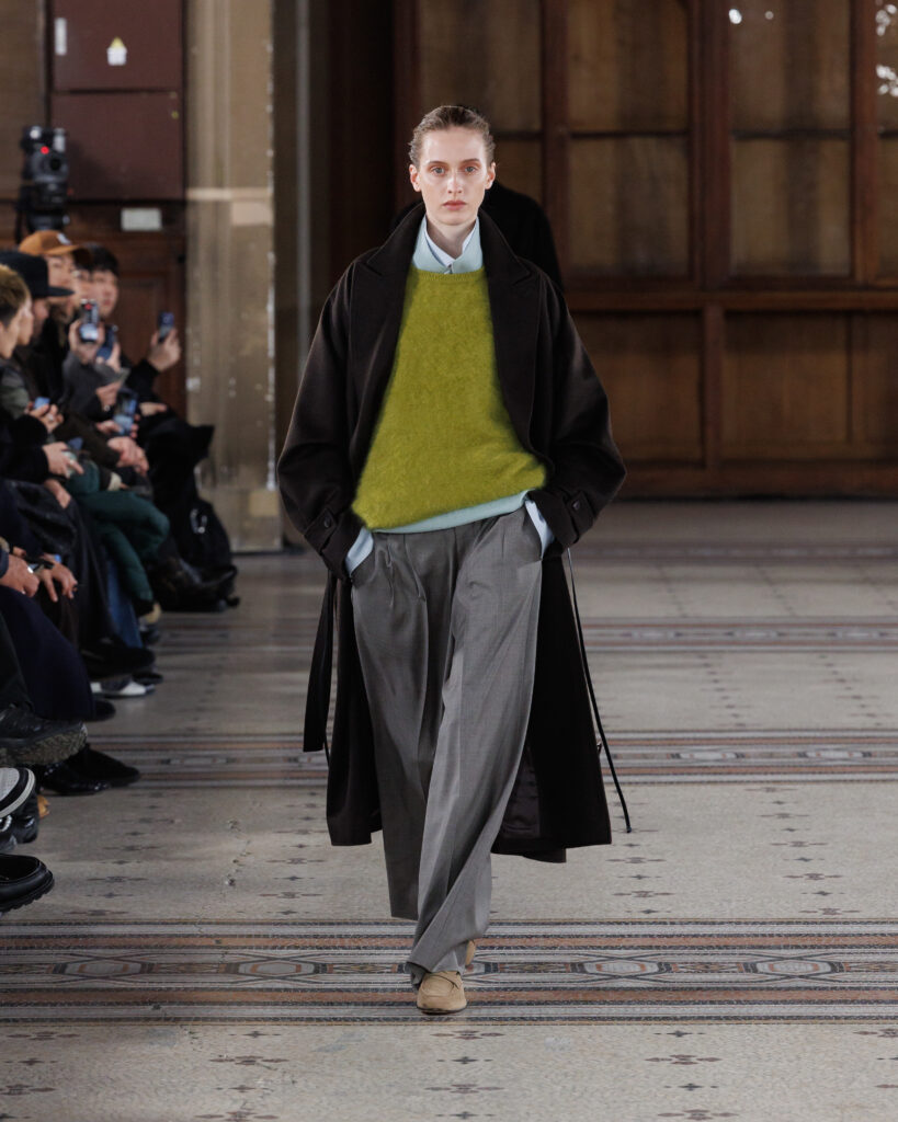 Le manteau gris, pièce centrale, illustre cette technicité invisible. Tissé sur des métiers à navette lents — seuls capables d’emprisonner autant d’air dans la fibre — la flanelle acquiert une texture presque fondante, légèrement feutrée. La fermeture décalée, qualifiée de « Chesterfield déconstruit », n’est pas un artifice de style mais une étude de volume.