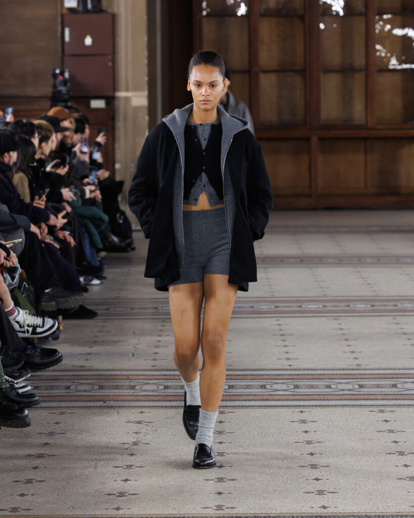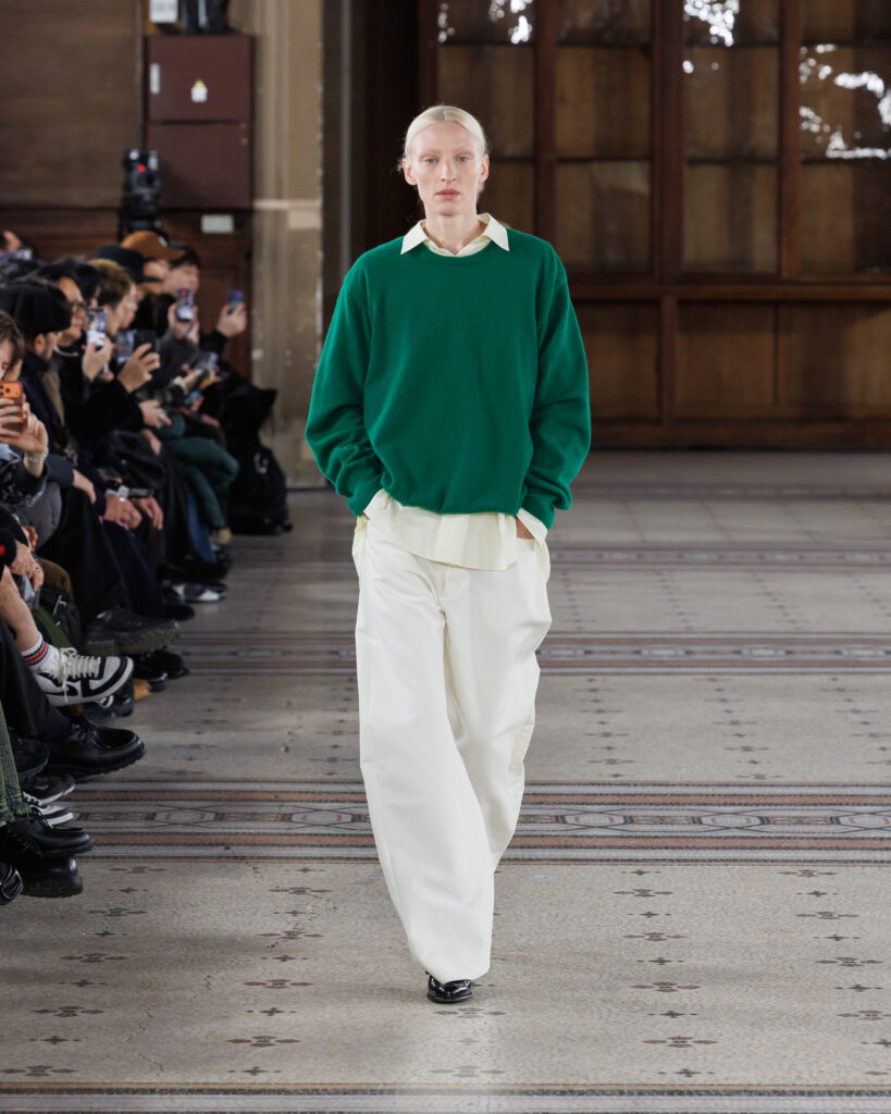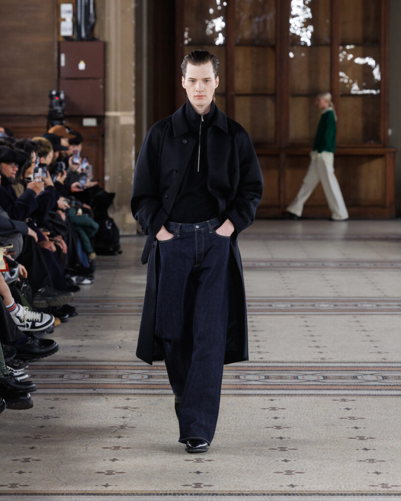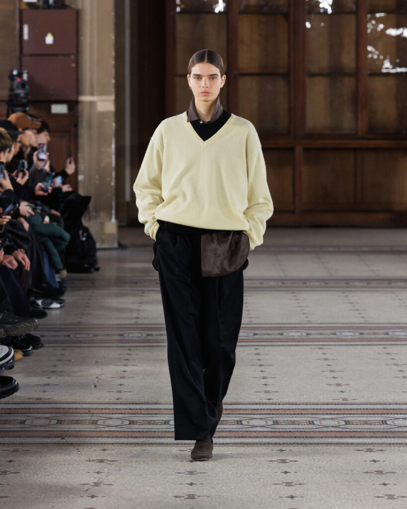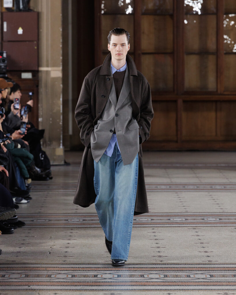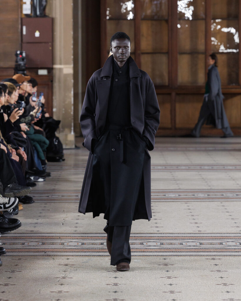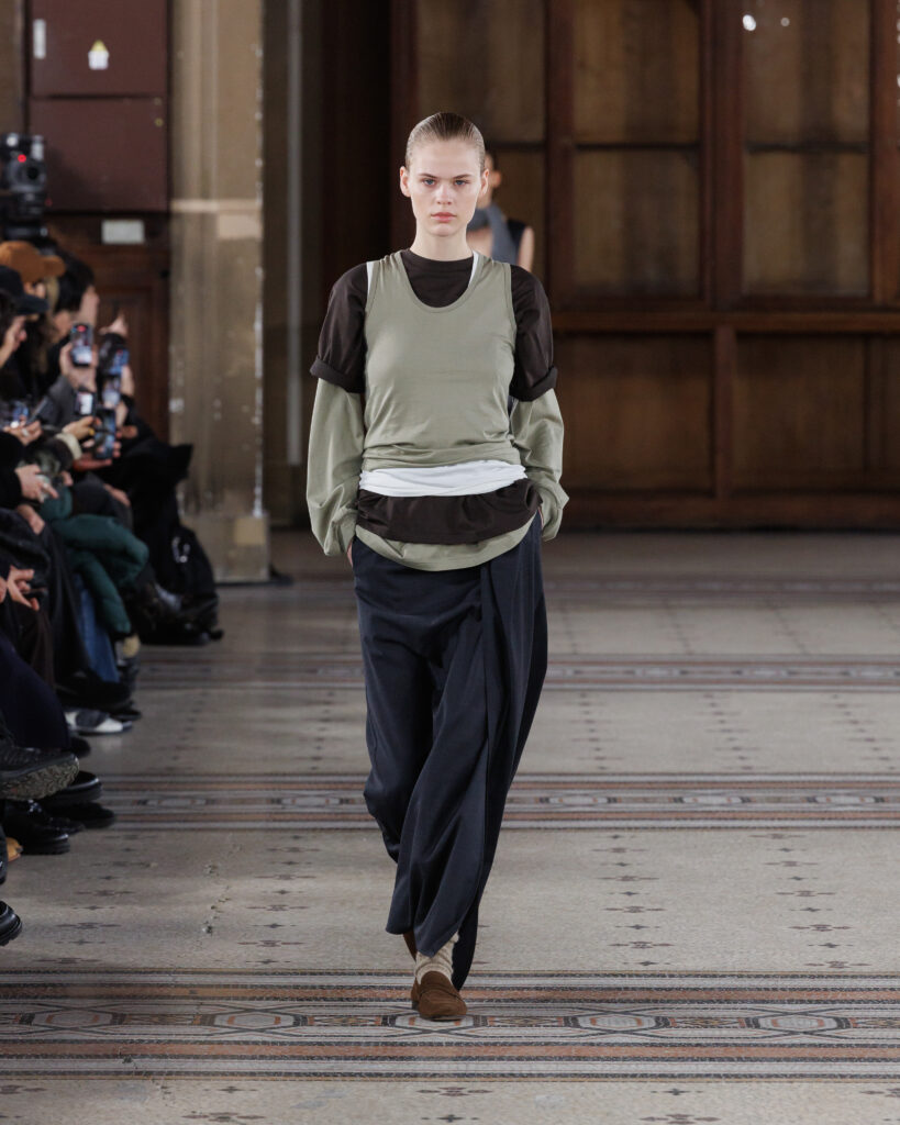 Cette saison marque aussi une ouverture subtile vers le vestiaire féminin — ou plutôt, une dissolution des frontières, avec des pièces en taille XS et des jupes maxi deux voies qui suggèrent que le « calme » d’Asakawa est universel.