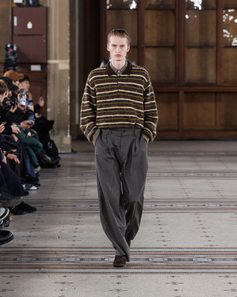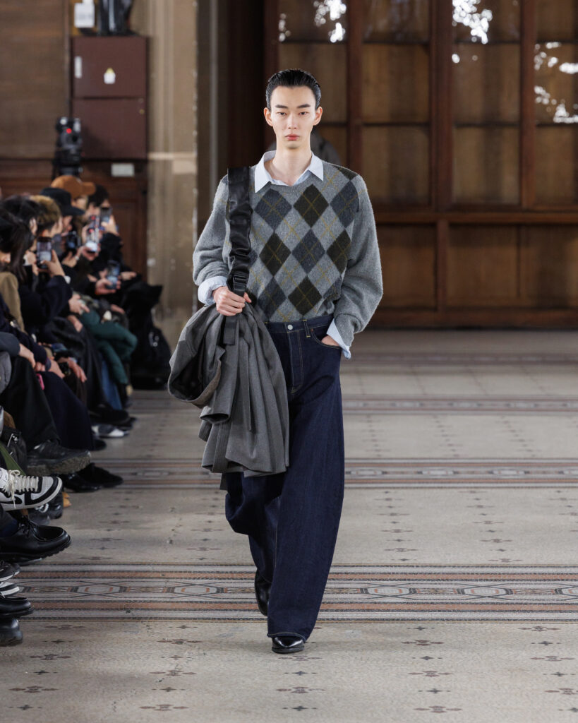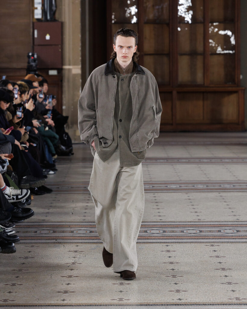 La main d’Asakawa, autodidacte formé à l’école du vêtement vintage chez Naichichi, se lit dans la manipulation obsessionnelle de la matière. La collection Automne-Hiver 2026-2027 ne se regarde pas, elle se touche. Le créateur déploie des tweeds à tissage souple (« soft-loom ») et des velours côtelés dont l’irrégularité chromatique est obtenue par séchage au soleil après teinture.