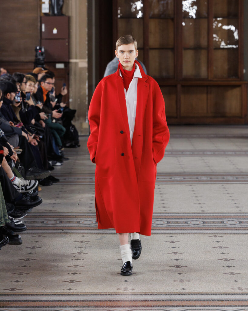 Le « Geste » Luxsure réside ici dans ce que l’œil ne perçoit pas immédiatement. Sur un blouson rouge en laine et cachemire, Asakawa utilise une technique de « hand-stitch scooping ». L’aiguille ne saisit que la couche interne du tissu double, rendant la couture totalement invisible en surface. Ce refus de la démonstration technique apparente est la signature d’une Maison qui préfère la construction à la décoration.