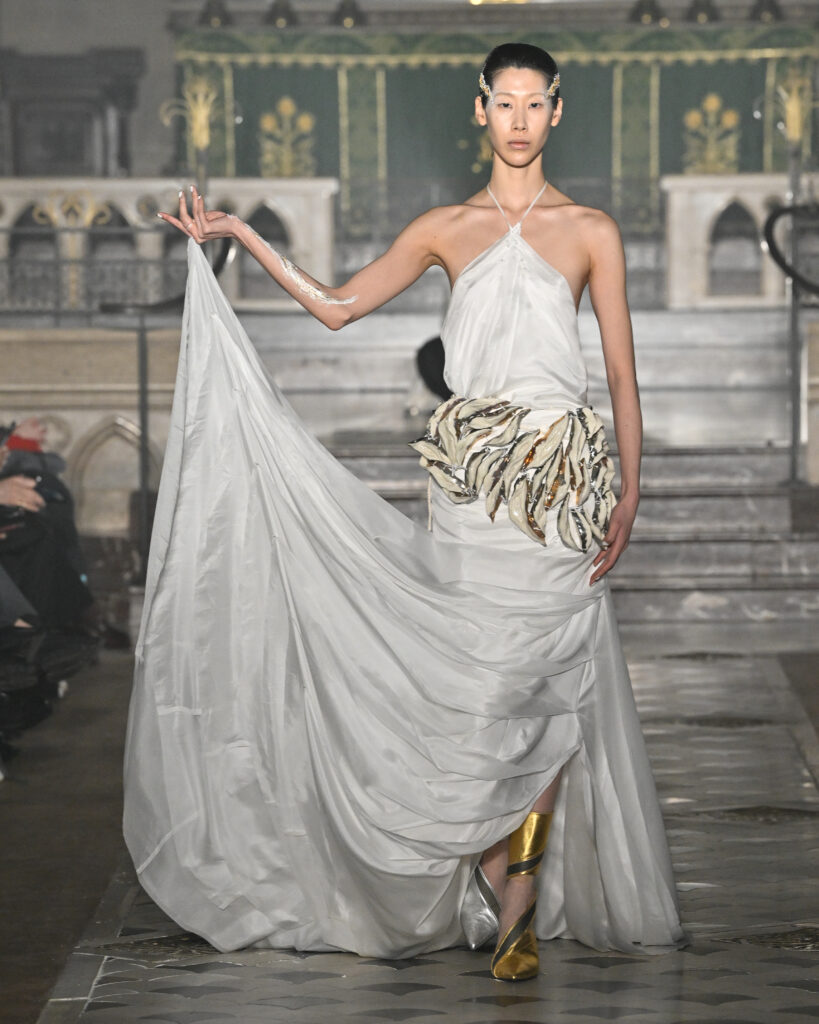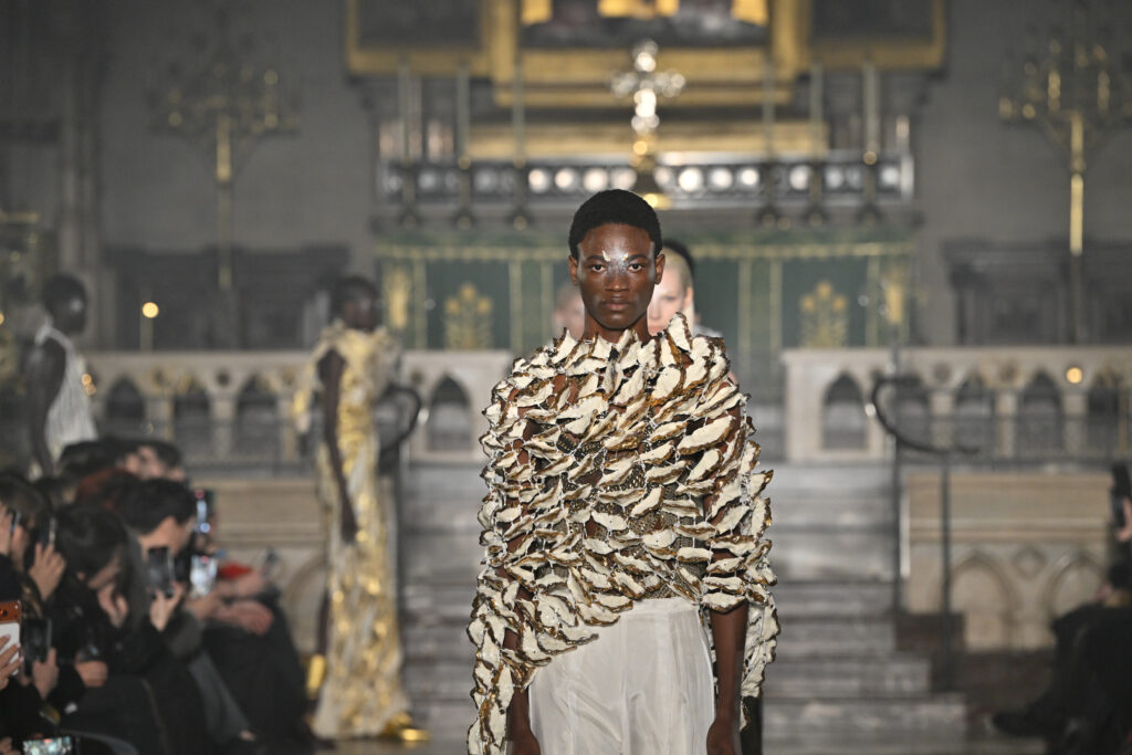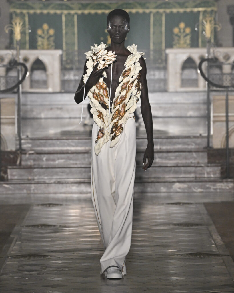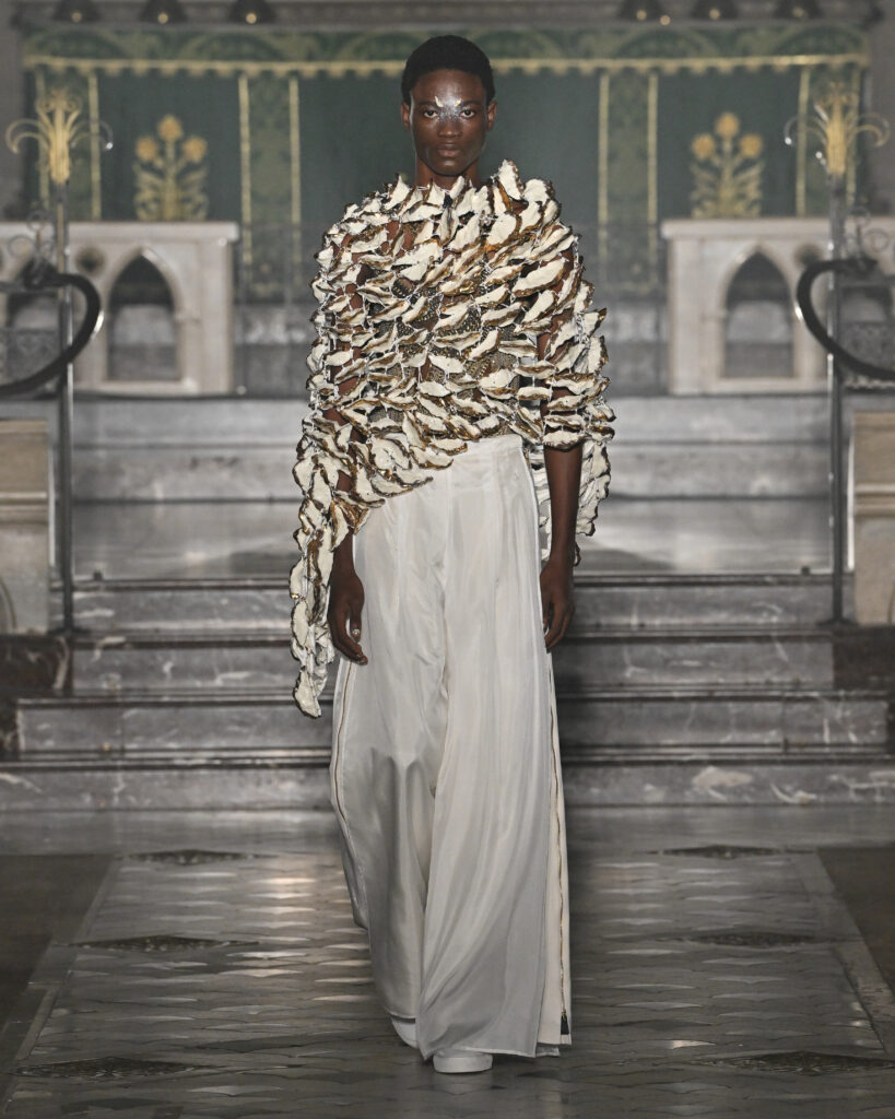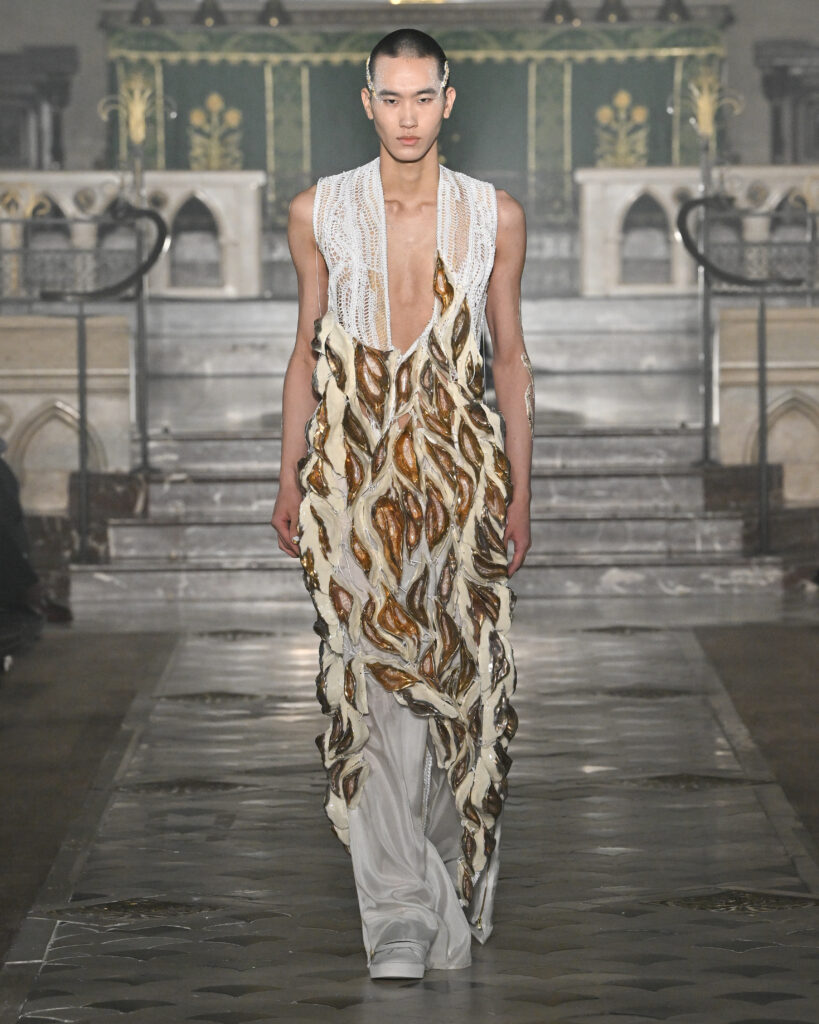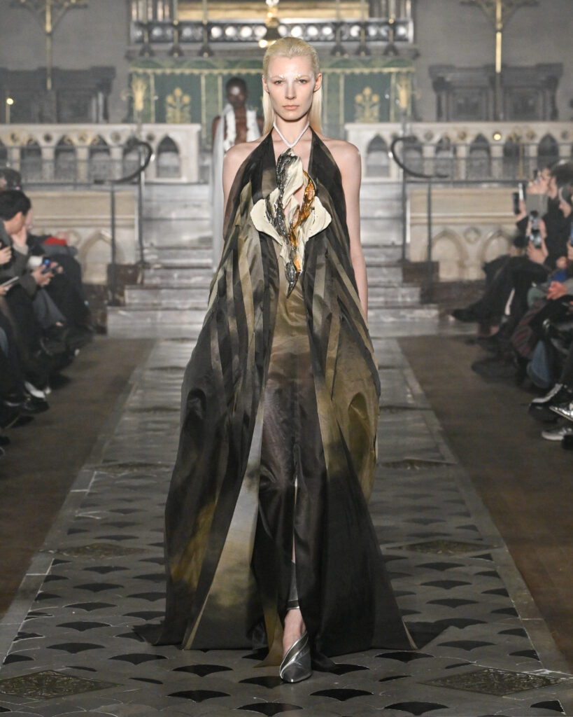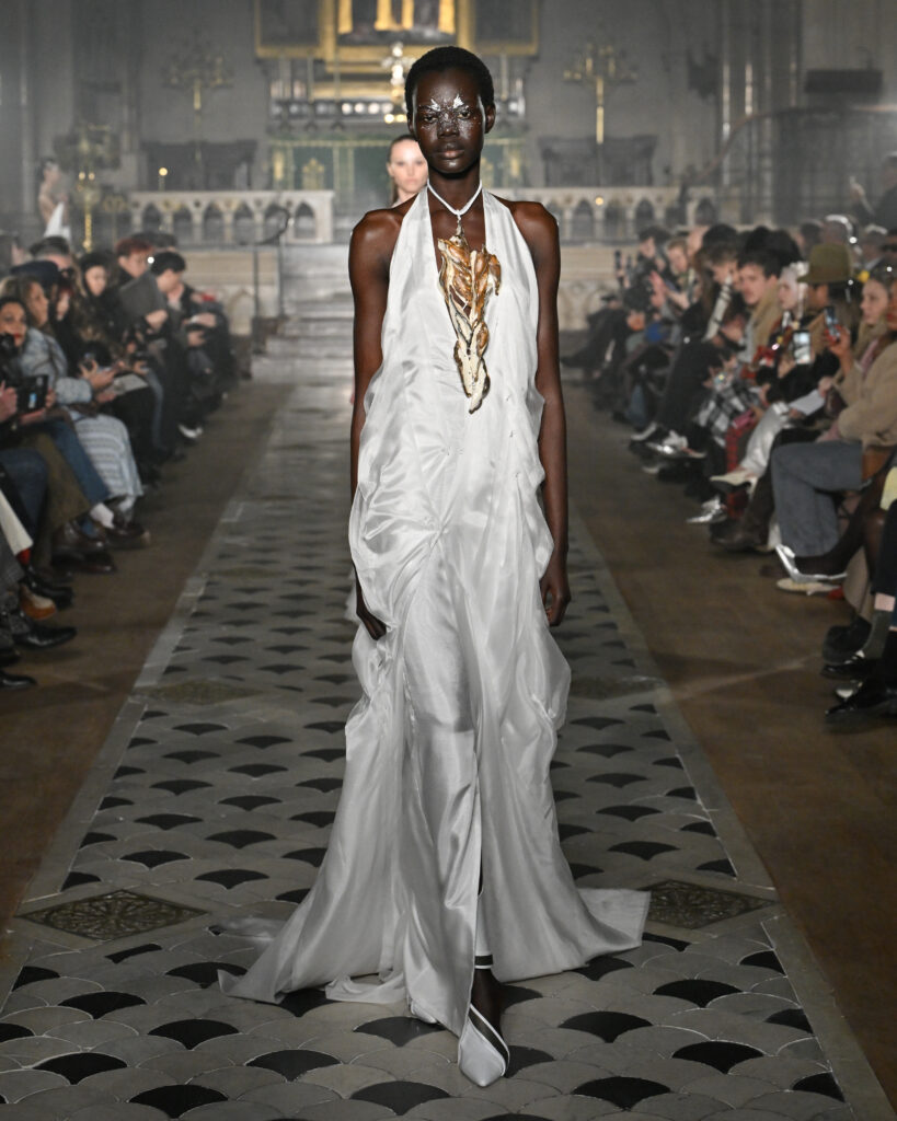 C’est le choix le plus radical de la collection. Pas de bande sonore. Le défilé, présenté le 28 janvier 2026 à la Cathédrale américaine de Paris, dure quinze minutes pendant lesquelles le seul son est celui de la céramique qui oscille au rythme de la marche. Nakazato le décrit comme « the sound of the earth itself, as if awakening memories from the time when soil first came into being on this planet ».