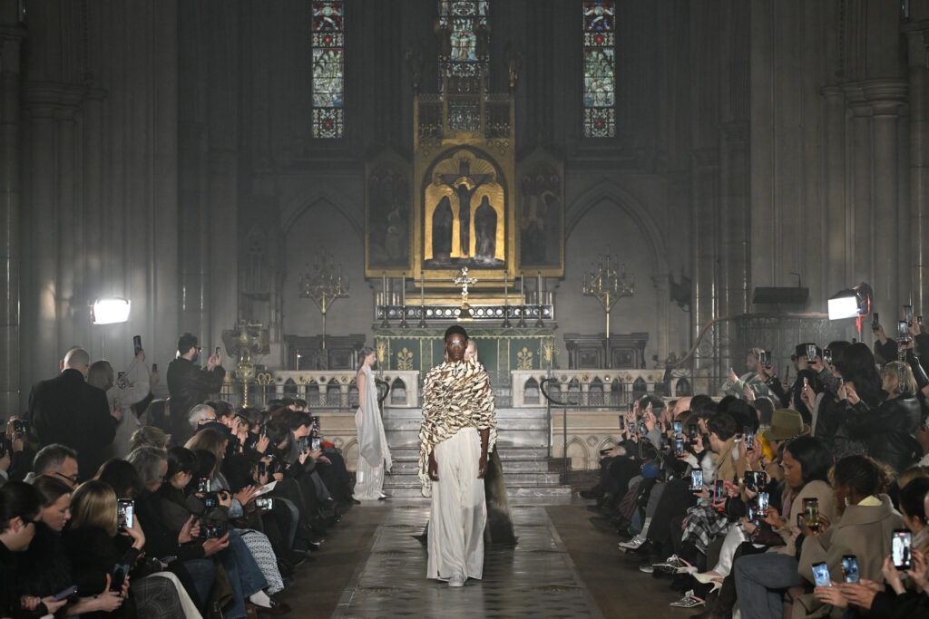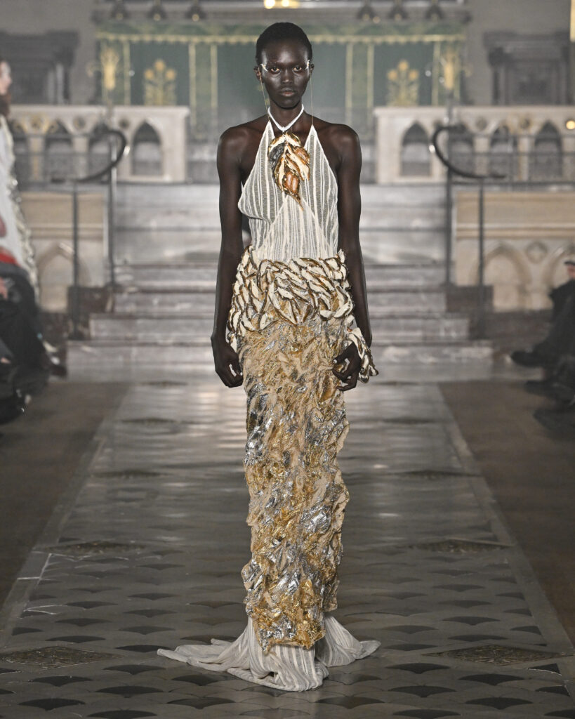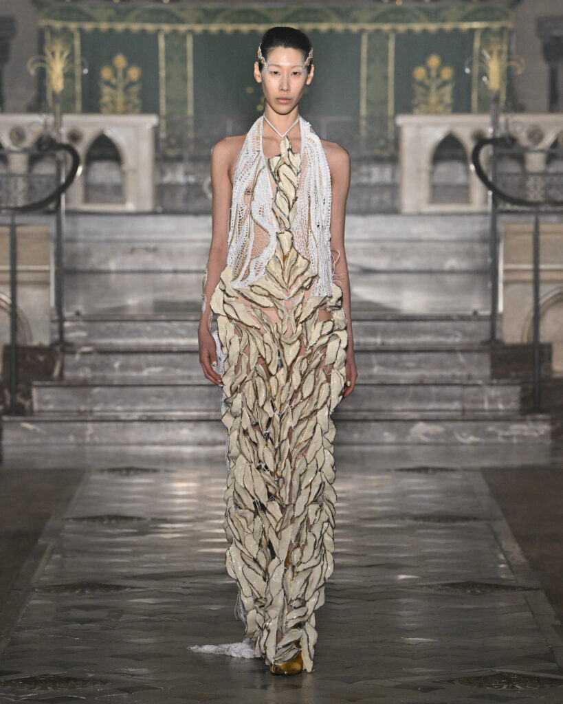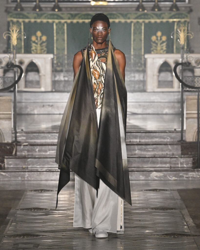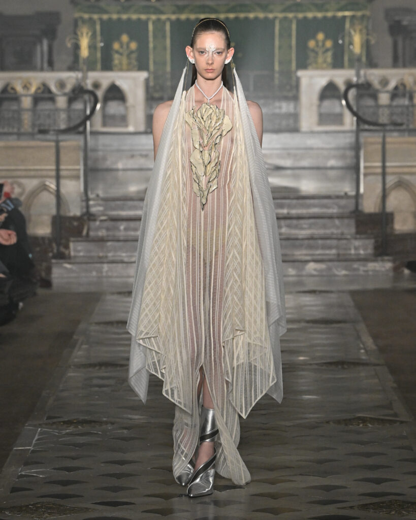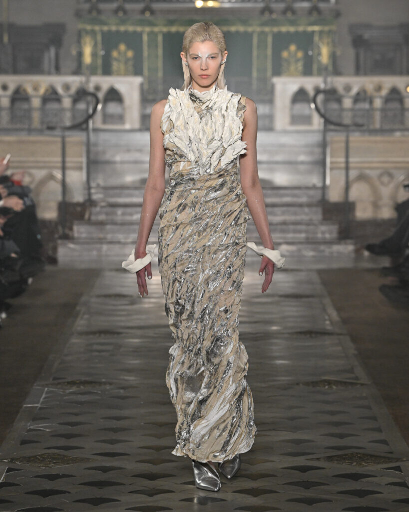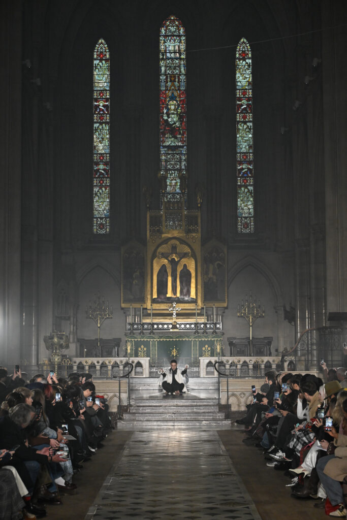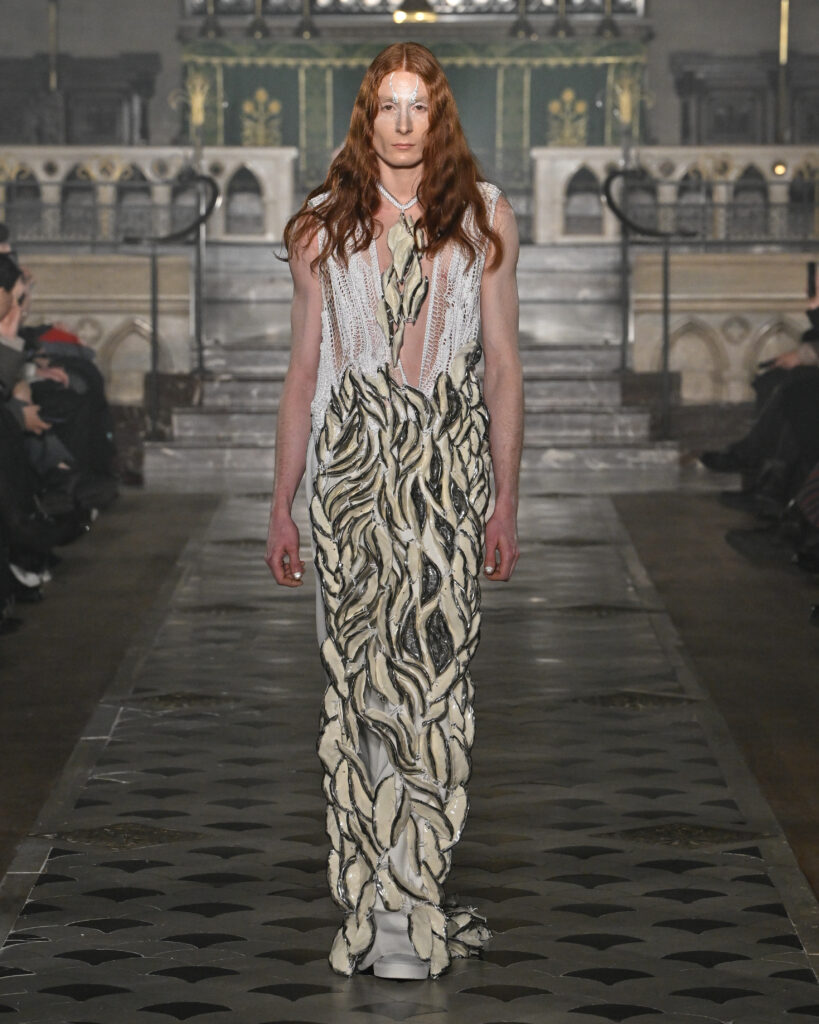 C’est le choix le plus radical de la collection. Pas de bande sonore. Le défilé, présenté le 28 janvier 2026 à la Cathédrale américaine de Paris, dure quinze minutes pendant lesquelles le seul son est celui de la céramique qui oscille au rythme de la marche. Nakazato le décrit comme « the sound of the earth itself, as if awakening memories from the time when soil first came into being on this planet ».