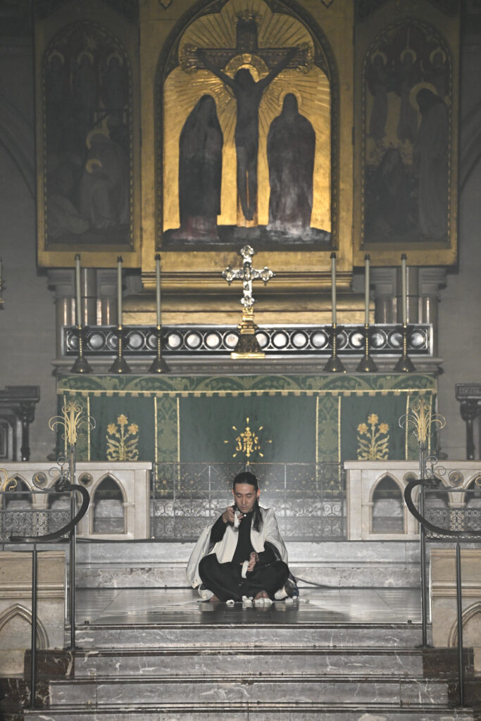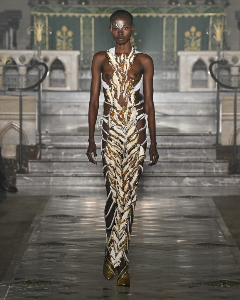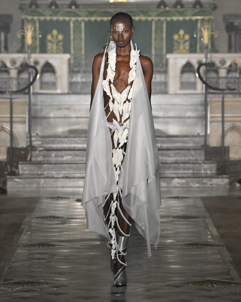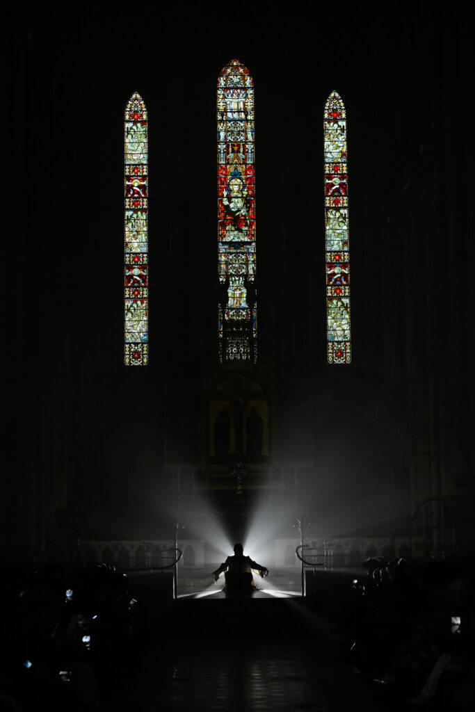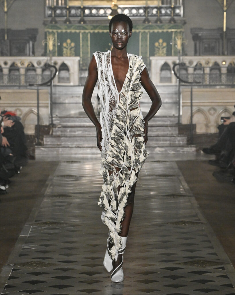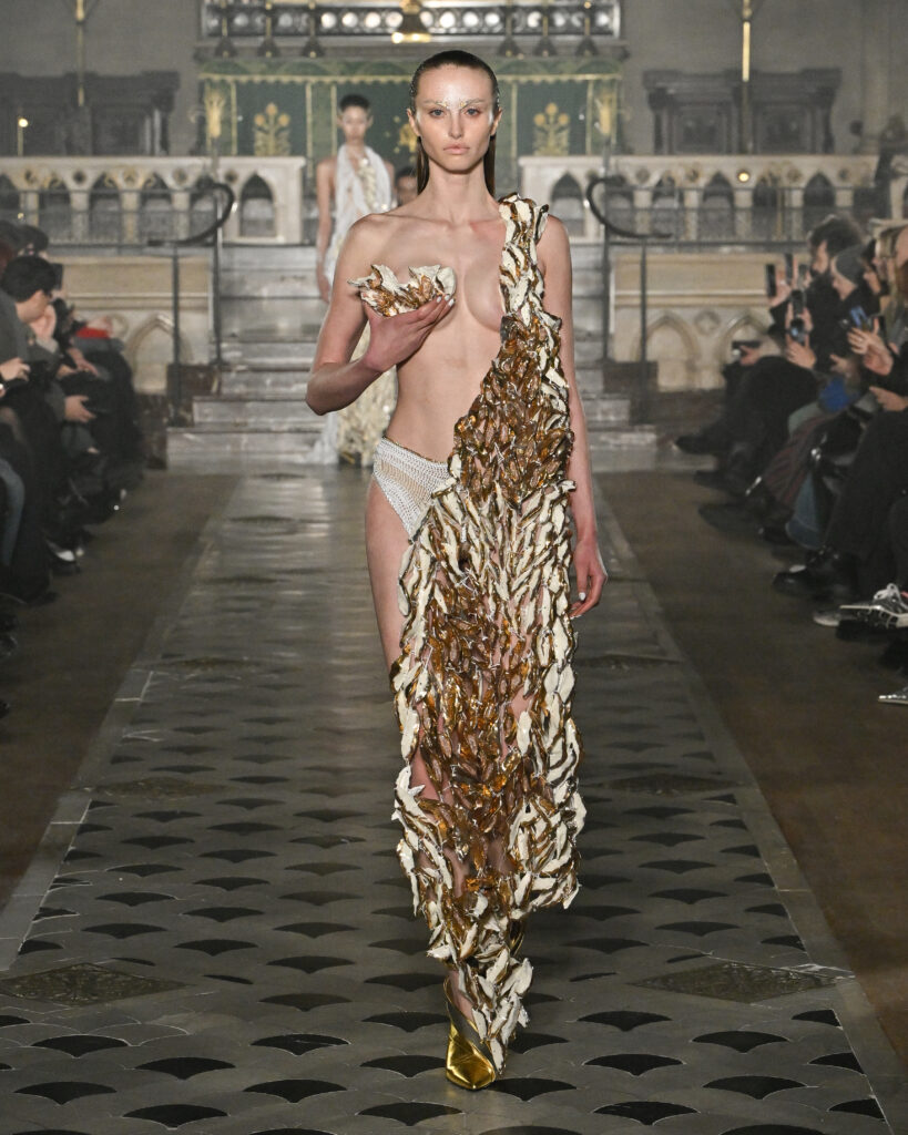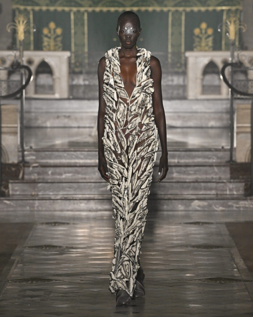 C’est le choix le plus radical de la collection. Pas de bande sonore. Le défilé, présenté le 28 janvier 2026 à la Cathédrale américaine de Paris, dure quinze minutes pendant lesquelles le seul son est celui de la céramique qui oscille au rythme de la marche. Nakazato le décrit comme « the sound of the earth itself, as if awakening memories from the time when soil first came into being on this planet ».