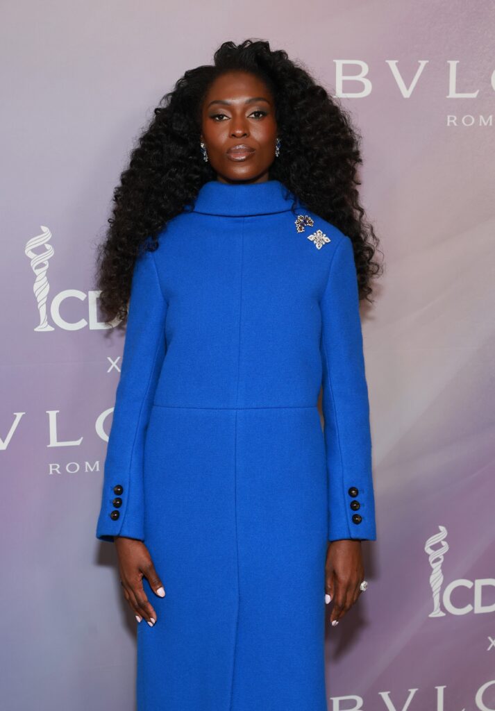L’actrice Jodie Turner-Smith opère un contrepoint chromatique en privilégiant le volume et la saturation. Elle réhabilite la broche — accessoire d’architecture par excellence — ici sertie d’émeraudes et de diamants taille « step cut » (taille à degrés), privilégiant la clarté de la ligne sur le feu de la pierre. Ses bagues affichent une complexité géologique notable : saphirs de taille coussin antique (8.81 cts) et tanzanites (7.15 cts). L’usage du saphir « antique cushion » évoque une taille ancienne, plus haute et moins facettée que les standards modernes, privilégiant la profondeur de la matière.