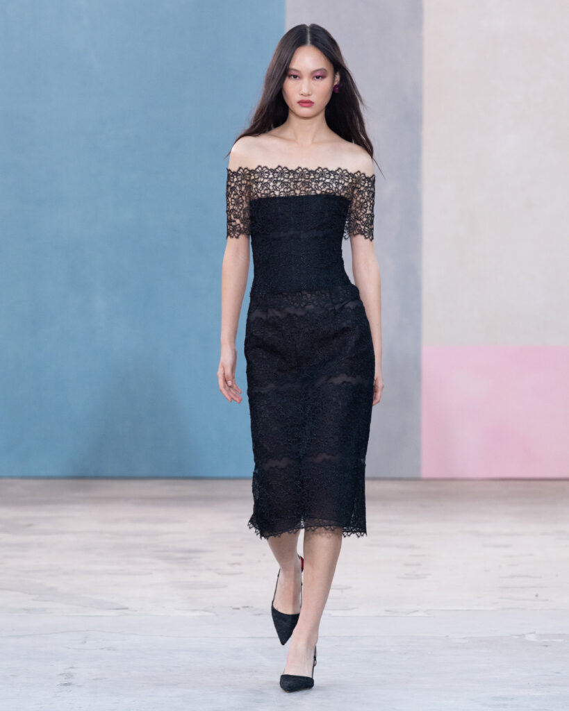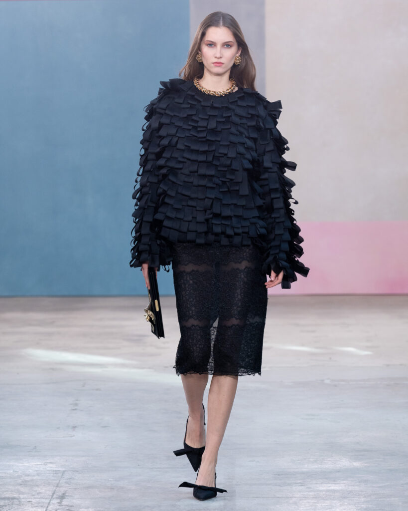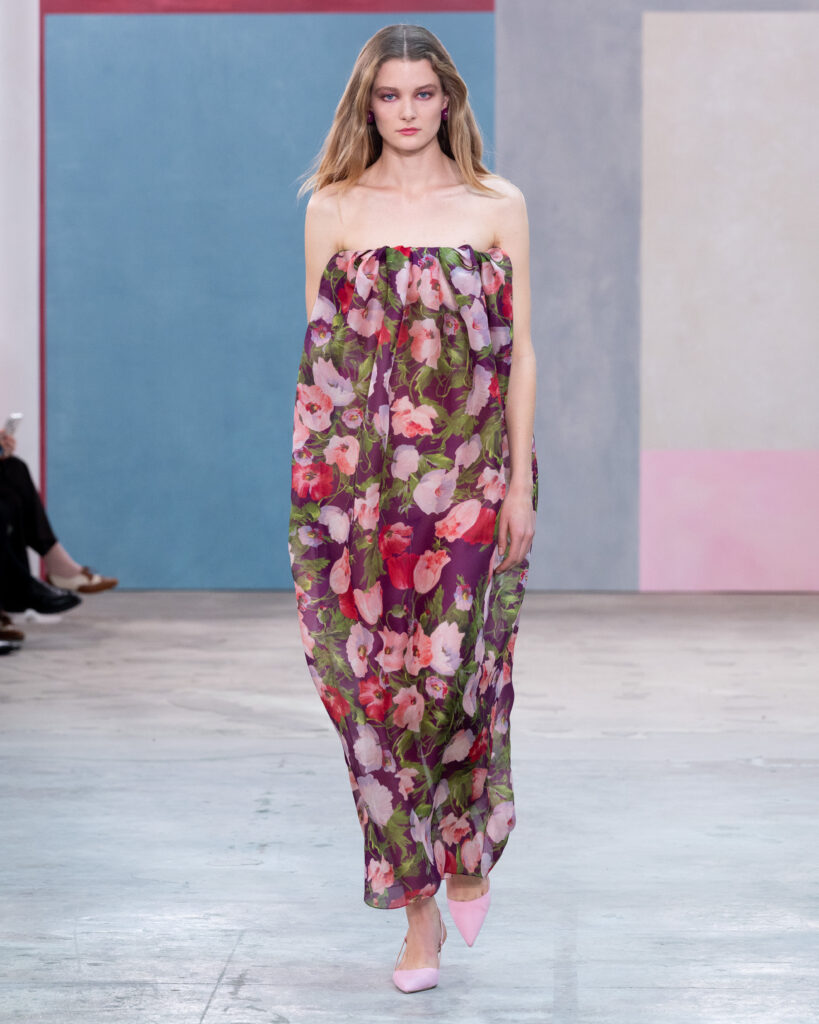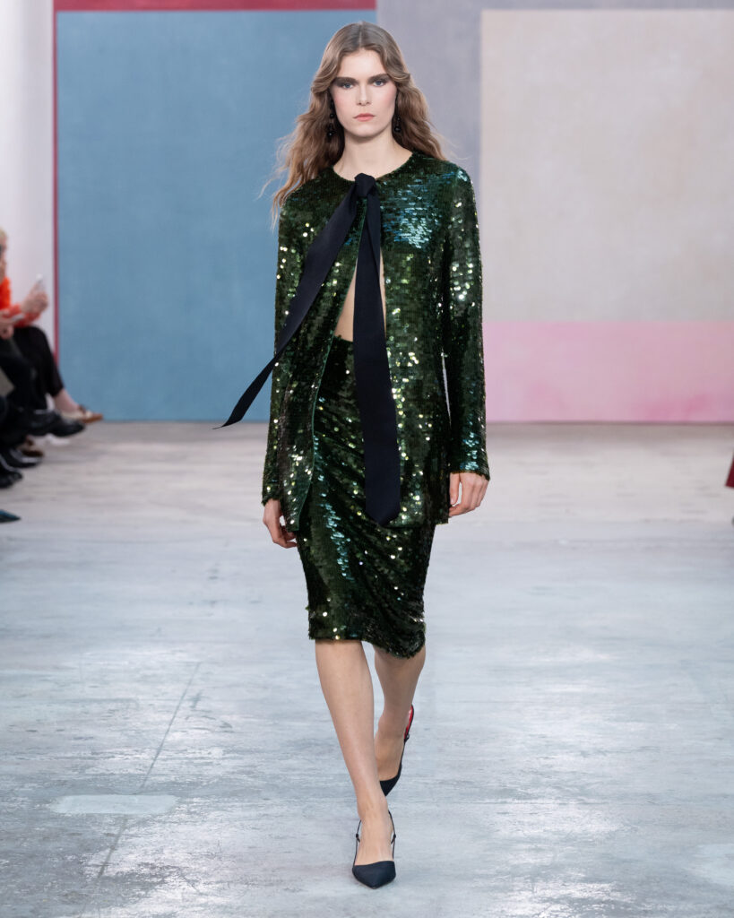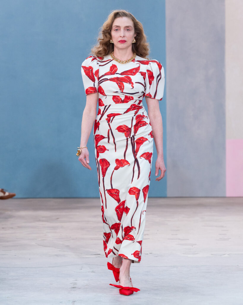 Pour l’Automne 2026, Wes Gordon opère un glissement sémantique notable. La femme Herrera ne se contente plus d’assister aux vernissages ; elle les organise. En faisant défiler les figures actives de l’art contemporain, la Maison définit l’uniforme de la puissance culturelle.