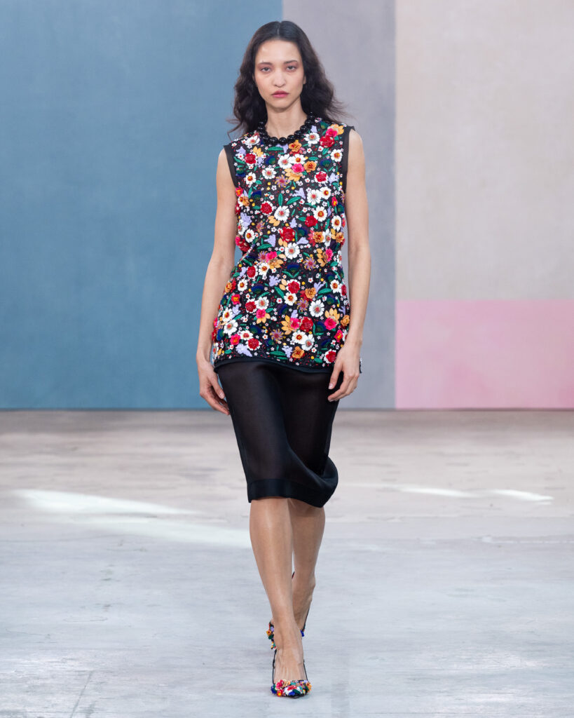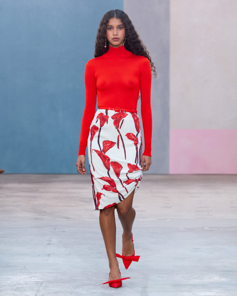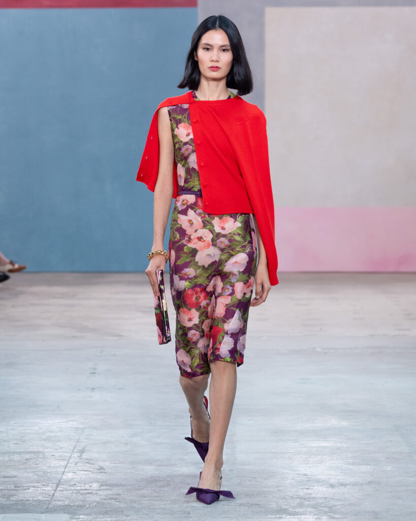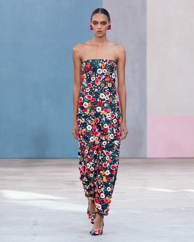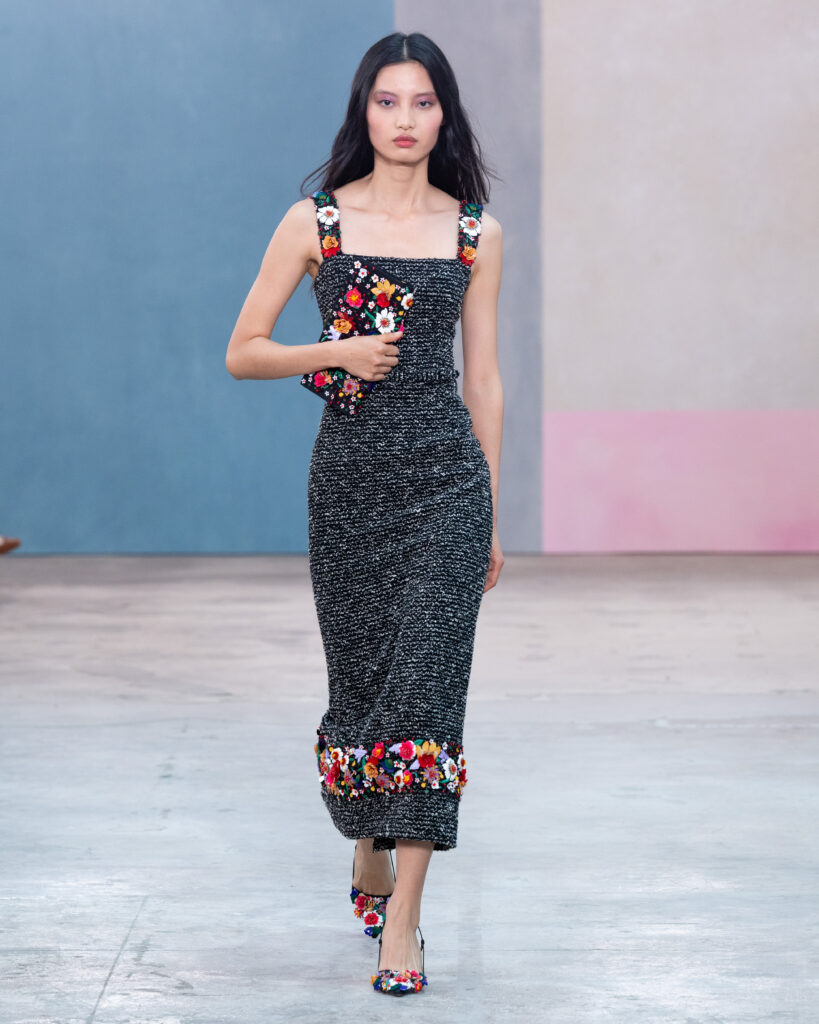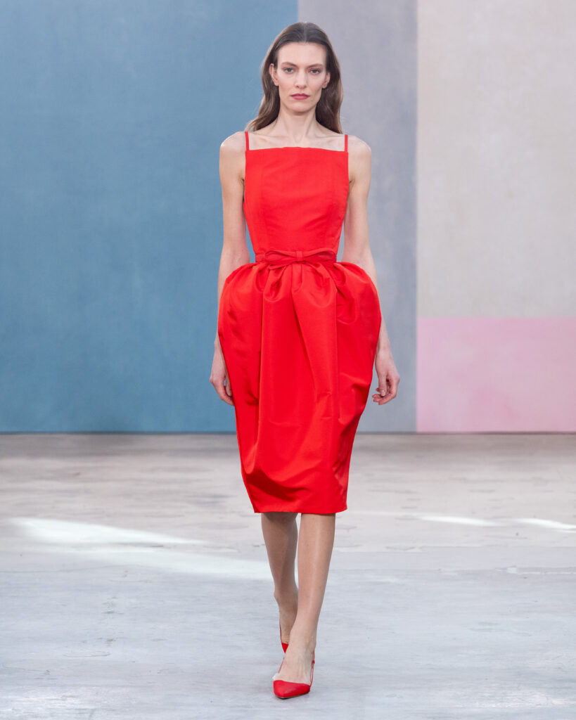 Pour l’Automne 2026, Wes Gordon opère un glissement sémantique notable. La femme Herrera ne se contente plus d’assister aux vernissages ; elle les organise. En faisant défiler les figures actives de l’art contemporain, la Maison définit l’uniforme de la puissance culturelle.