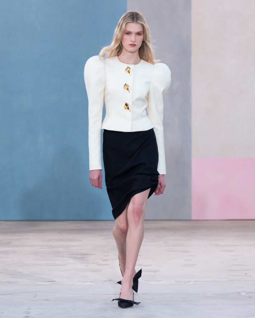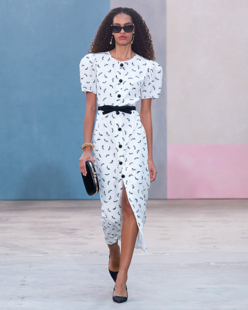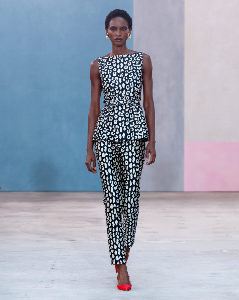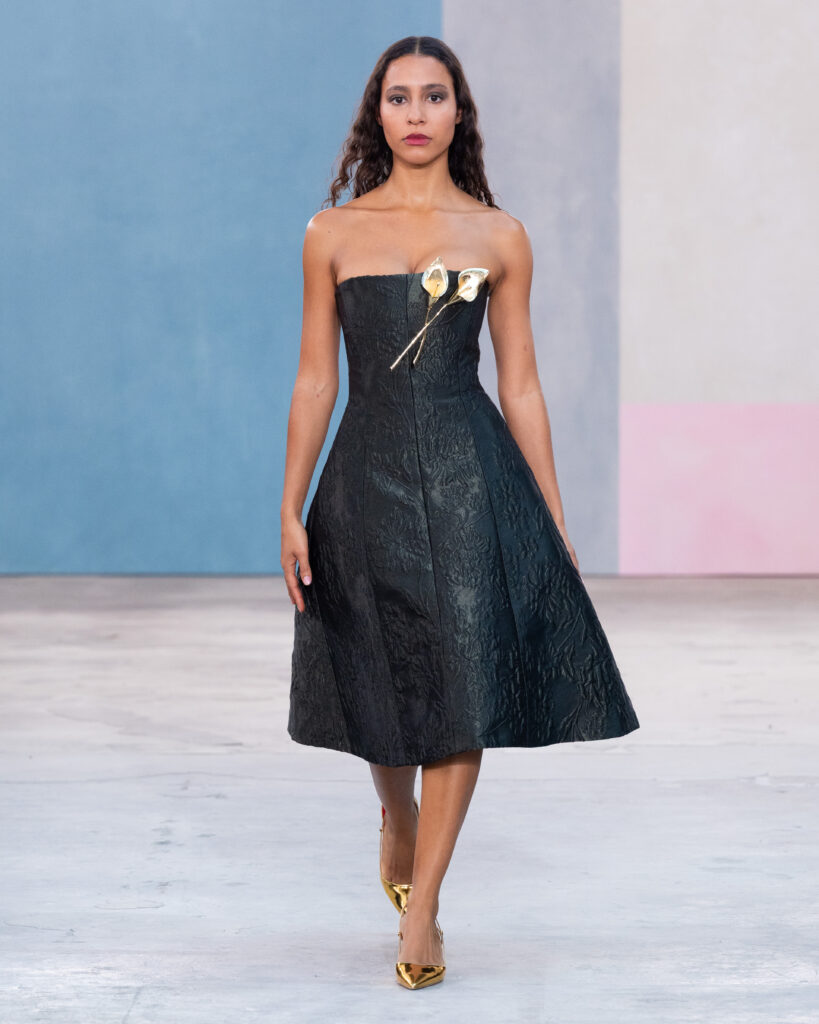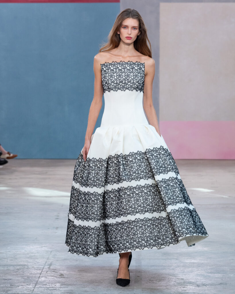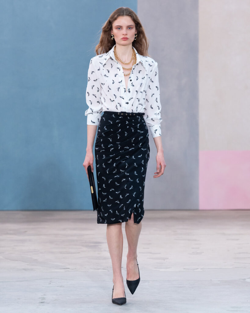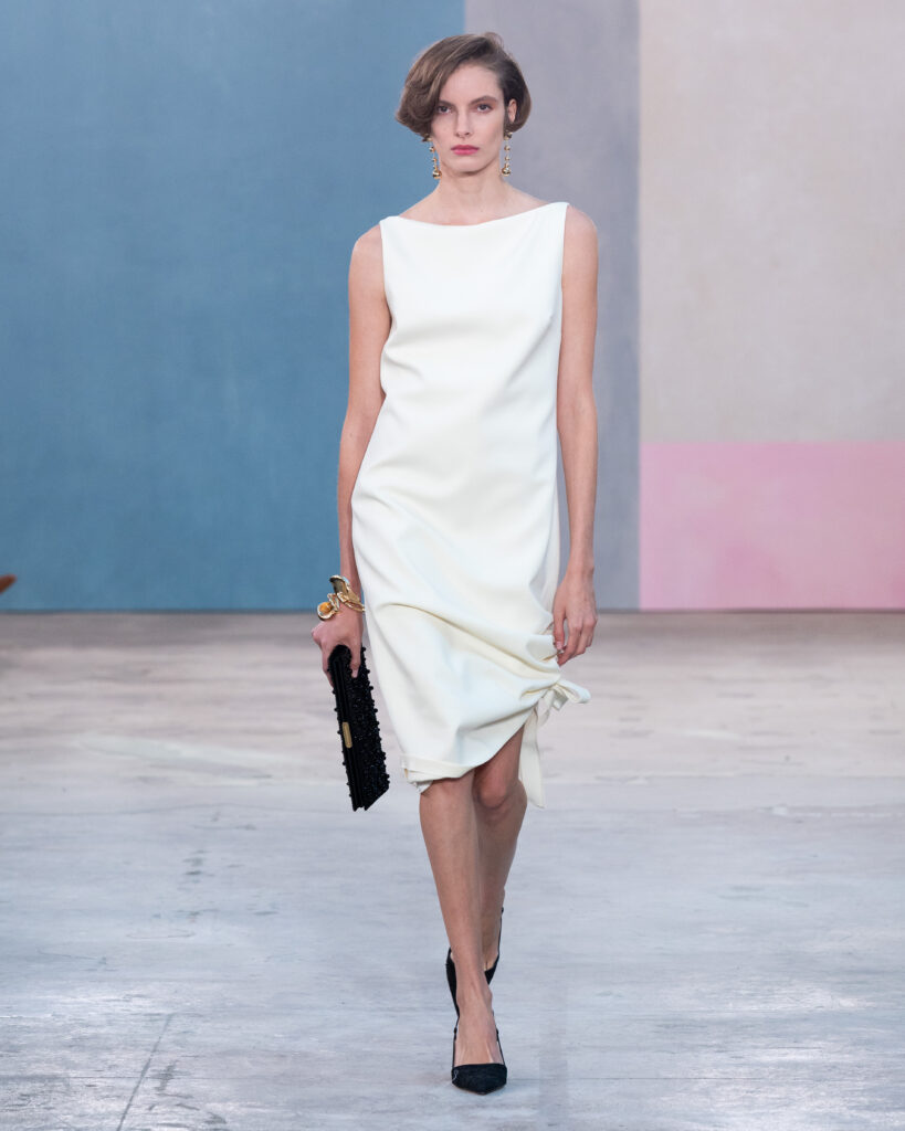 L’esthétique de la collection découle directement de cette posture. La chemise blanche en coton, code fondateur de Carolina Herrera, est ici déconstruite pour évoquer la blouse d’atelier. Elle gagne en volume, libère le mouvement, mais conserve une rigueur chromatique absolue, souvent traitée en noir et blanc.