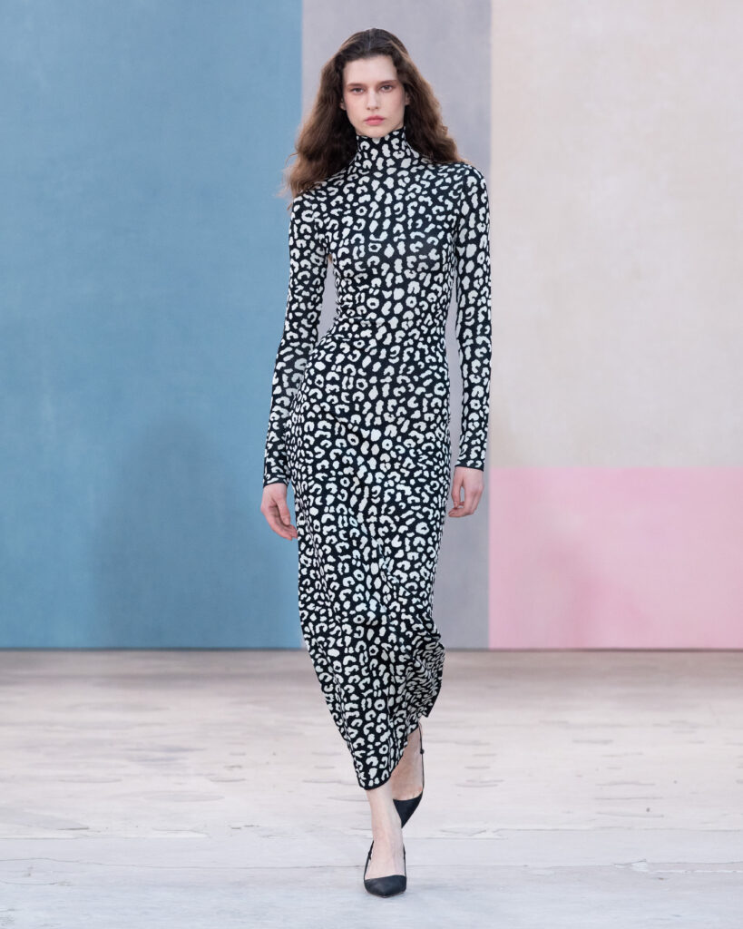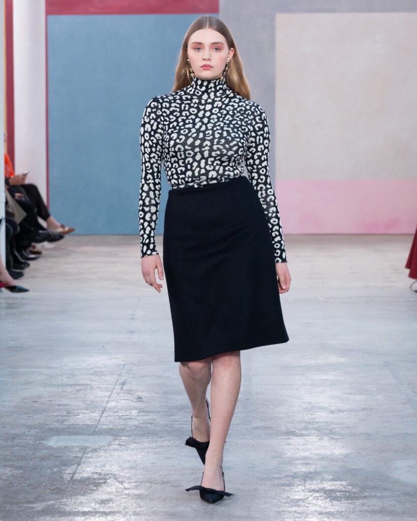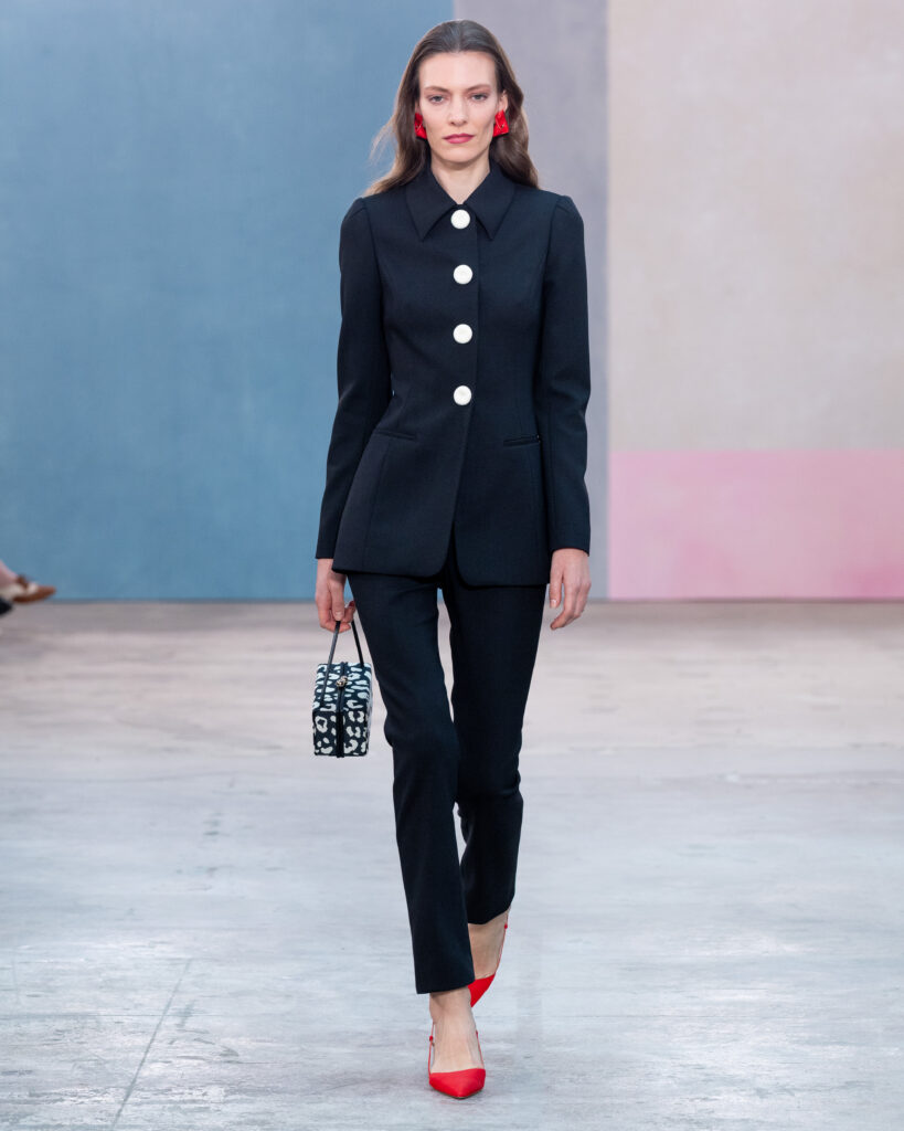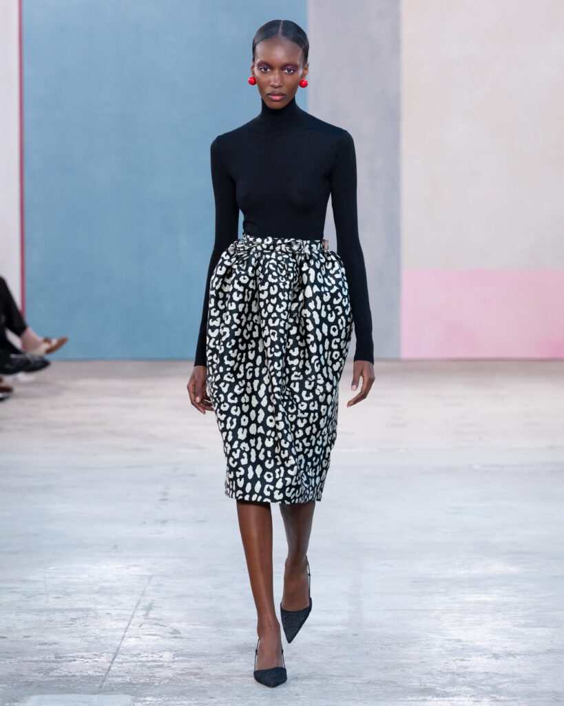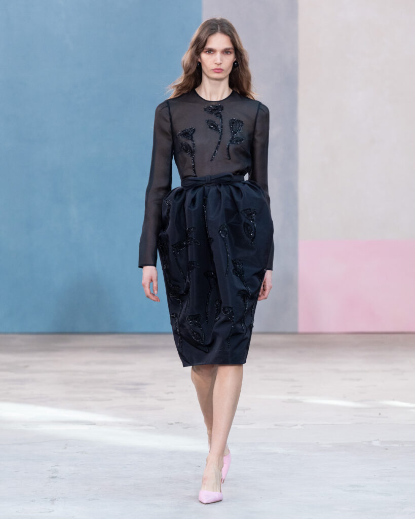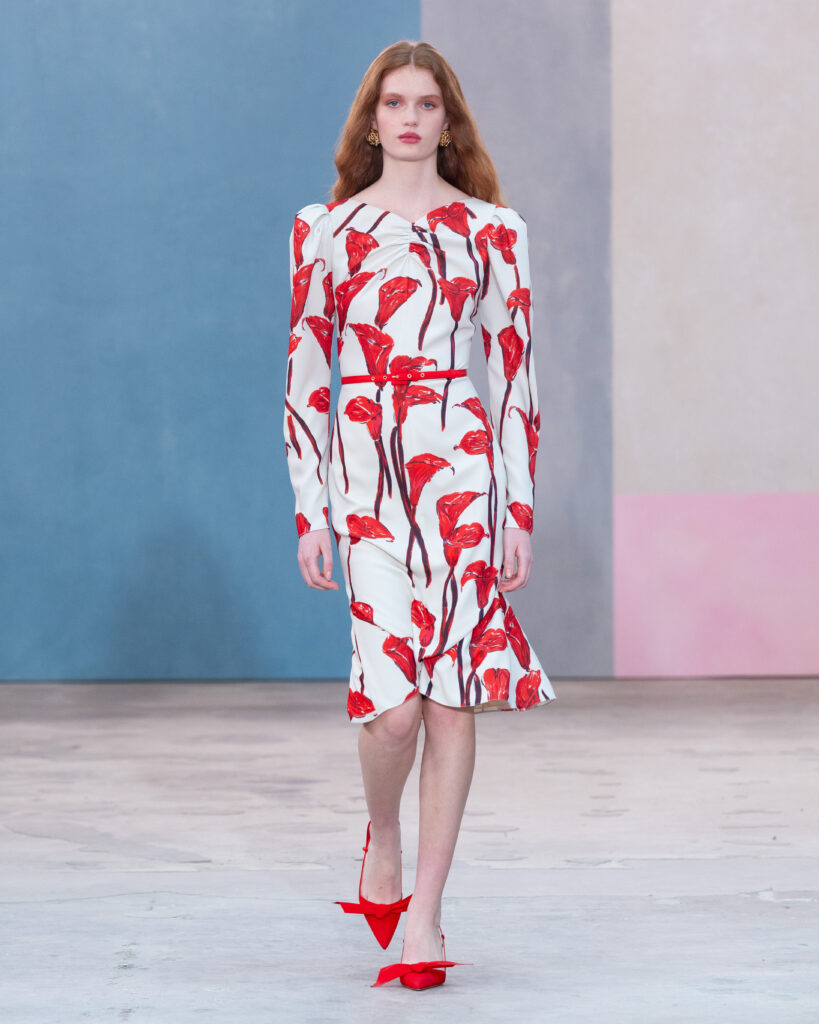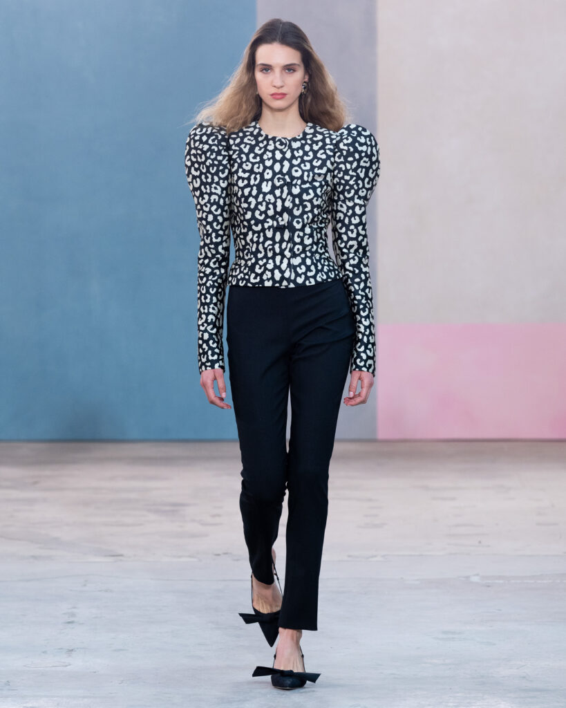 L’esthétique de la collection découle directement de cette posture. La chemise blanche en coton, code fondateur de Carolina Herrera, est ici déconstruite pour évoquer la blouse d’atelier. Elle gagne en volume, libère le mouvement, mais conserve une rigueur chromatique absolue, souvent traitée en noir et blanc.