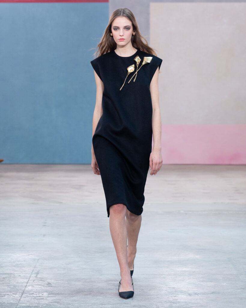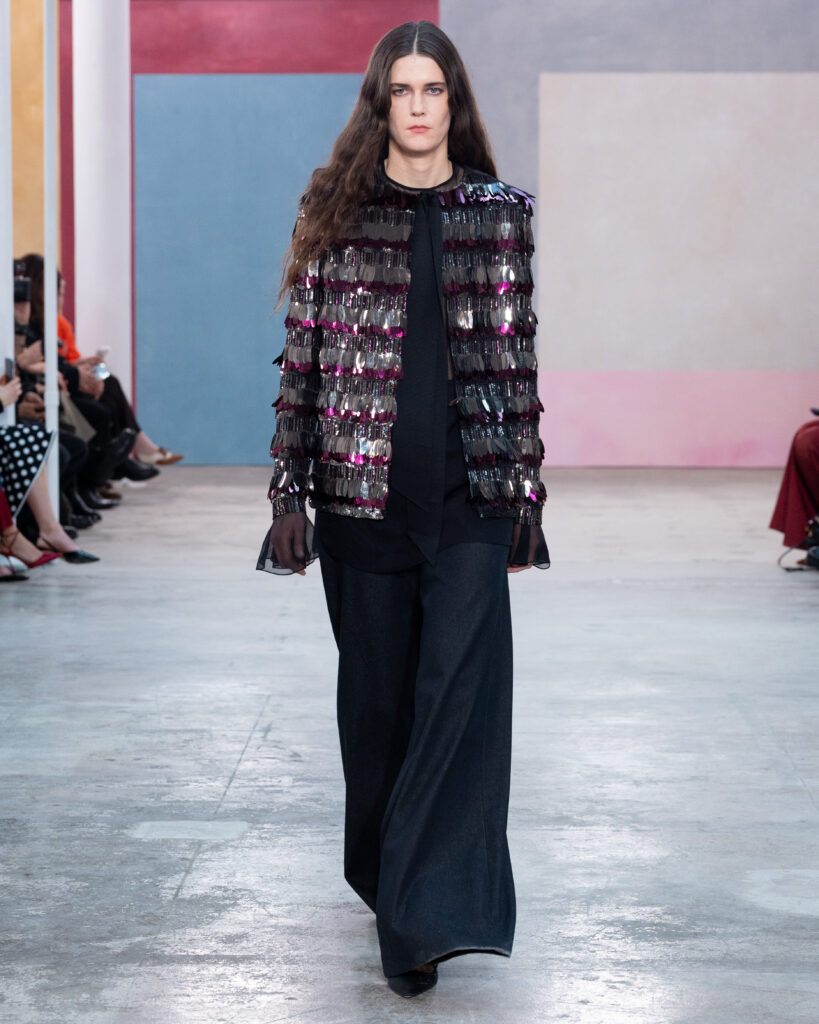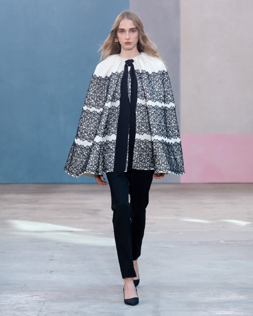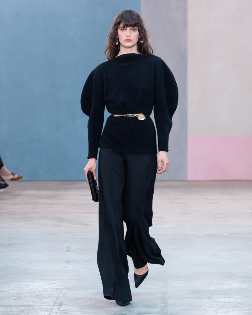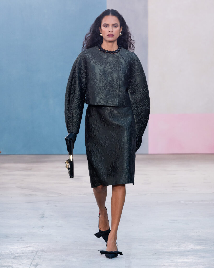 La construction des pièces emprunte au vocabulaire architectural. Les épaules sont exagérées, les manteaux adoptent des volumes « cocons » protecteurs, et les vestes à manches ballon structurent la silhouette sans l’entraver. On note l’utilisation récurrente de la faille de soie, notamment sur des capes qui citent explicitement l’allure éclectique de Peggy Guggenheim. Ce tissu, à la fois sec et nerveux, permet des lignes nettes qui ne s’effondrent pas, offrant une carapace sophistiquée à celle qui le porte.