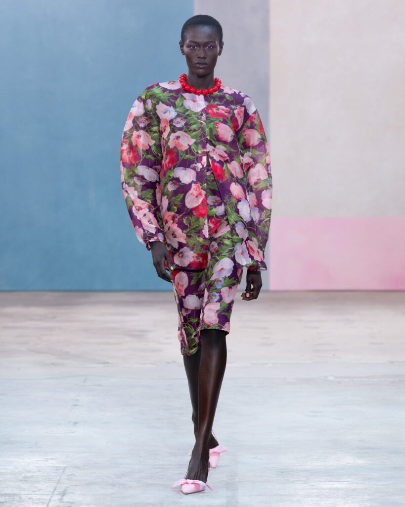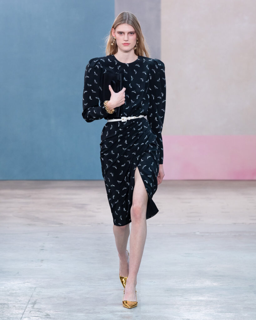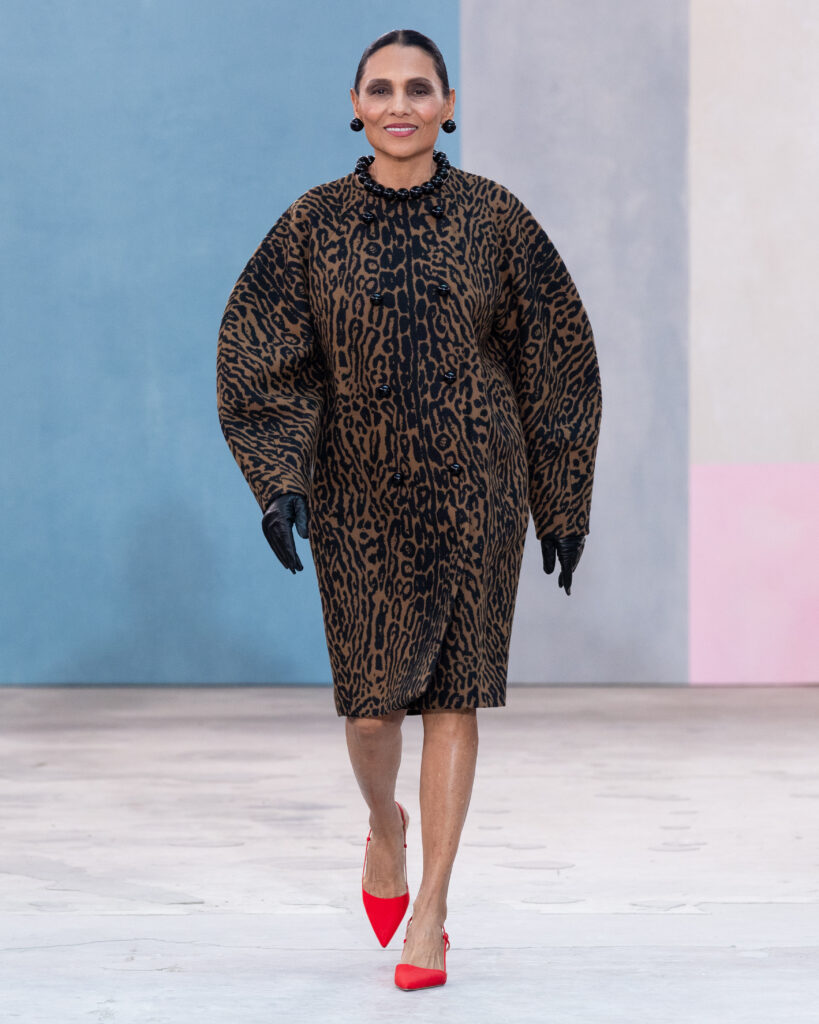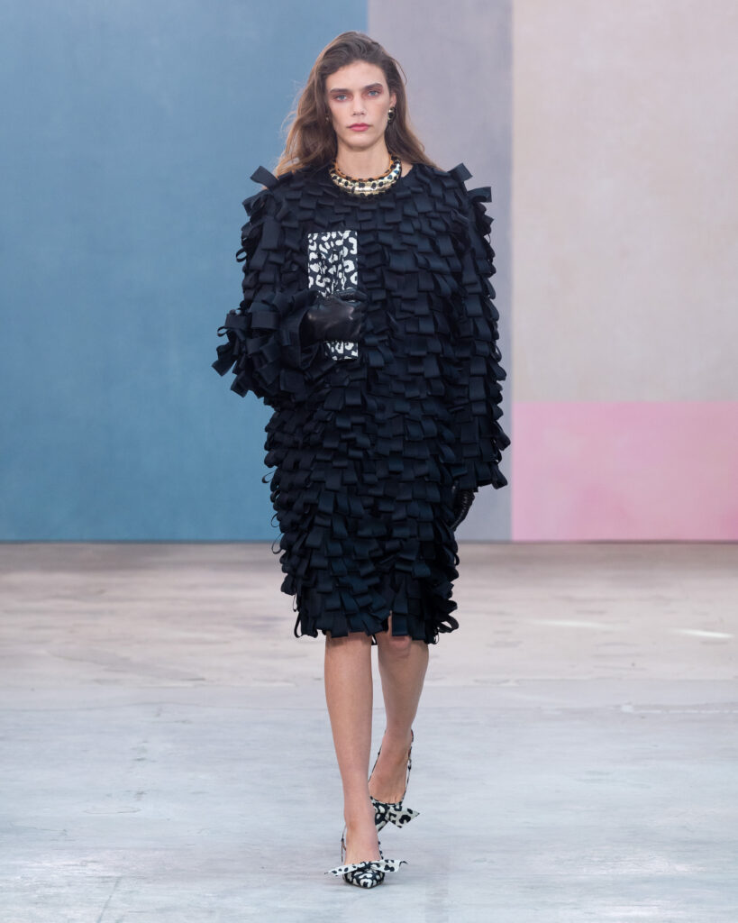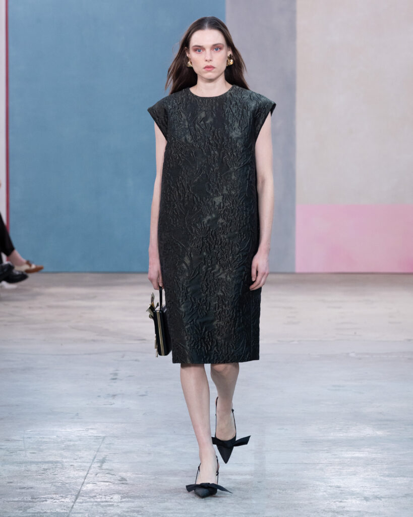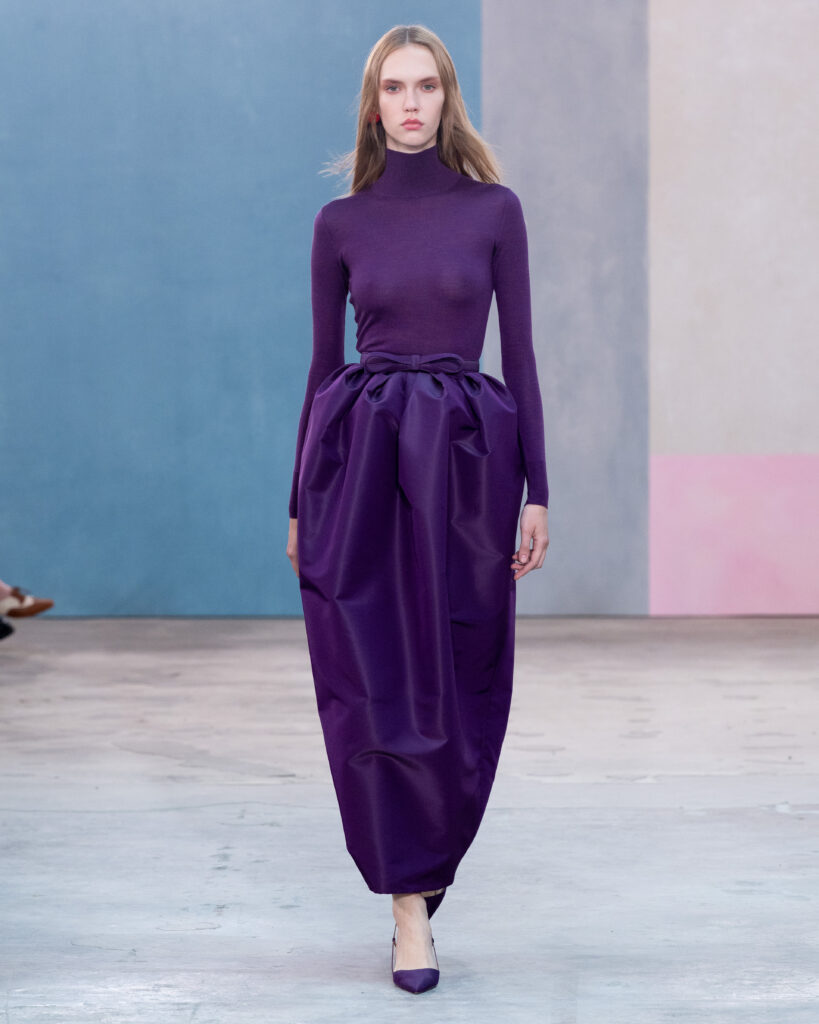 La construction des pièces emprunte au vocabulaire architectural. Les épaules sont exagérées, les manteaux adoptent des volumes « cocons » protecteurs, et les vestes à manches ballon structurent la silhouette sans l’entraver. On note l’utilisation récurrente de la faille de soie, notamment sur des capes qui citent explicitement l’allure éclectique de Peggy Guggenheim. Ce tissu, à la fois sec et nerveux, permet des lignes nettes qui ne s’effondrent pas, offrant une carapace sophistiquée à celle qui le porte.