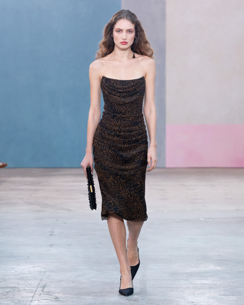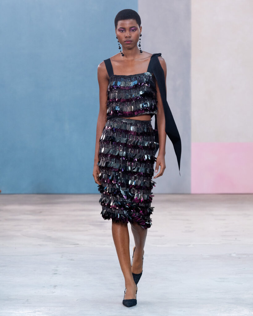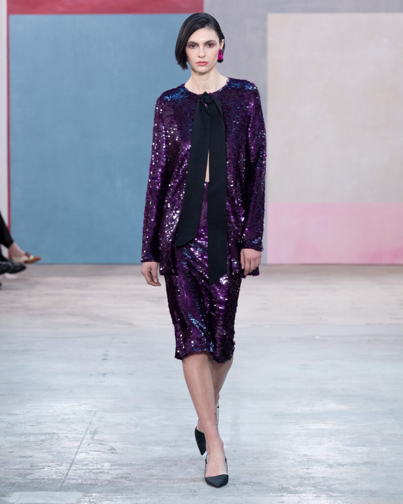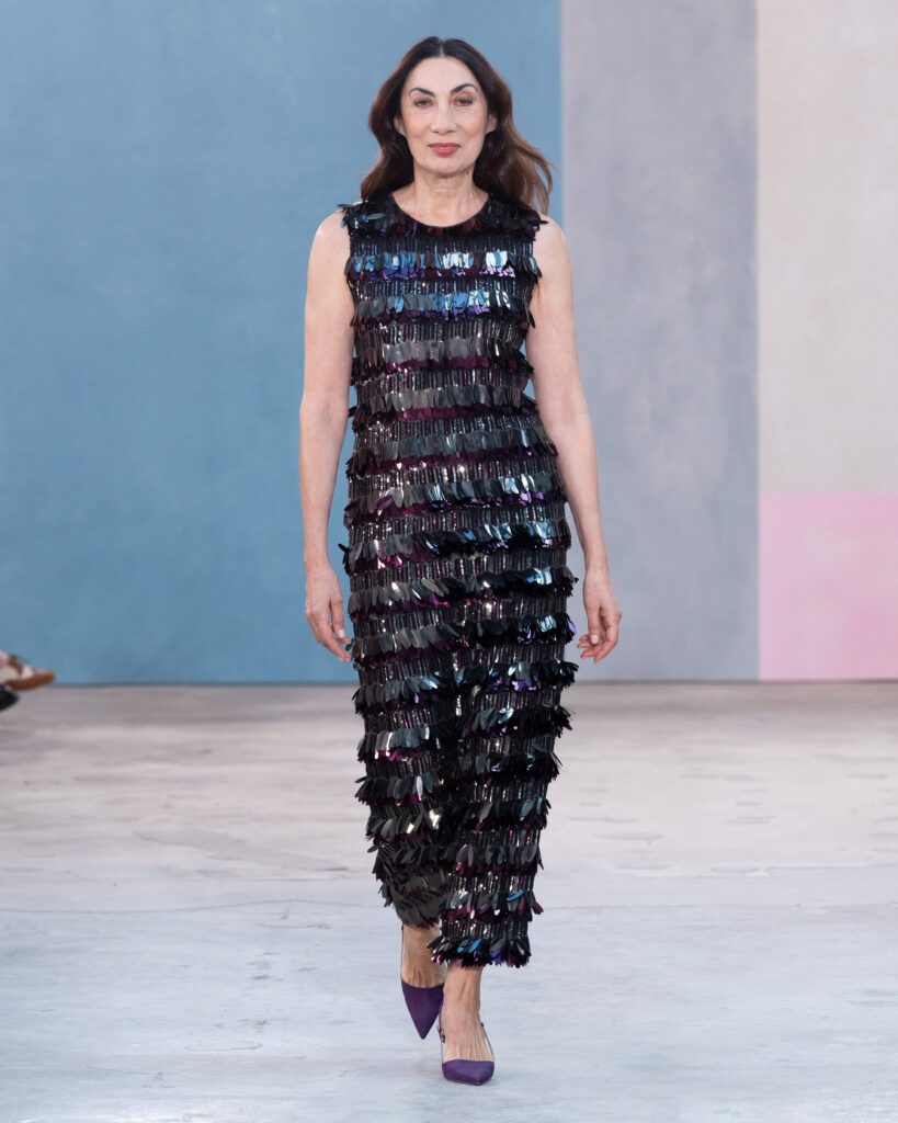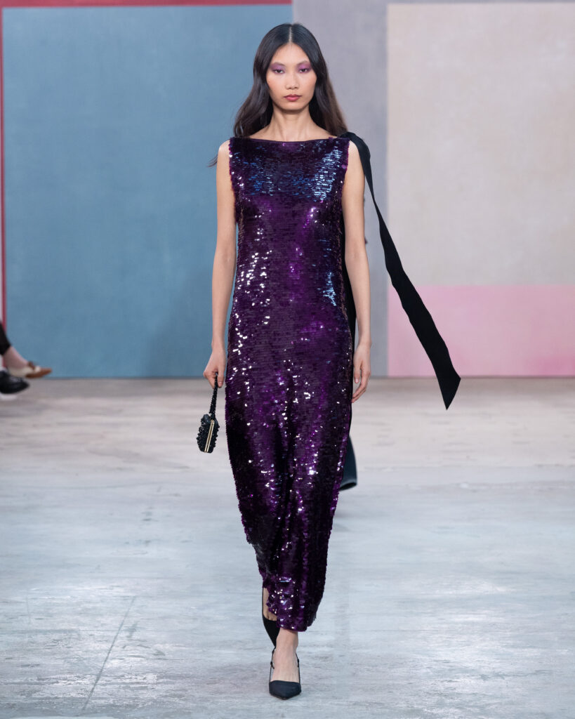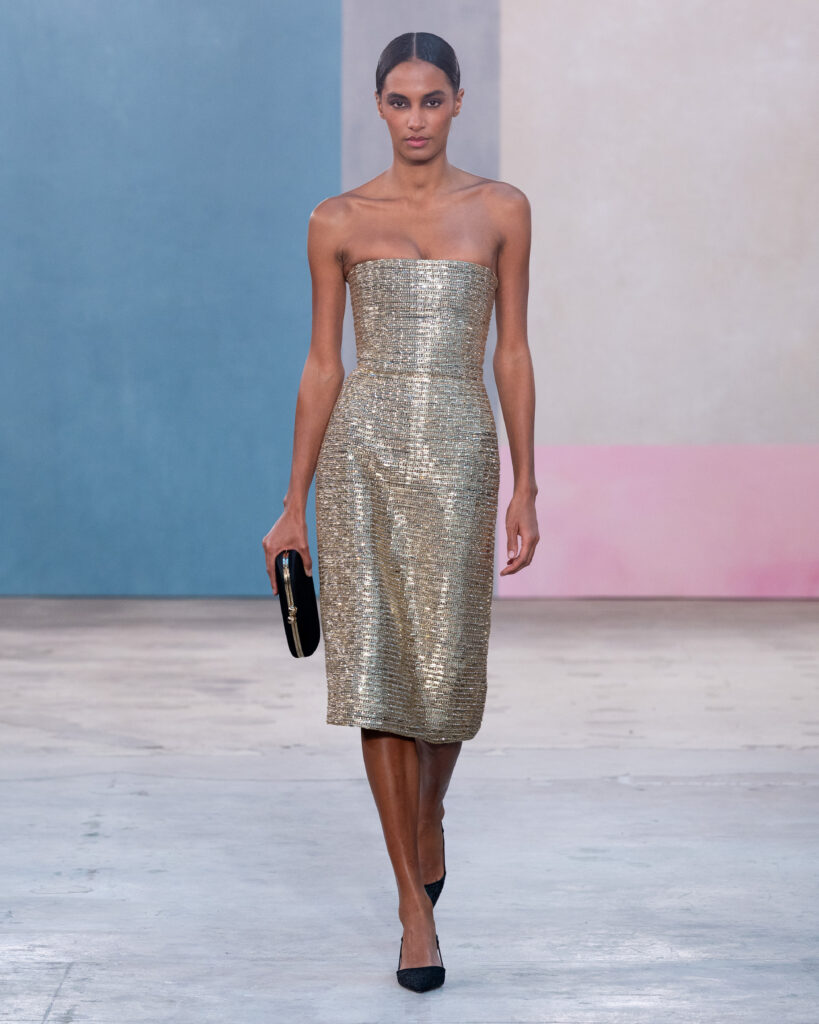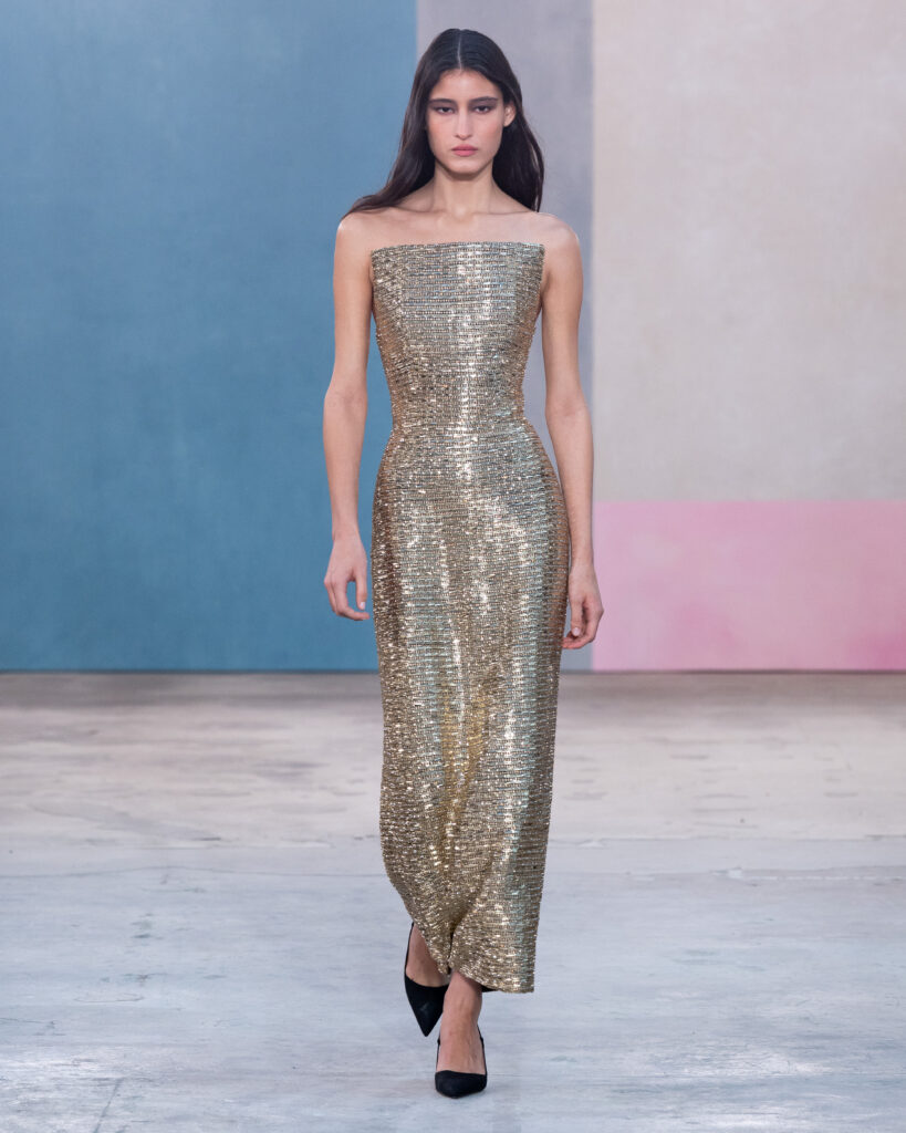 Si la palette explore des teintes « céramique », « vert forêt » ou « prune », le travail le plus technique réside dans la réinterprétation textile des œuvres d’art. Wes Gordon cite le travail minimaliste d’Agnes Martin, non pas par une impression littérale, mais par la texture. Une série de robes et de manteaux dorés est construite à partir de paillettes rectangulaires individuelles, assemblées pour recréer la vibration méditative et restreinte des toiles de l’artiste américaine.