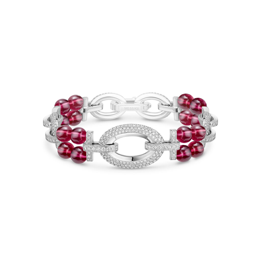 La grande nouveauté de cette saison réside dans l’intégration de l’œil de tigre. Cette pierre chatoyante, aux reflets de terre profonde et d’or en fusion, fait son entrée dans les ateliers de la Maison Messika pour la ligne Velvet Rope. Associée à des cordons sinueux et des diamants entrelacés, elle insuffle une énergie sauvage et minérale, contrastant avec l’éclat froid des rivières de diamants. La modularité, signature de la Maison, est ici poussée à son paroxysme avec des sautoirs et chokers pensés pour être superposés, amplifiant ainsi le mouvement naturel du corps.