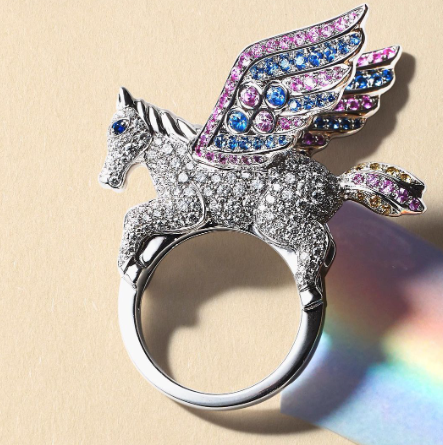 La pièce est construite en or blanc 18 carats, serti de saphirs aux nuances profondes et de diamants taille brillant. Mais ce qui retient l’attention n’est pas la liste des matières — c’est leur organisation dans l’espace. Pegasus est une bague volumétrique : le cheval ailé ne s’y pose pas comme un motif plat, il s’y déploie en relief, les ailes travaillées comme des plans distincts, le corps suggérant une torsion qui donne l’illusion du mouvement suspendu. Le bijou déborde du doigt plutôt qu’il ne s’y loge.
