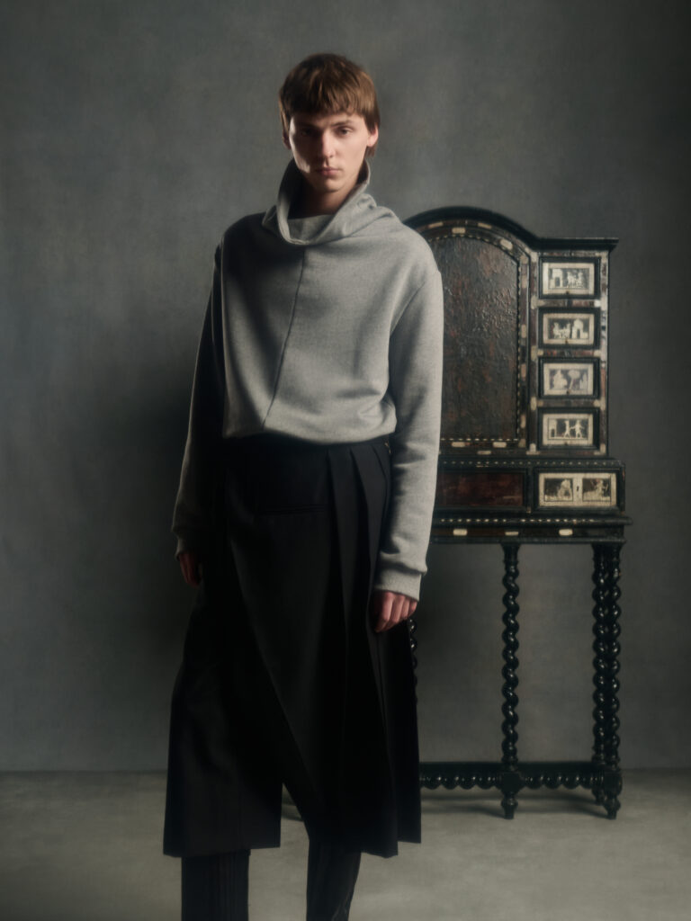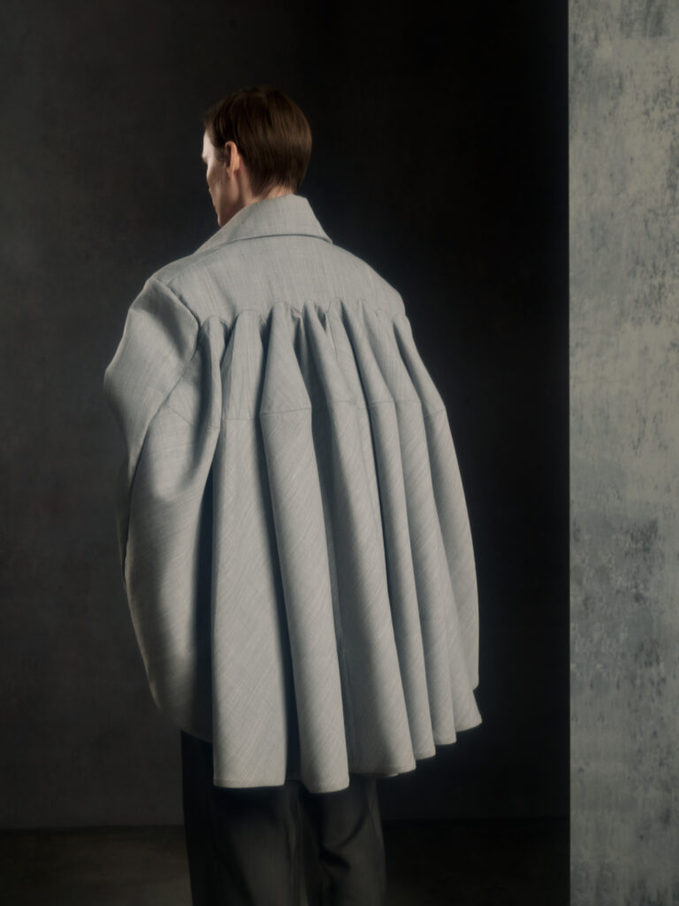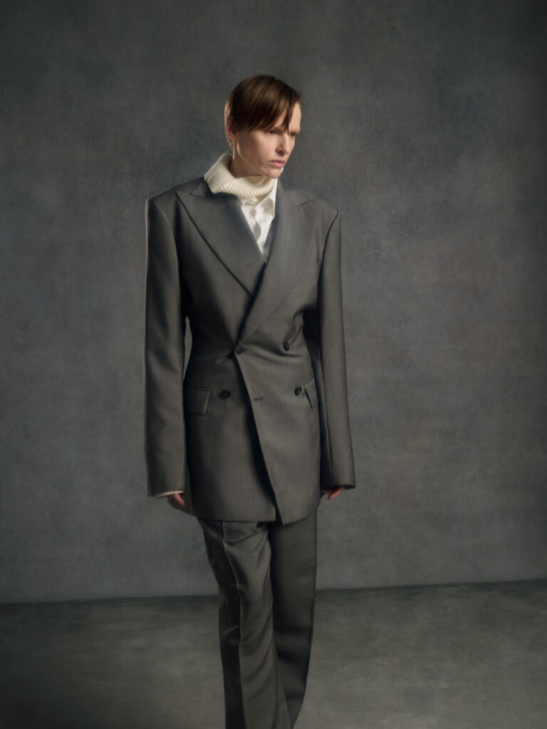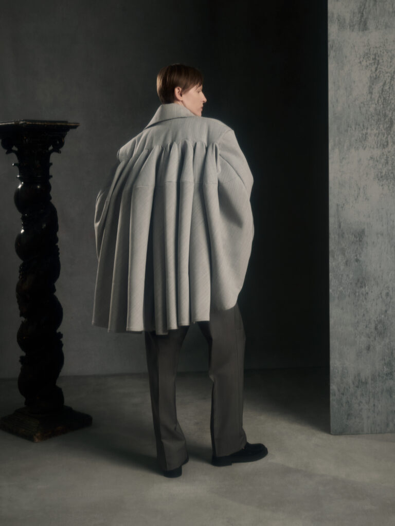 Puis vient le jeu des disproportions. Une veste double-boutonnage aux volumes elargis (Look 4) est associee a une jupe ou volume ecru tres ample, presque en corolle, qui fait basculer le vestiaire masculin vers une forme de presence scenique – pas un « gender statement » plaqué, plutot une logique de construction ou le corps n’est plus contenu mais revele par l’accumulation et l’air entre les couches. Dans d’autres images, un grand col plisse type fraise sur costume gris (Look 8) introduit une note quasi ceremonielle: le vetement comme apparat intime, pas comme deguisement.