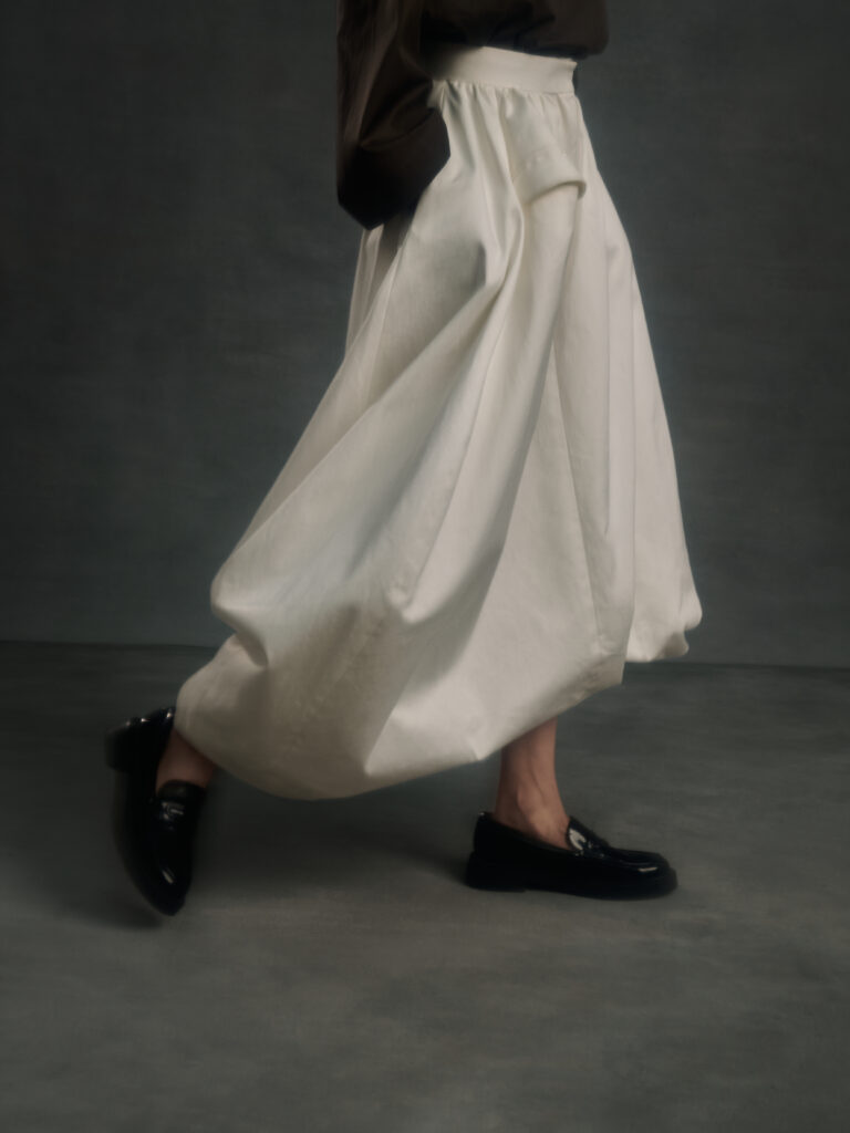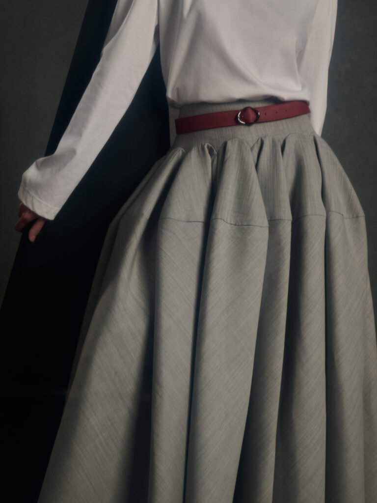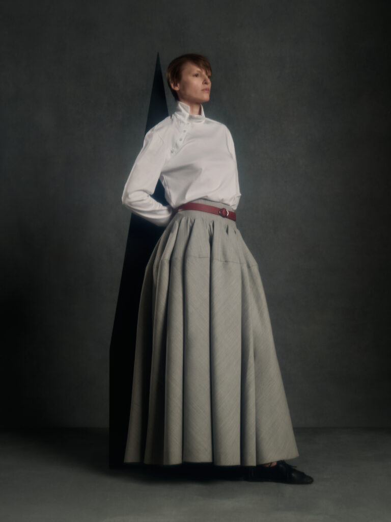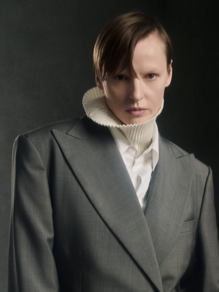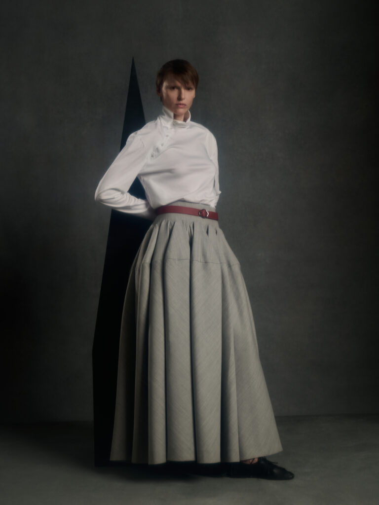 Puis vient le jeu des disproportions. Une veste double-boutonnage aux volumes elargis (Look 4) est associee a une jupe ou volume ecru tres ample, presque en corolle, qui fait basculer le vestiaire masculin vers une forme de presence scenique – pas un « gender statement » plaqué, plutot une logique de construction ou le corps n’est plus contenu mais revele par l’accumulation et l’air entre les couches. Dans d’autres images, un grand col plisse type fraise sur costume gris (Look 8) introduit une note quasi ceremonielle: le vetement comme apparat intime, pas comme deguisement.