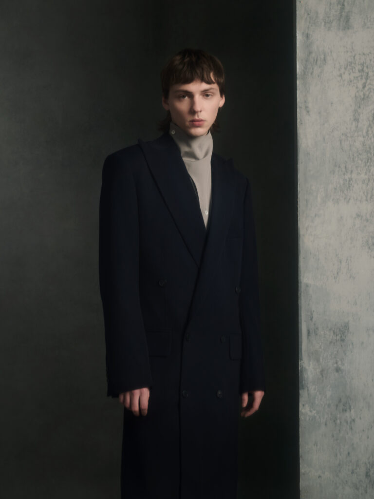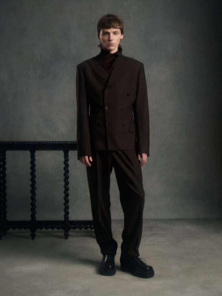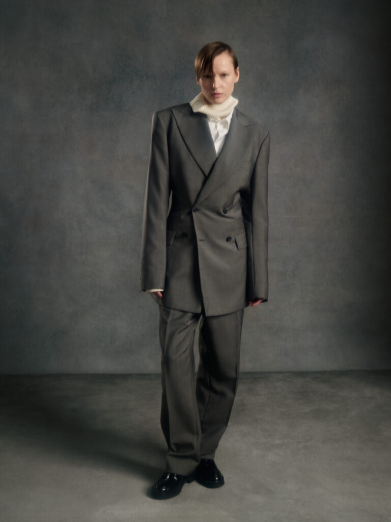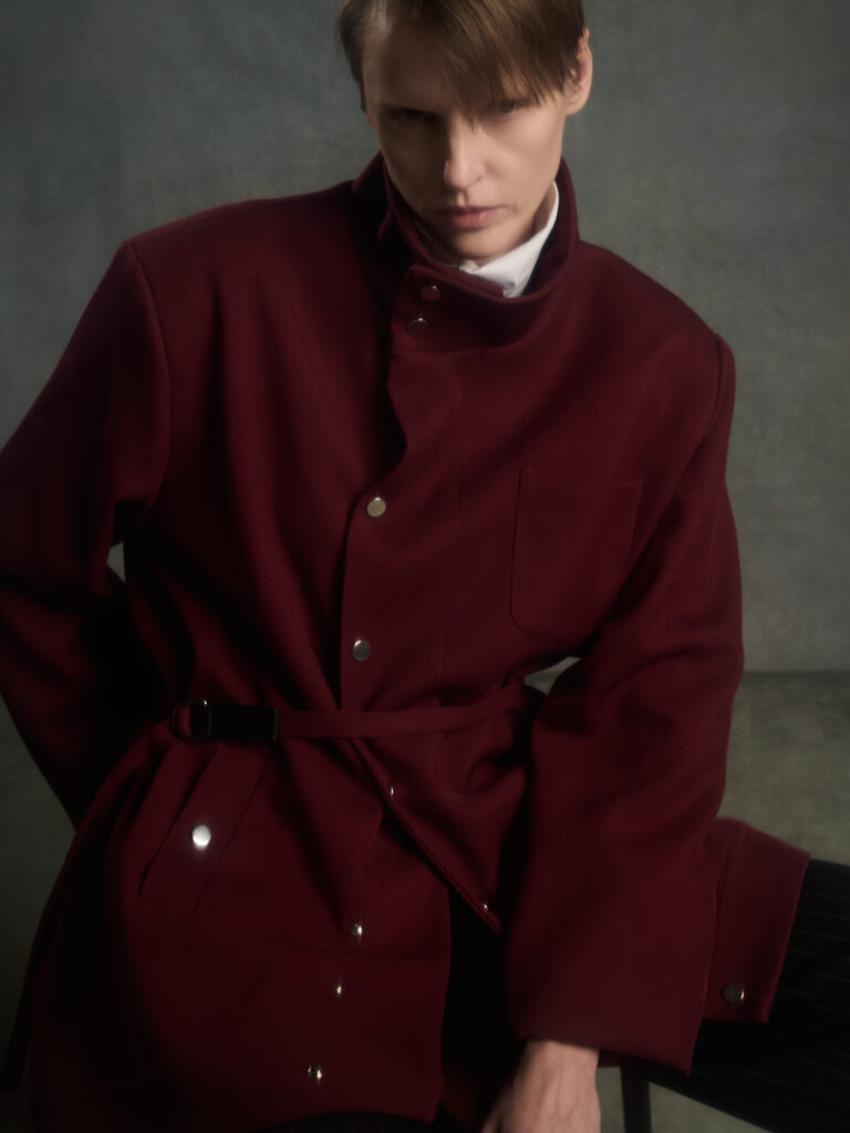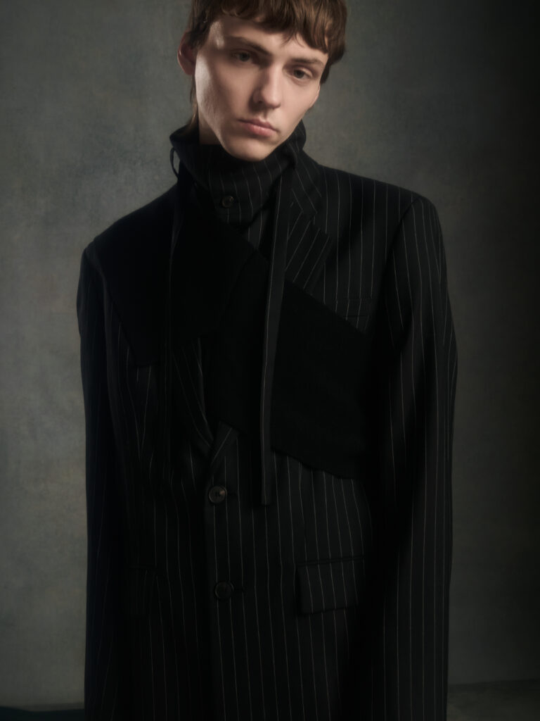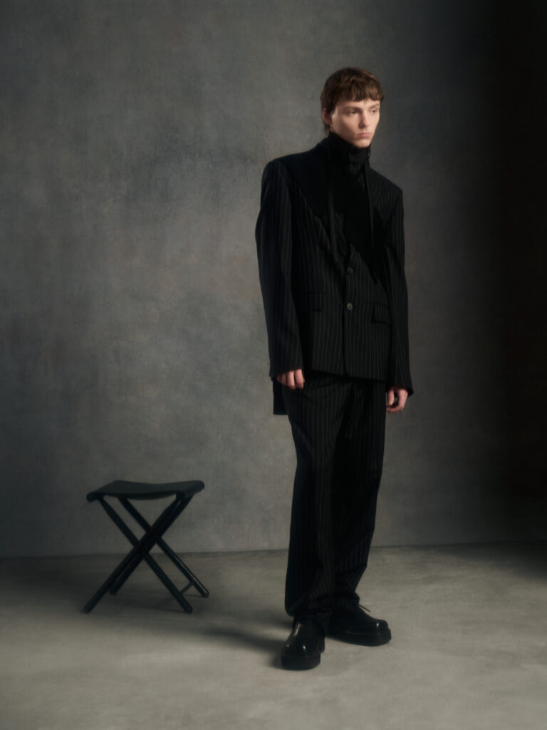 Dans le texte de collection, tout tourne autour d’une spiritualite sans iconographie – instinctive, ancree dans le corps et dans l’experience vecue – et d’un desir tres contemporain: ralentir, retrouver du sens, se reconnecter. Le risque, avec ce genre de vocabulaire, c’est la brume. Le lookbook, lui, ramene les choses au dur: du tailoring qui se desserre, des volumes qui s’eloignent du corps, et surtout une architecture de revers qui monte haut, comme si la coupe cherchait physiquement une sortie vers le haut.