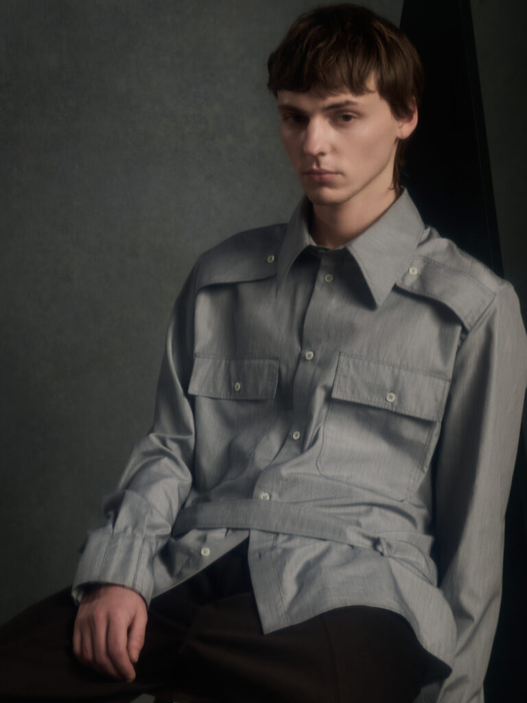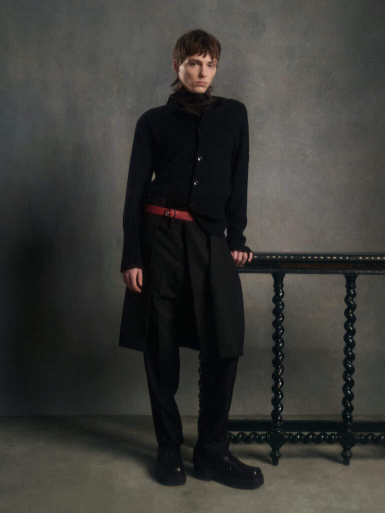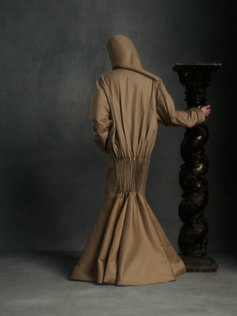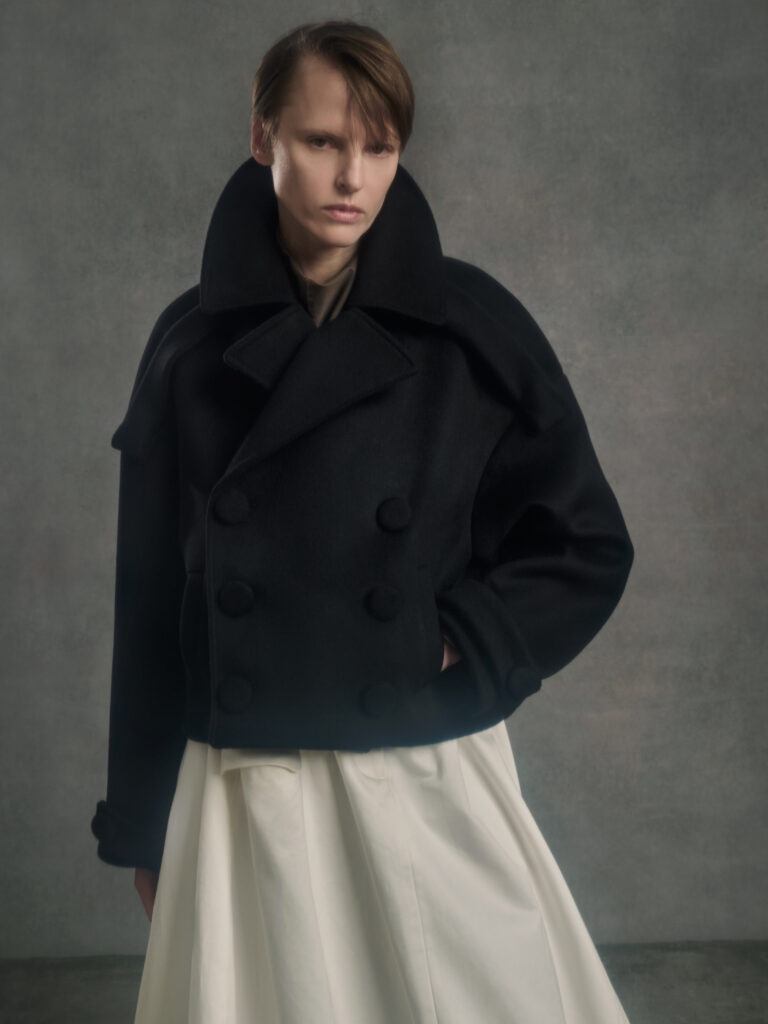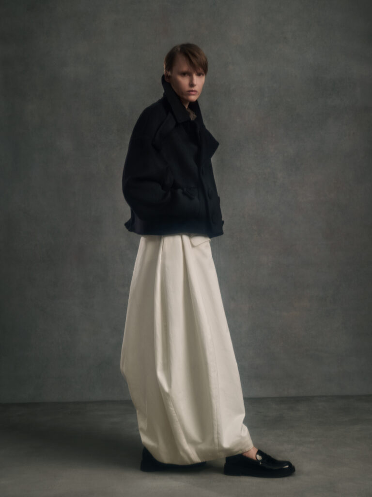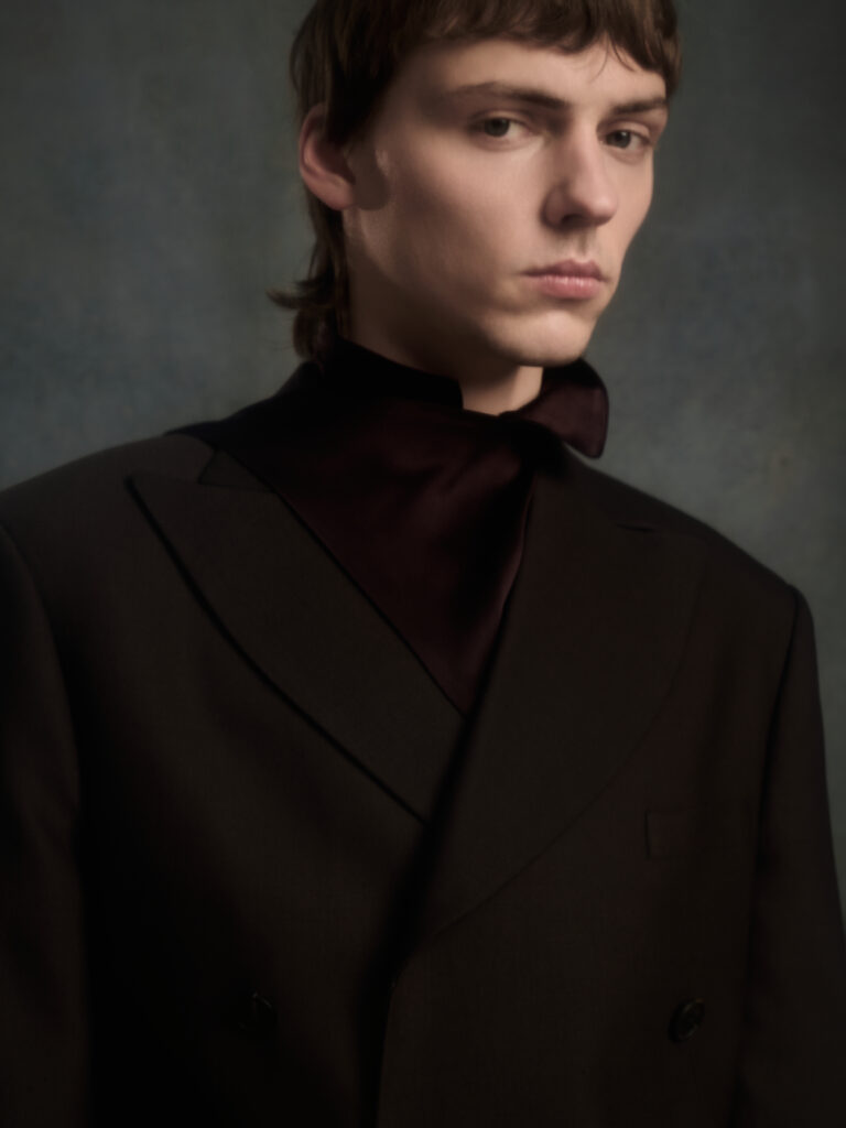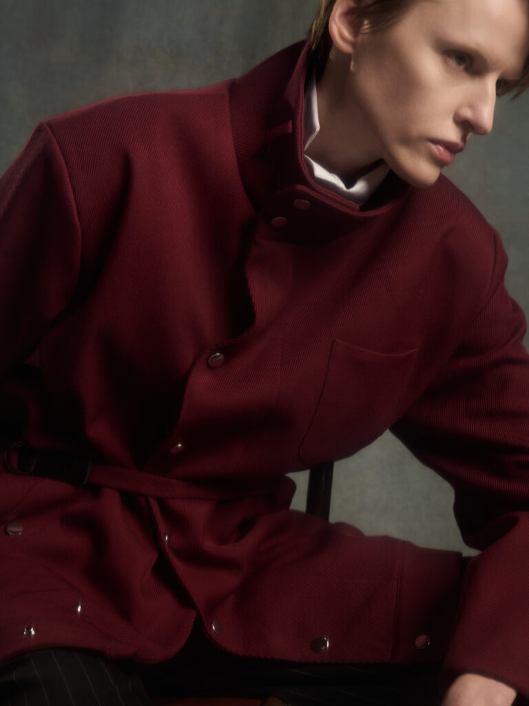 Dans le texte de collection, tout tourne autour d’une spiritualite sans iconographie – instinctive, ancree dans le corps et dans l’experience vecue – et d’un desir tres contemporain: ralentir, retrouver du sens, se reconnecter. Le risque, avec ce genre de vocabulaire, c’est la brume. Le lookbook, lui, ramene les choses au dur: du tailoring qui se desserre, des volumes qui s’eloignent du corps, et surtout une architecture de revers qui monte haut, comme si la coupe cherchait physiquement une sortie vers le haut.