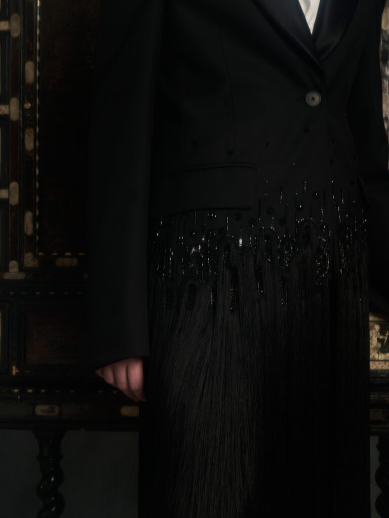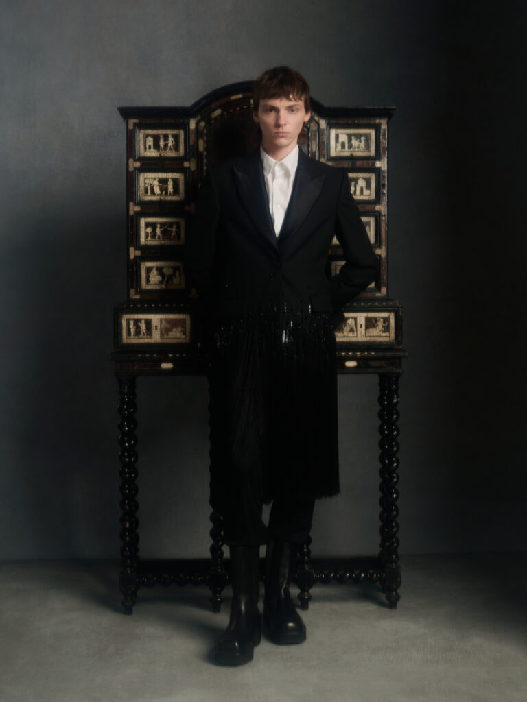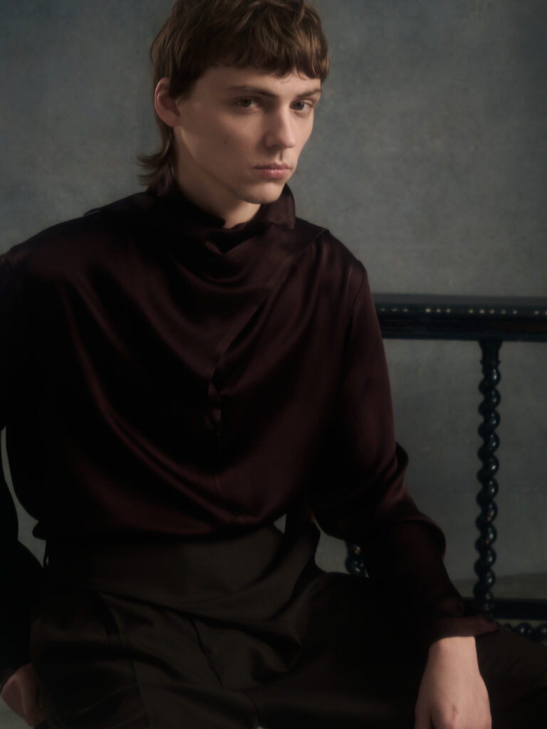 On retrouve aussi cette idee de rituel dans les details de mise en scene: un univers de studio sobre, des objets rares (banc, console, et surtout une chaise-sculpture creditée « Freedom Chair ») qui donnent au corps un statut d’objet en transformation, pose, deplace, recompose. Et c’est la que Passaro est interessant: il ne « romantise » pas le tailoring, il l’ouvre. Le texte parle de techniques traditionnelles qui rencontrent des constructions contemporaines, avec la main au centre pour faconner volume et forme. Le lookbook confirme une direction: le costume reste la grammaire, mais la ponctuation change (epaules plus presentes, longueurs qui glissent, superpositions qui deplacent la lecture du corps).