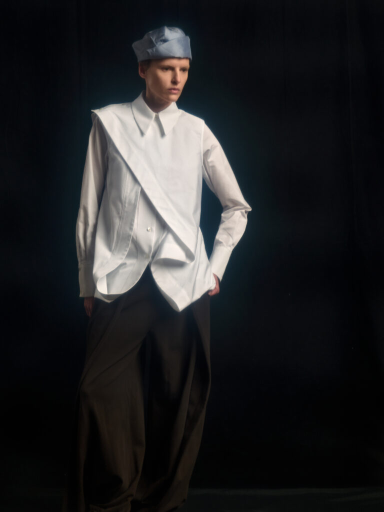 Le designer, lance en 2020, revendique une approche durable et l’usage de la 3D, avec des references qui vont de Helmut Lang a Issey Miyake, en passant par Alexander McQueen: trois manieres, chacune a sa facon, d’utiliser la coupe comme langage emotional autant que technique. Ici, l’« intelligence emotionnelle » n’est pas un argument: elle devient une strategie de forme. La fracture n’est pas un motif. C’est une methode.