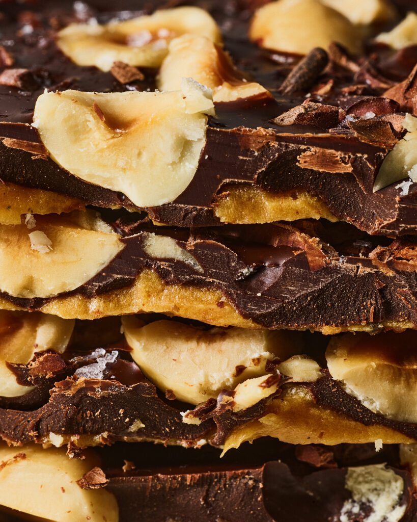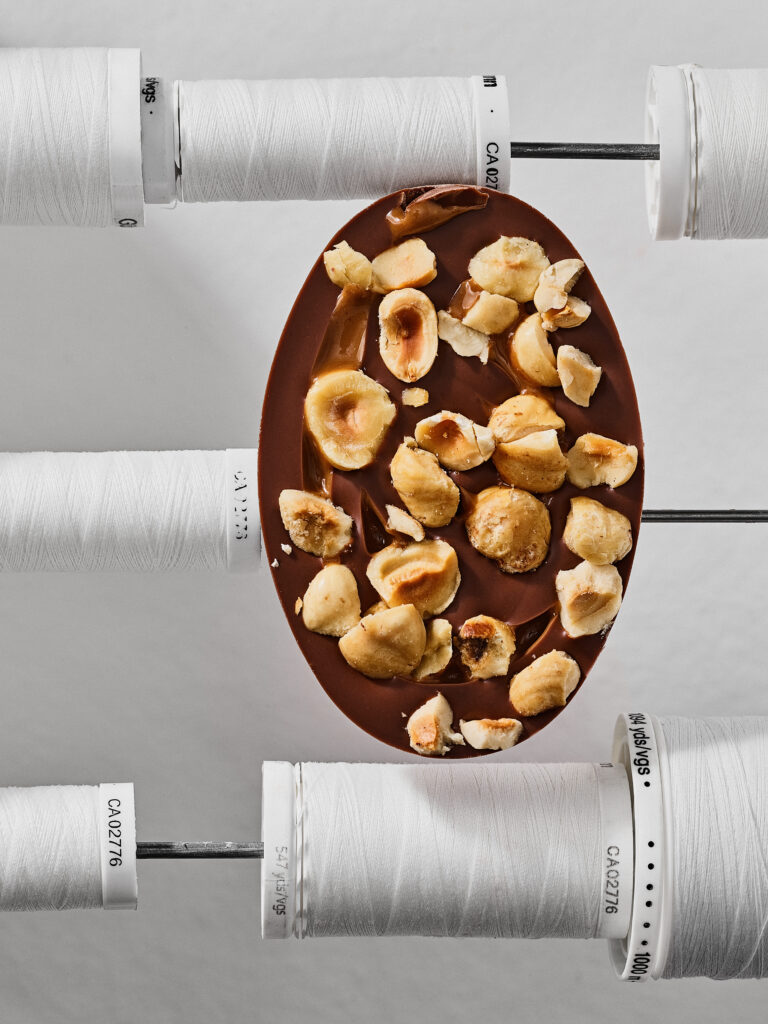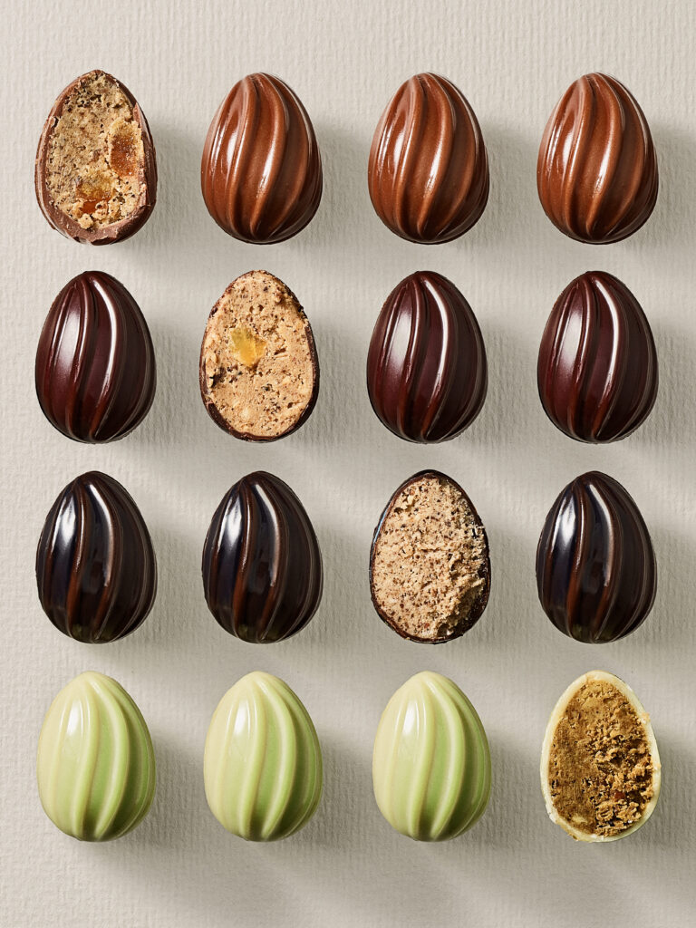 Noix de pécan chocolat noir, fruits secs (noisette/pécan/amande) abricot vanille, noisette citron vert/jaune chocolat au lait, noix orange confite, noisette Piémont, pistache kataïfi chocolat blanc. Trois nuances : noir, lait noisette, blanc caramel.
