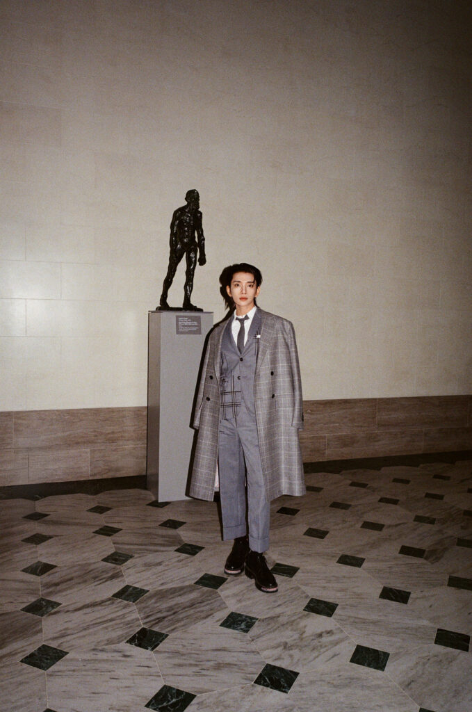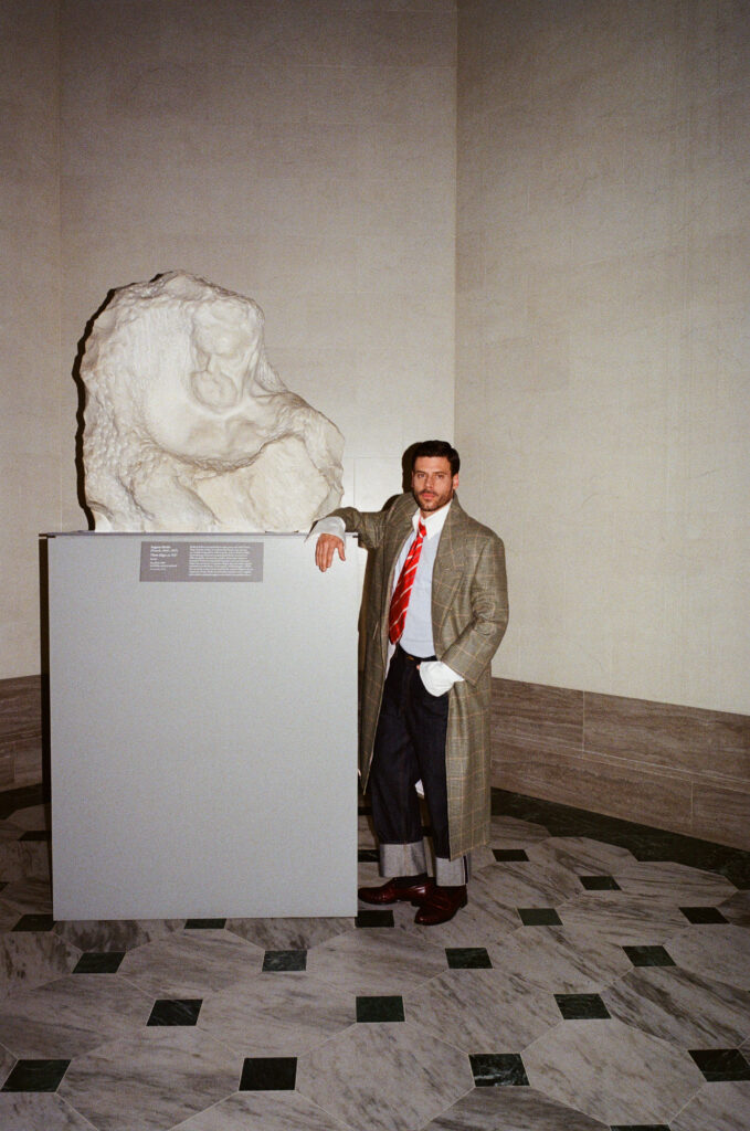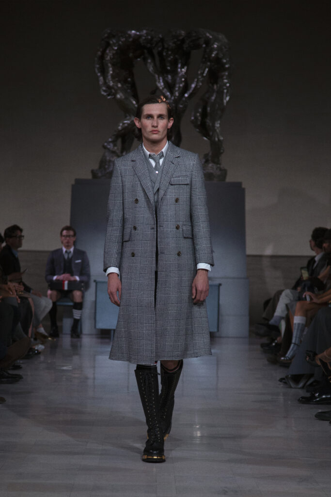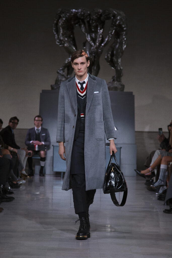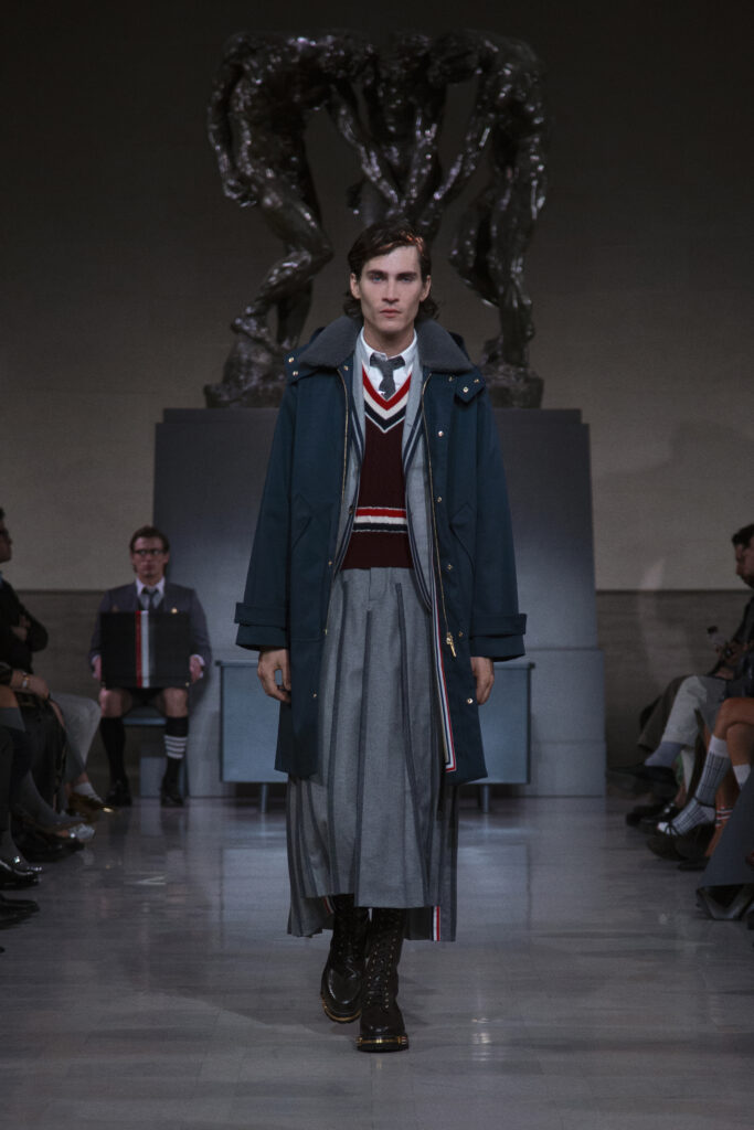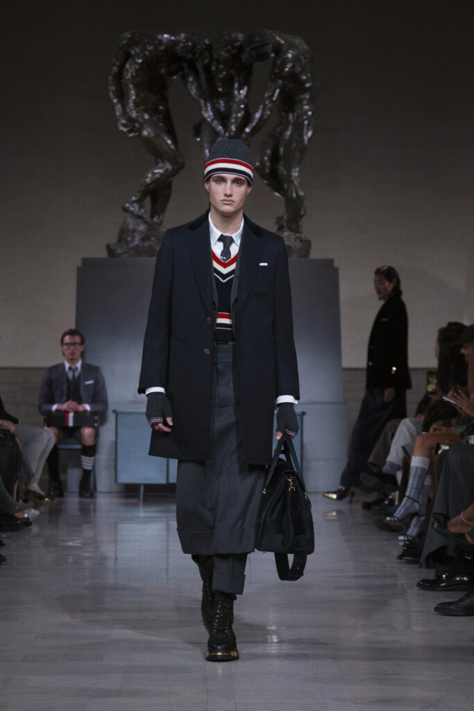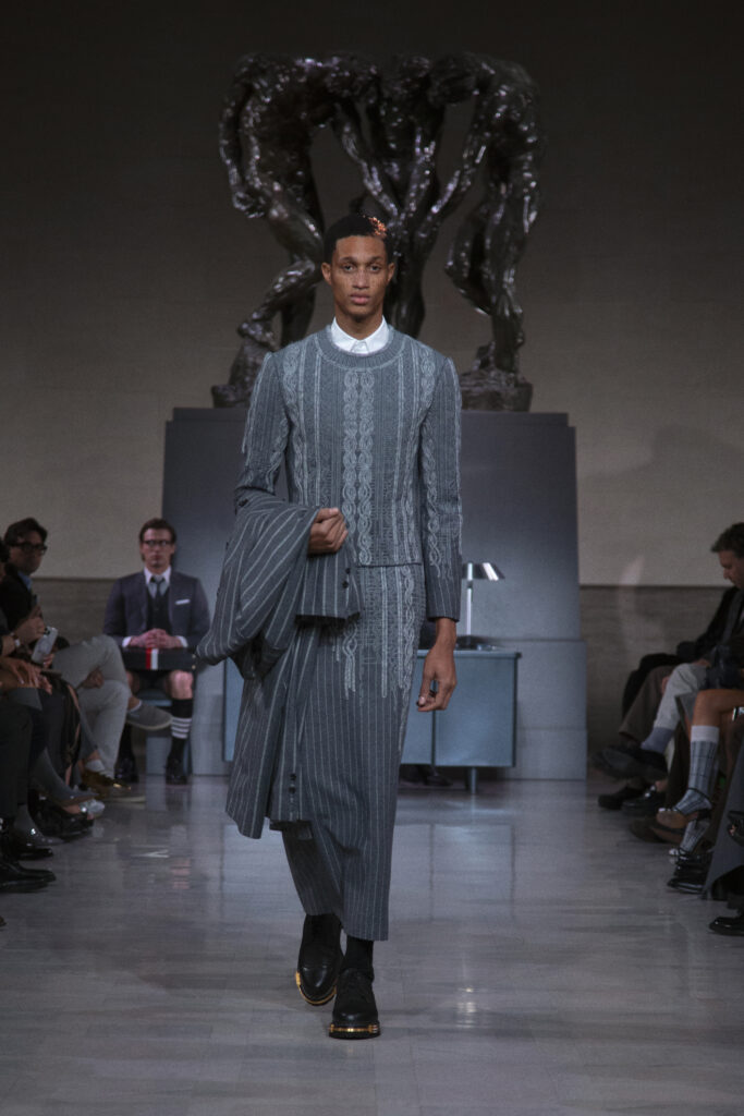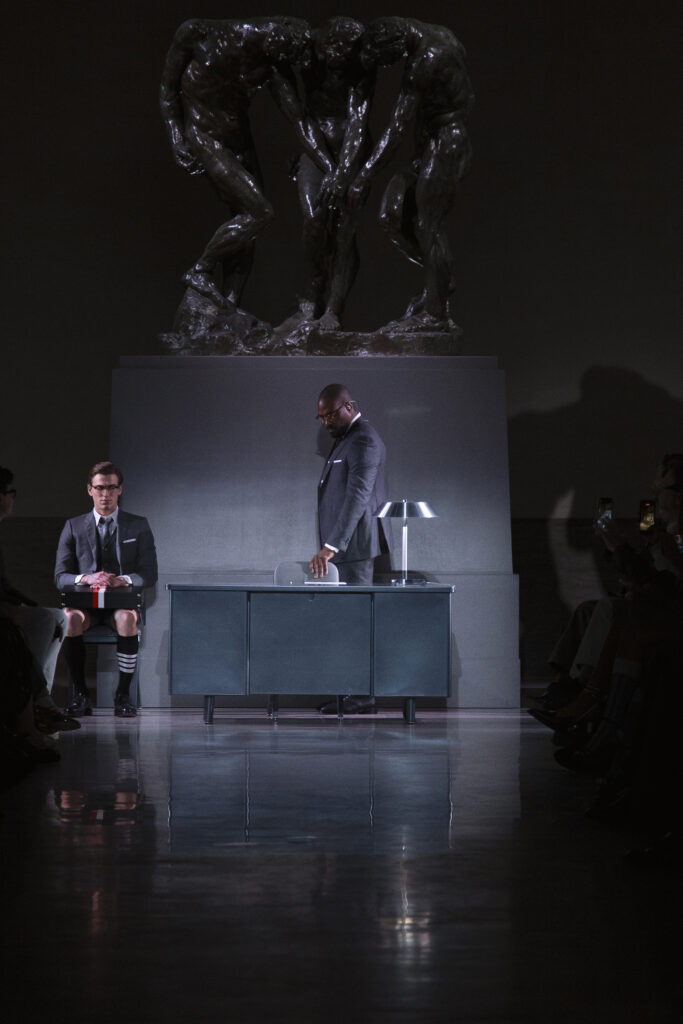 San Francisco, six février deux mille vingt-six. Thom Browne installe son defile sous Les Trois Ombres d’Auguste Rodin, au musee de la Legion d’honneur. Trois silhouettes de bronze, des sentinelles au-dessus d’un portail, et cette idee un peu vertigineuse: la mode comme mouvement pense « a travers le bronze ». Le texte du dossier de presse met en scene un « penseur » a son bureau, crayon et papier – et c’est Yahya Abdul-Mateen II qui raconte.