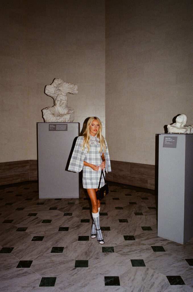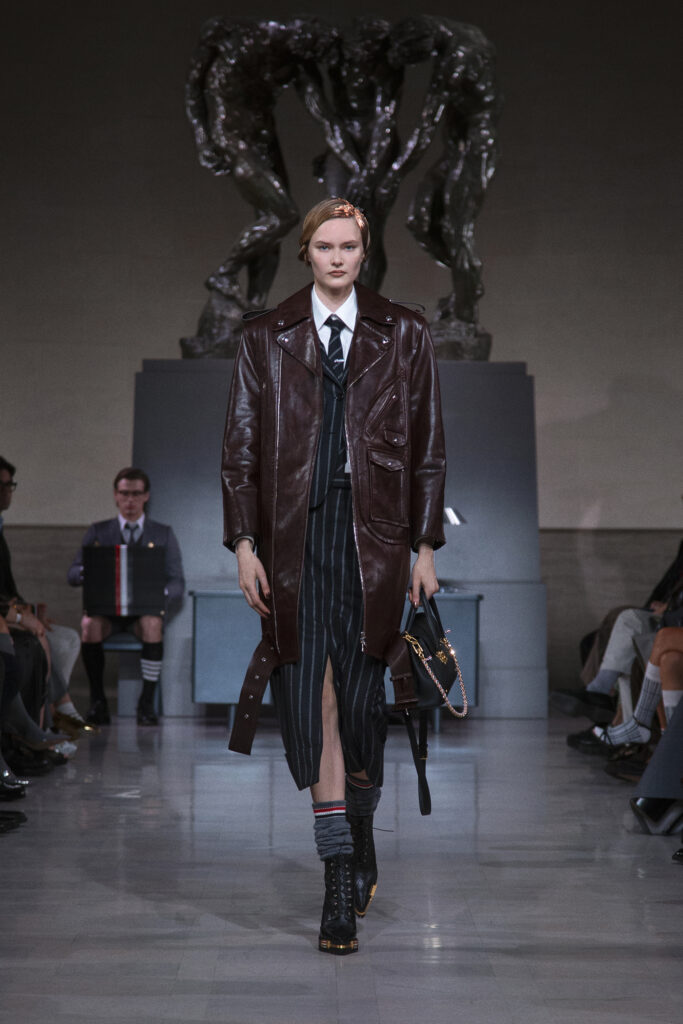 Le tailoring, lui, s’offre un passage presque « manuel de fabrication ». Vestes de sport en shetland prince-de-galles et variations de flanelle, ponctuees de broderies effilochees, puis un ensemble coordonne – veste, pantalon a patte arriere et jupe longueur genou. La « texture » est annoncee comme amplifiee, et l’image-cle, c’est ce pea coat allonge en cuir tisse a chevrons qui coiffe l’ensemble. Le dossier insiste: « maitrise artisanale » et « precision absolue ».