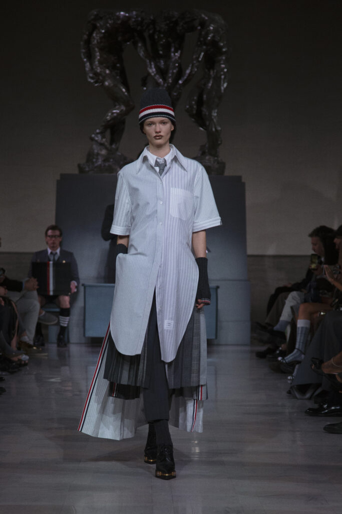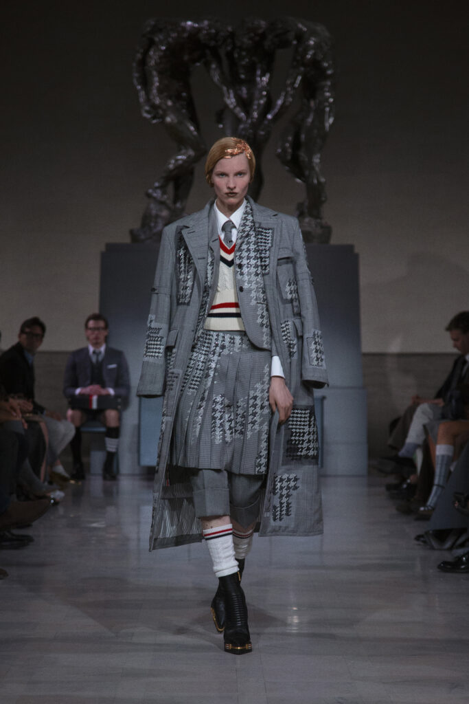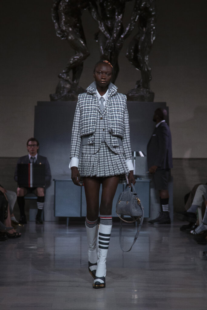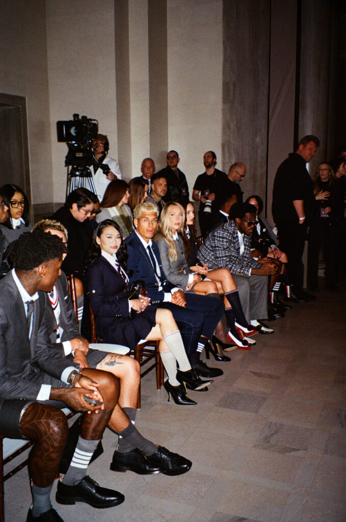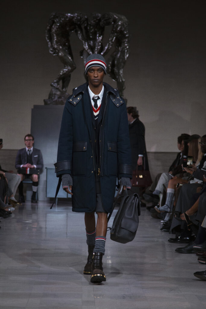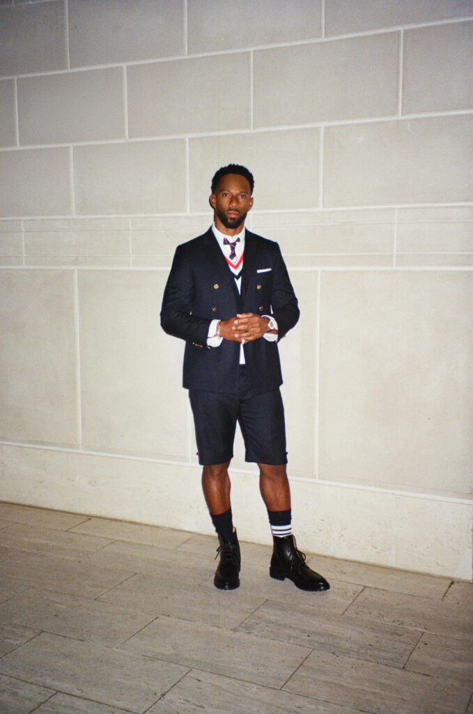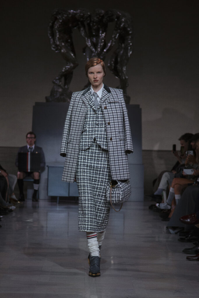 Le decor n’est pas un simple joli fond. Le show se tient deux jours avant le Super Bowl LX, et le casting enfonce le clou: des joueurs NFL, dont DeAndre Hopkins et Justin Jefferson, portent les silhouettes. Browne connecte explicitement la collection a une « quete d’excellence » – c’est moins l’athleisure que l’athletisme comme discipline mentale, version tailoring. Thom Browne Fall 2026 Collectio…