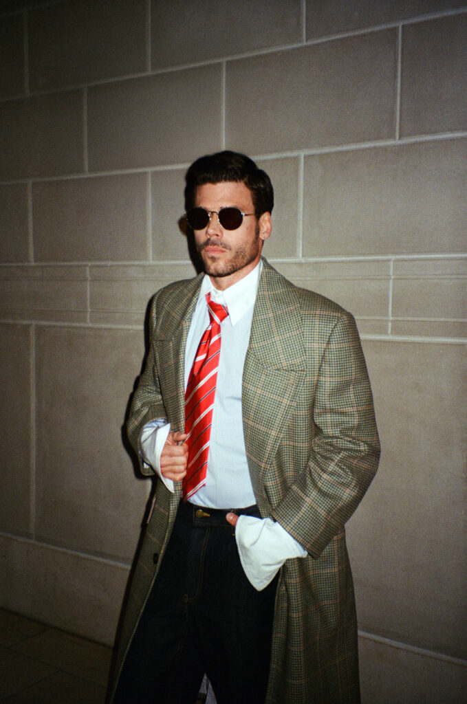 Il y a un petit plaisir Browne dans le frottement des codes: une veste de motard allongee pour contrebalancer les epaules d’un trench en tweed epais, puis les duffle-coats en shearling et daim bordeaux double face – ce bordeaux, chez lui, fait souvent l’effet d’une ponctuation. Et meme quand il se permet l’humour, il le fait par la technique: flocons brodes et paysages montagneux en intarsia sur merinos et cachemire. Rigoureux, puis un clin d’oeil.