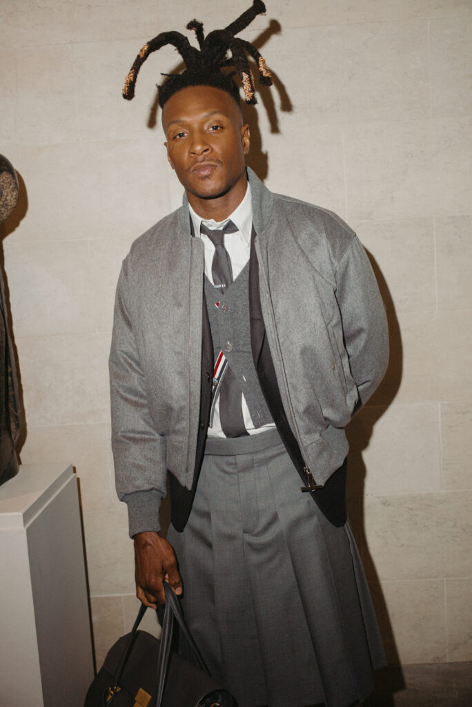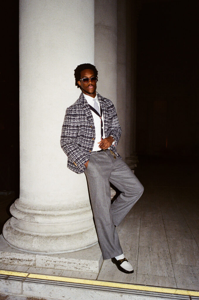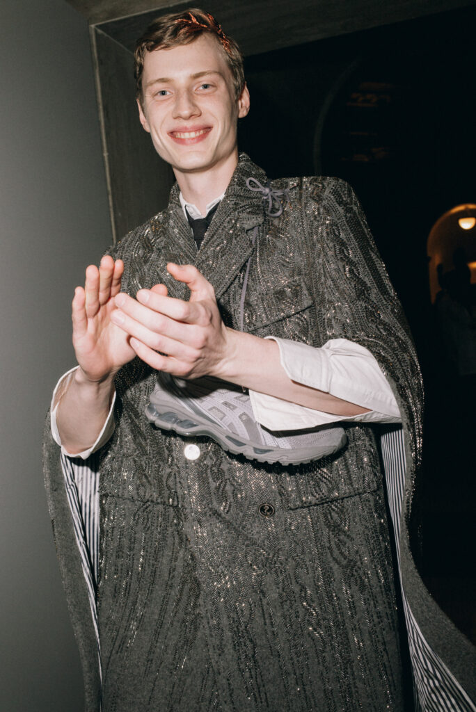 Et puis il y a le point business, pose sans trembler: collaboration avec ASICS SportStyle. Sur le runway, les silhouettes portent une edition limitee de la GEL-KAYANO 14, avec des details qui seront reveles au lancement planifie le deux mars deux mille vingt-six. La collab est annoncee comme devoilee « lors du defile » dans le cadre du GQ Bowl a San Francisco. Traduction: Browne continue de faire glisser son uniform tailleur vers une vraie grammaire performance – mais sans renoncer a son obsession de construction.