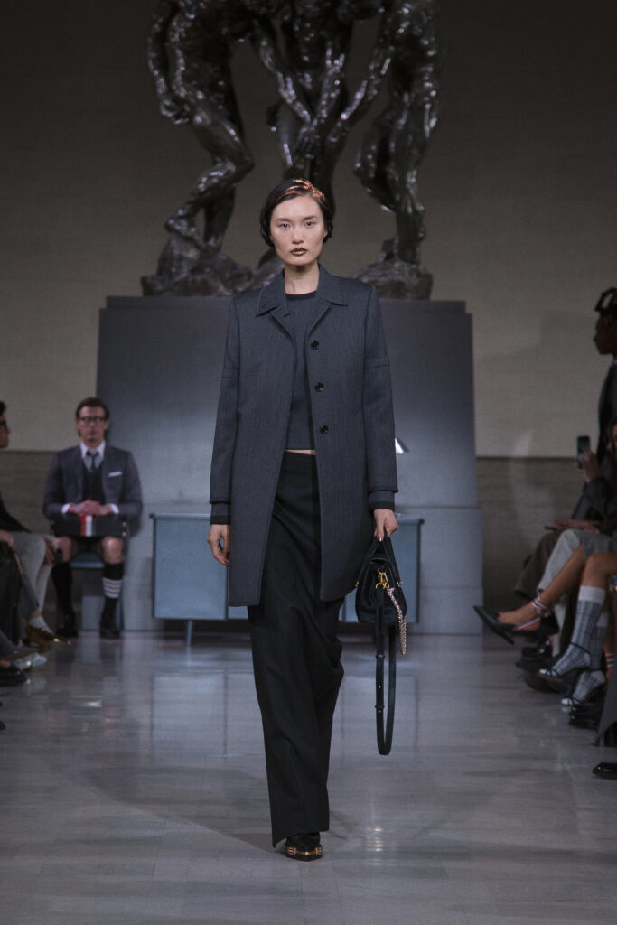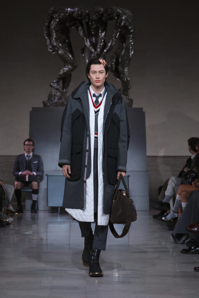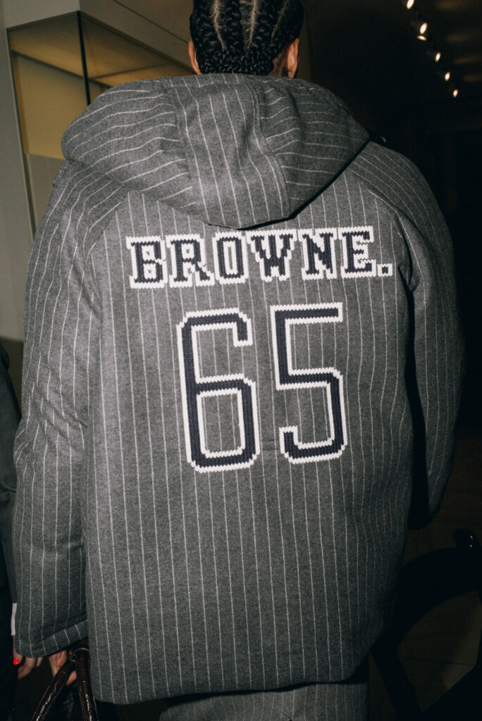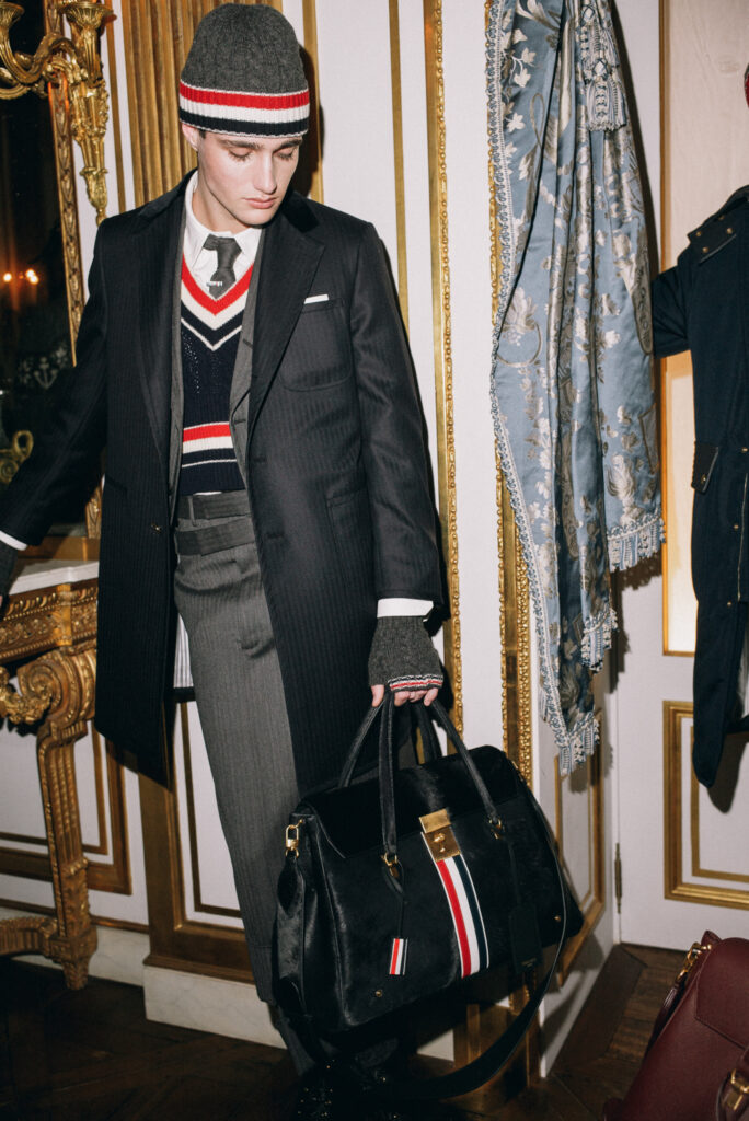 Dans les vetements, l’idee centrale est celle des strates. Browne est decrit « vu en couches »: manteaux et parkas superposes, silhouettes classiques mais proportions « renouvelees », ancrees dans le gris signature. L’ossature est tailleur, mais la saison se joue sur des matieres developpees sur mesure et reinterpretees: flanelles laine et cachemire, tissus compacts de tradition tailleur, mailles structurees en cachemire, tweed et mohair. Il ajoute des gilets ultra-fins a rayures cricket reduites, un bomber en cachemire impermeable, des parkas en melton et toile huilee, et des volumes franchement audacieux.