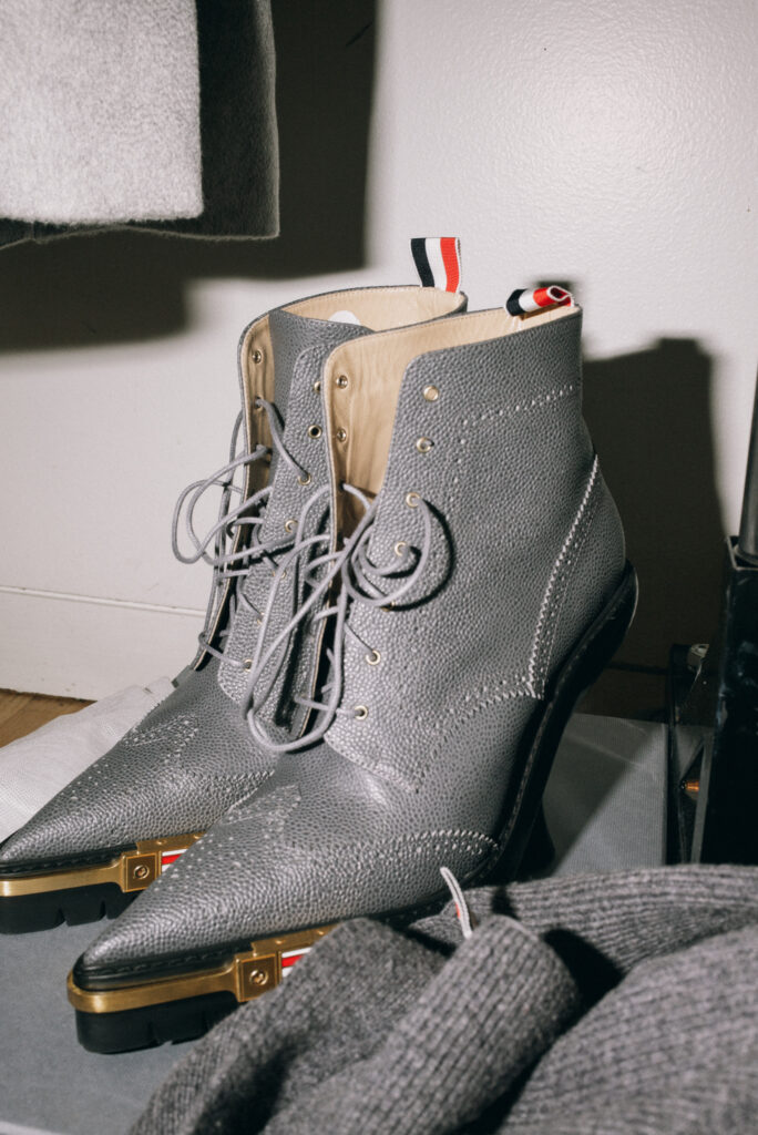 Cote accessoires, on est sur du concret (enfin). Retour des semelles de randonnee sur longwings et bottes, plus une nouvelle silhouette matelassee en version cheville et genou. Et surtout, un detail qui parle aux obsessionnels: embout metallique incruste de rouge, blanc et bleu, avec une construction qui mixe cousu Goodyear et double couture norvegienne, pour gagner en resistance a l’eau et en solidite structurelle. Chez Browne, meme la robustesse est mise en phrase.