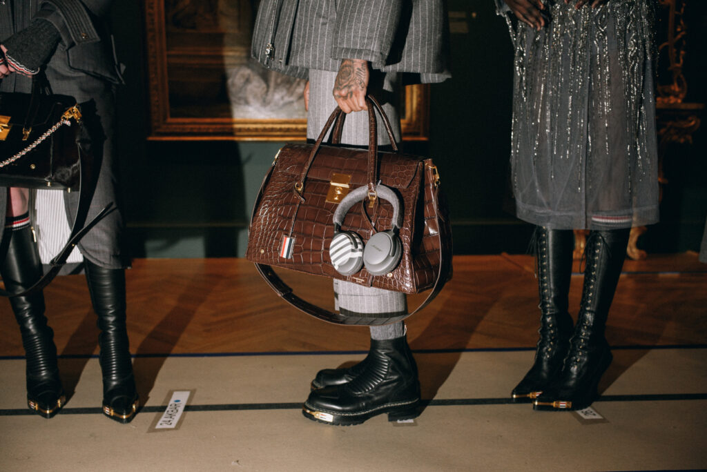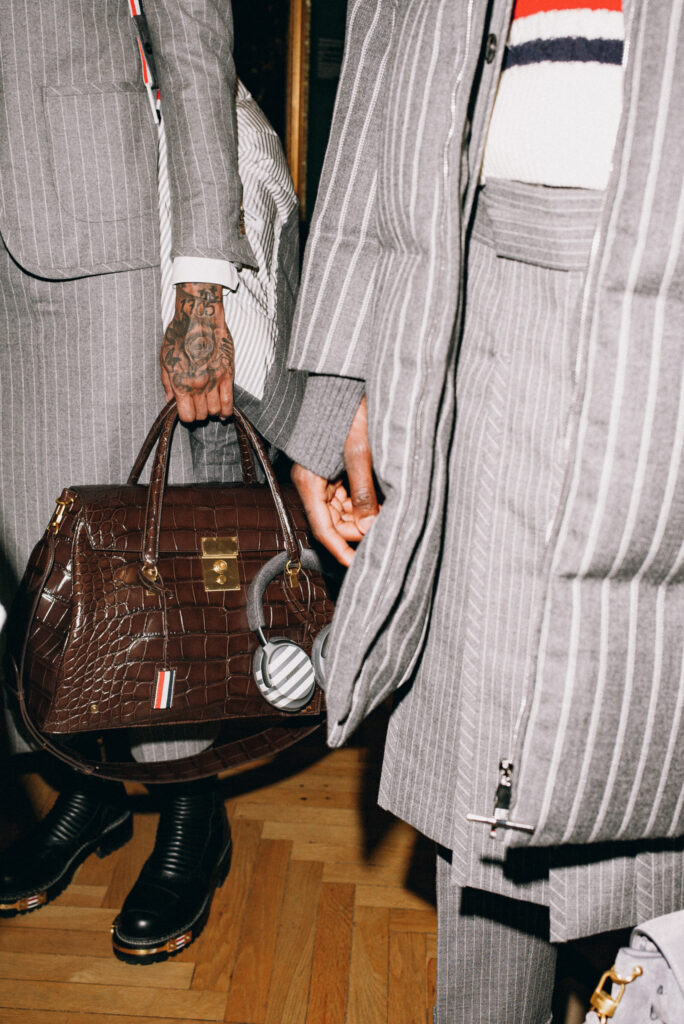 Le sac Bolton revient lui aussi, avec des reinterpretations en cuir vieilli et veau souple, et une declinaison sac a dos structuree par un rabat superieur et des poches laterales, fermee par un fermoir en laiton « reconnaissable ». Au final, les manteaux disparaissent, suspendus a des sangles de sac a dos – image de depart, image d’arrivee: on plie, on porte, on part.
