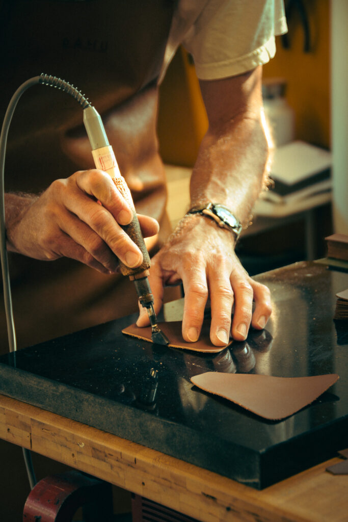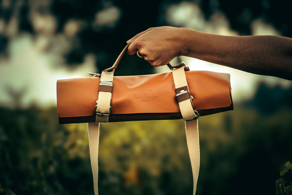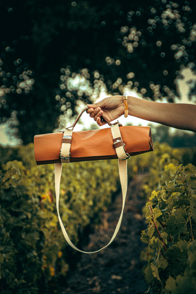Conçu en collaboration avec l’Atelier Dahu, artisan maroquinier bordelais, cet étui de dégustation est pensé comme un écrin technique. Le choix du cuir, matière vivante qui se patine comme un grand vin se bonifie, n’est pas anodin. Il abrite un instrument précis : le tire-bouchon bilame. Contrairement à la mèche classique qui perce, le bilame se glisse le long du verre et du liège, permettant d’extraire le bouchon sans le blesser. Ce détail, bien connu des collectionneurs de vieux millésimes, souligne ici une philosophie du respect et de l’intégrité de la bouteille, où que l’on soit.