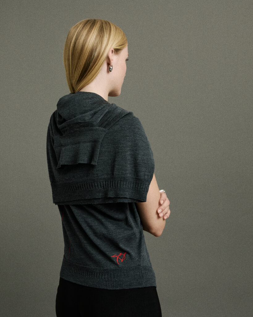 Les clins d’œil personnels parsèment la ligne comme autant de confidences textiles : la mention « Stay Modern » sur les étiquettes, ou encore l’oiseau dessiné par Nighy sur ses scripts, brodé ici avec finesse en multicolore. Une élégance du détail qui scelle l’authenticité de cette collaboration.