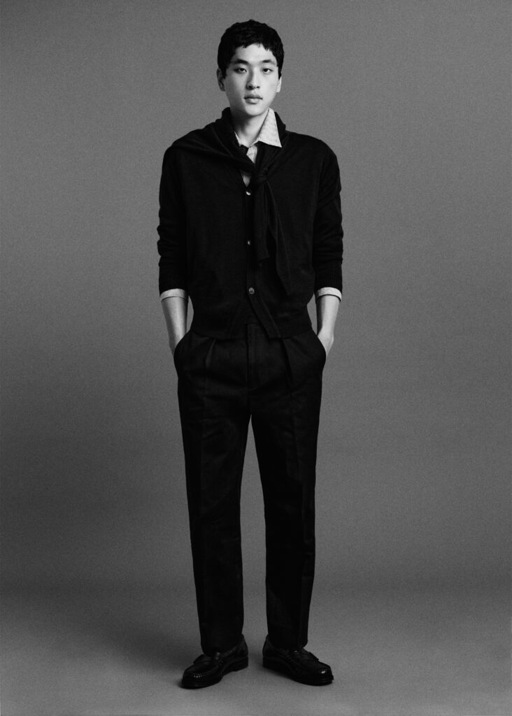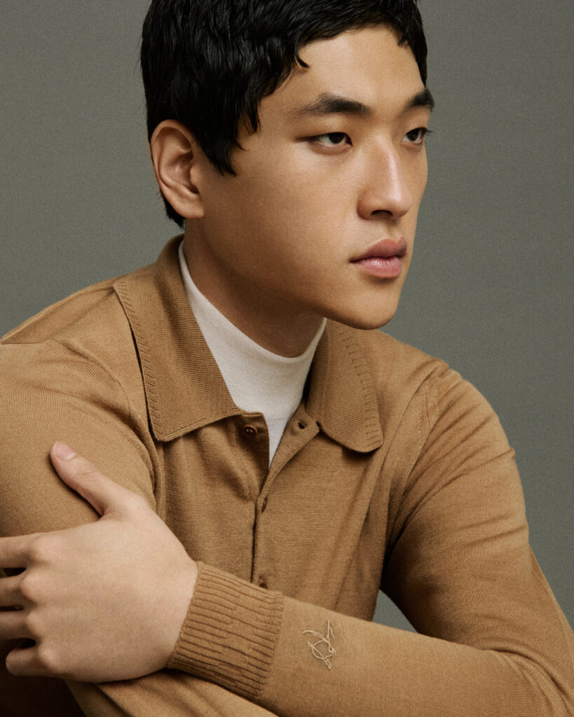 Point d’orgue de cette capsule, le retour des Long Johns – ces sous-vêtements longs en laine, emblématiques de l’histoire John Smedley – ici modernisés, et revendiqués comme indispensable de tournage par l’acteur. En filigrane, c’est toute une culture vestimentaire qui se dessine : celle d’un homme dont le goût s’est affûté au contact des années 60, du modernisme, du disco, et d’une Britishness qui évite le folklore.