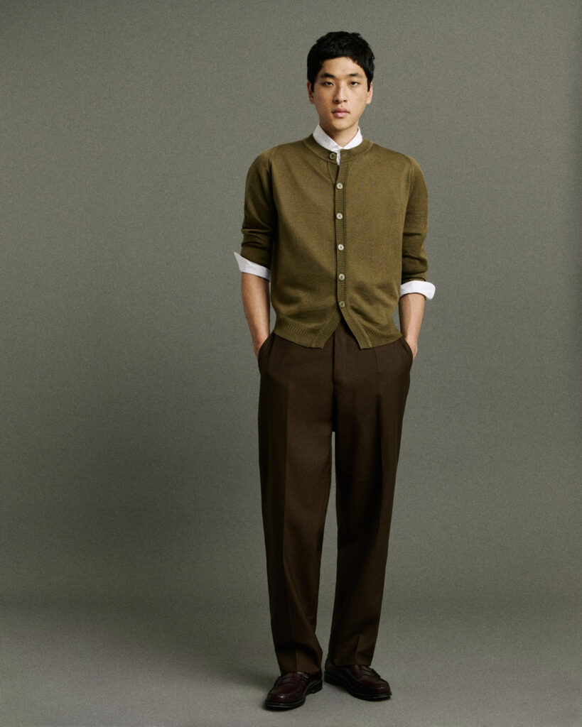 Chaque pièce est réalisée dans les ateliers historiques de Lea Mills (Derbyshire), berceau de la maison depuis 1784, en laine mérinos extra-fine, cachemire et coton Sea Island – matières nobles qui inscrivent cette collection dans une logique de durabilité et de fabrication responsable.
