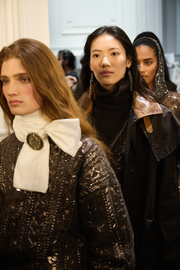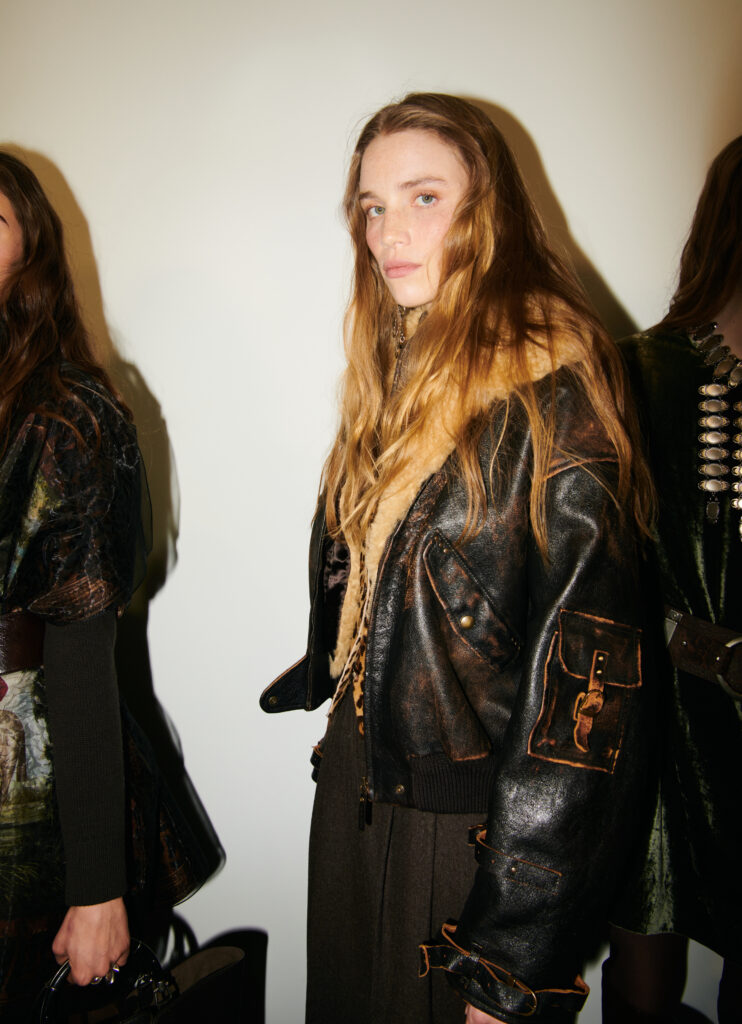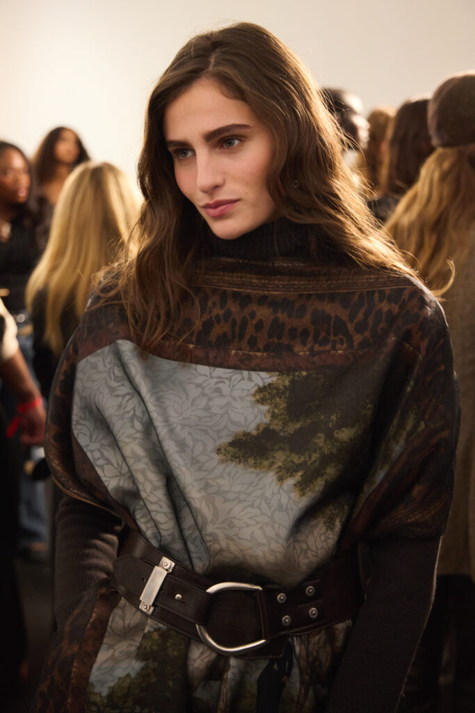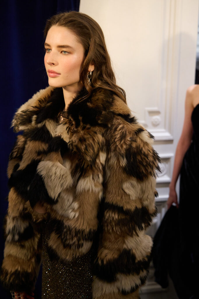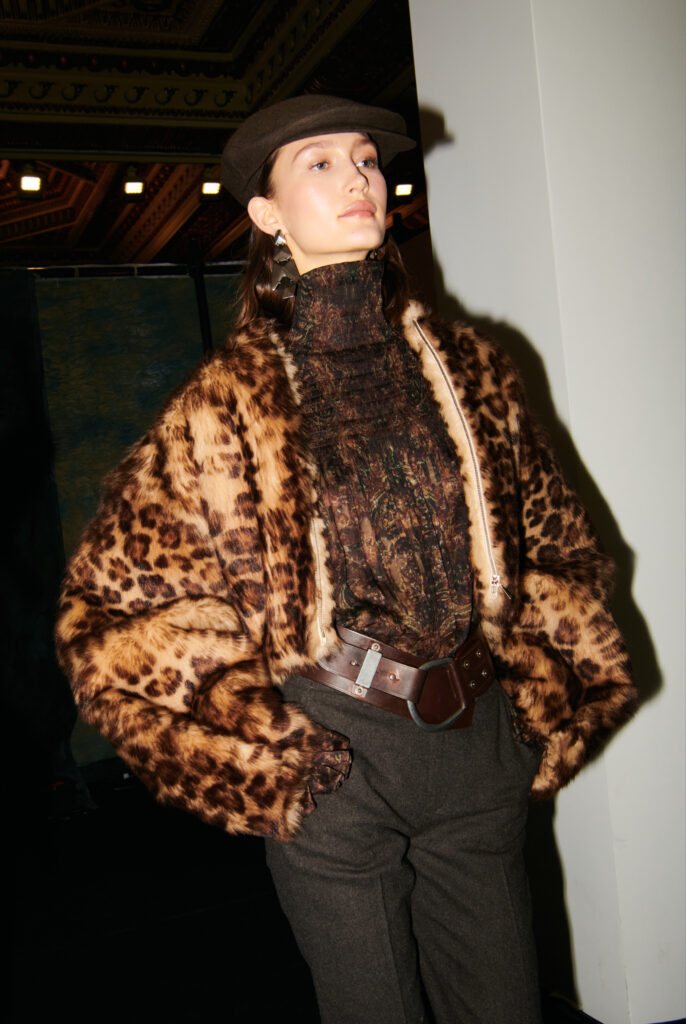 L’outerwear, lui, prend une place de premier plan. Le texte cite des manteaux double boutonnage a carreaux (windowpane) en laine, parfaitement coupes, et des grands manteaux en cuir texturé qui balayent le sol. Il y a aussi des vestes volontairement « defaites », portees ouvertes, dont une en cuir patine a la main. Et, dans un geste plus narratif, une veste en peau lainée imprime leopard, avec un dos structure en bulle, obtenu par une couche de crinoline cachee. C’est un detail tres couture dans l’idee: la structure n’est pas un effet d’epaule, c’est un volume construit, presque architectural, dissimule sous une piece qui a l’air instinctive.