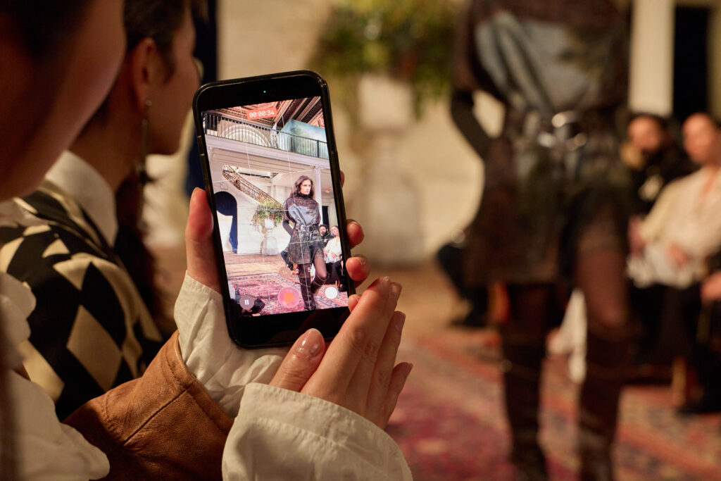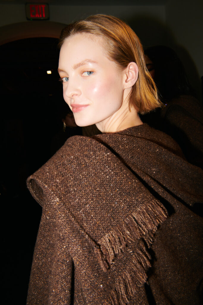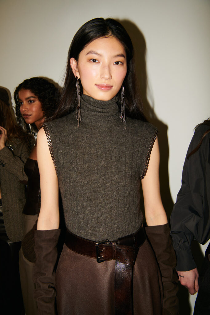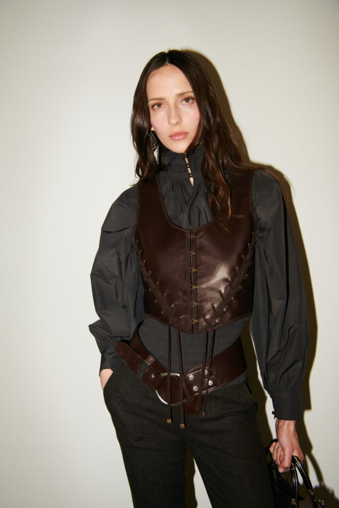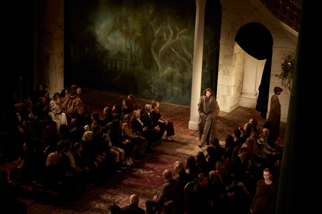 L’outerwear, lui, prend une place de premier plan. Le texte cite des manteaux double boutonnage a carreaux (windowpane) en laine, parfaitement coupes, et des grands manteaux en cuir texturé qui balayent le sol. Il y a aussi des vestes volontairement « defaites », portees ouvertes, dont une en cuir patine a la main. Et, dans un geste plus narratif, une veste en peau lainée imprime leopard, avec un dos structure en bulle, obtenu par une couche de crinoline cachee. C’est un detail tres couture dans l’idee: la structure n’est pas un effet d’epaule, c’est un volume construit, presque architectural, dissimule sous une piece qui a l’air instinctive.