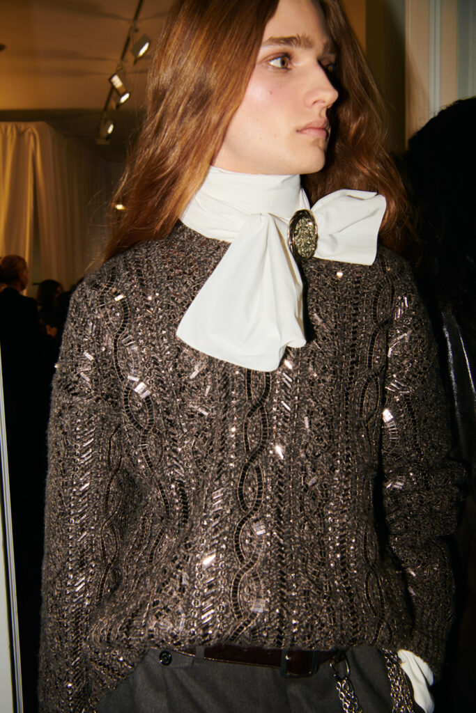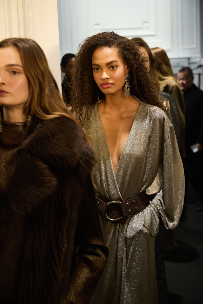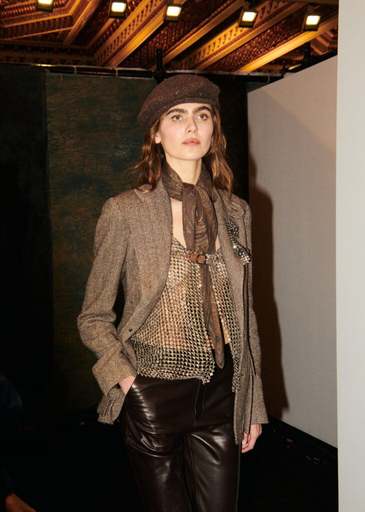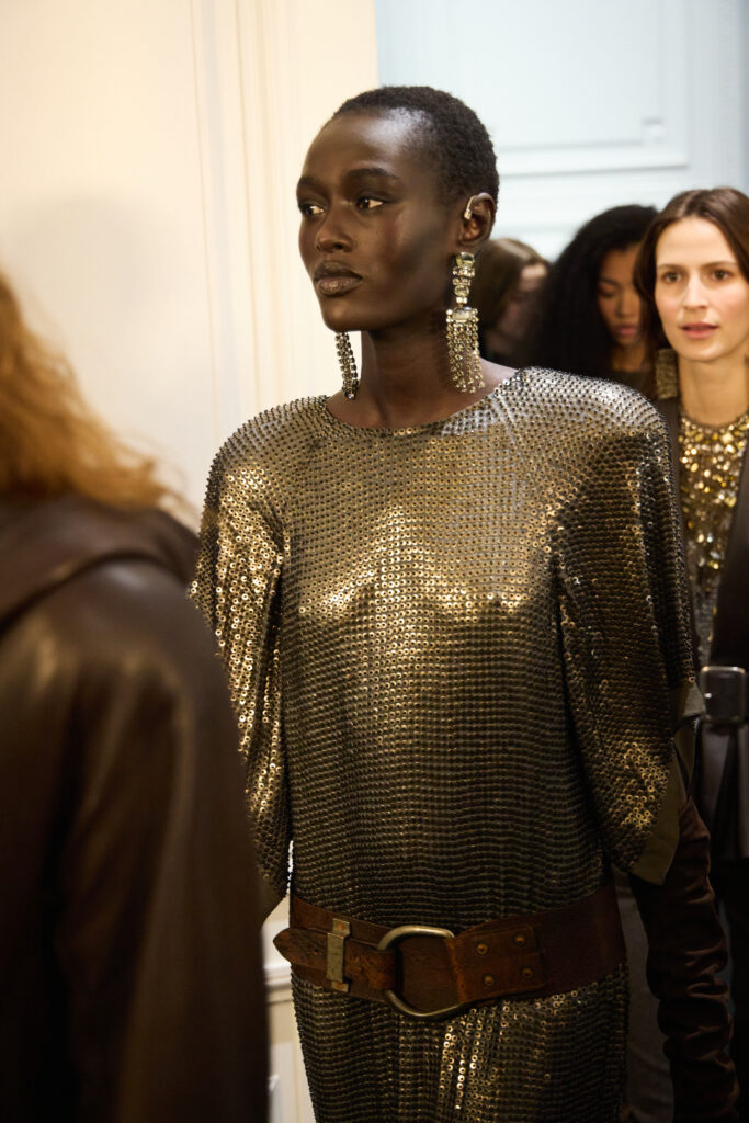 Le coeur « rebelle » du propos arrive avec des touches de corsetterie, des cottes de mailles (ou plutot des versions de resille concues pour en donner l’illusion), et des epaules marquees par moments. Pas de fetish ostentatoire ici, plutot une maniere de donner de la structure et du relief au geste, comme si la femme Ralph Lauren avait envie d’un peu d’armure, mais portable. La palette annoncee reste riche, terreuse, mais lacee de broderies aux tons metalliques, ce qui garde la silhouette lumineuse sans la rendre clinquante.