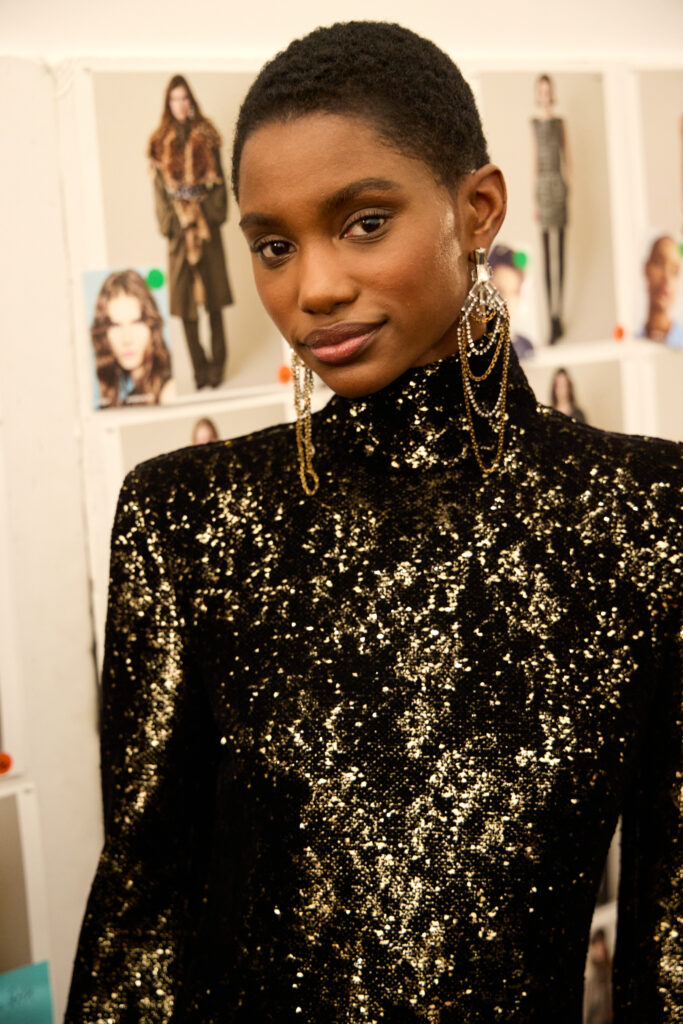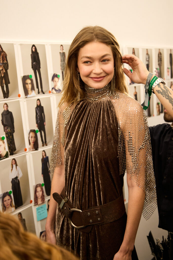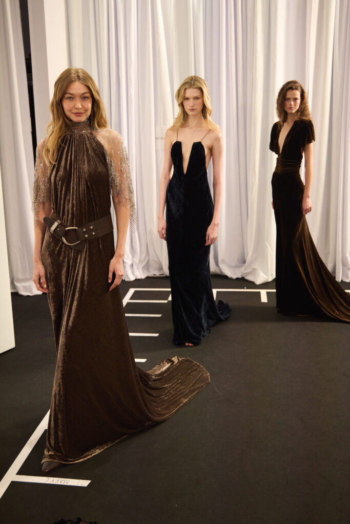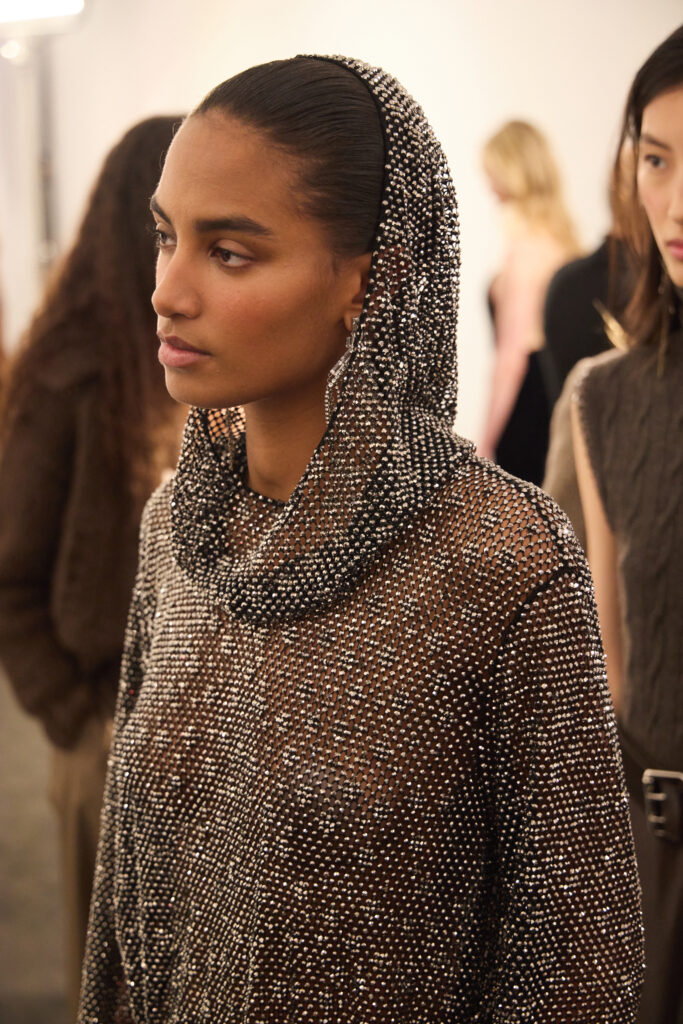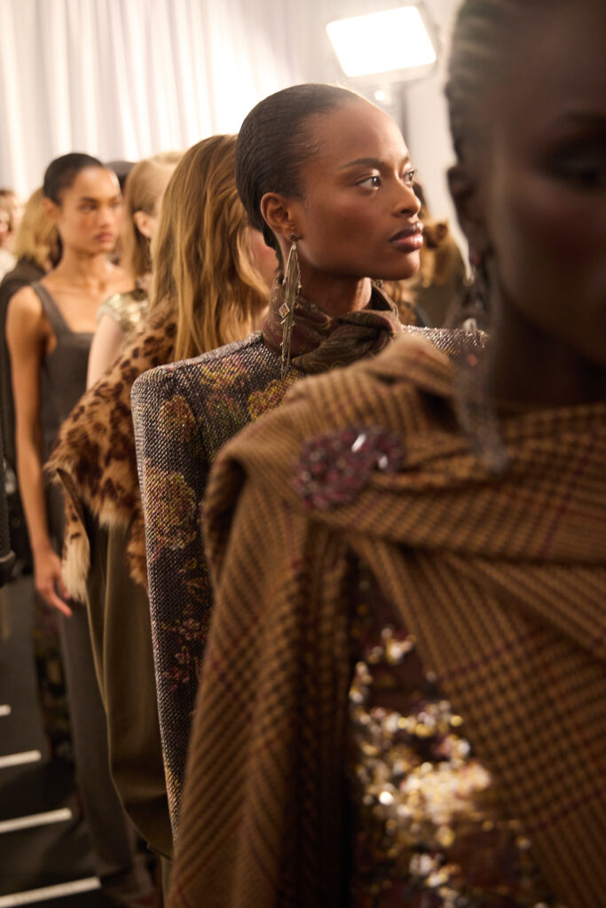 Le coeur « rebelle » du propos arrive avec des touches de corsetterie, des cottes de mailles (ou plutot des versions de resille concues pour en donner l’illusion), et des epaules marquees par moments. Pas de fetish ostentatoire ici, plutot une maniere de donner de la structure et du relief au geste, comme si la femme Ralph Lauren avait envie d’un peu d’armure, mais portable. La palette annoncee reste riche, terreuse, mais lacee de broderies aux tons metalliques, ce qui garde la silhouette lumineuse sans la rendre clinquante.