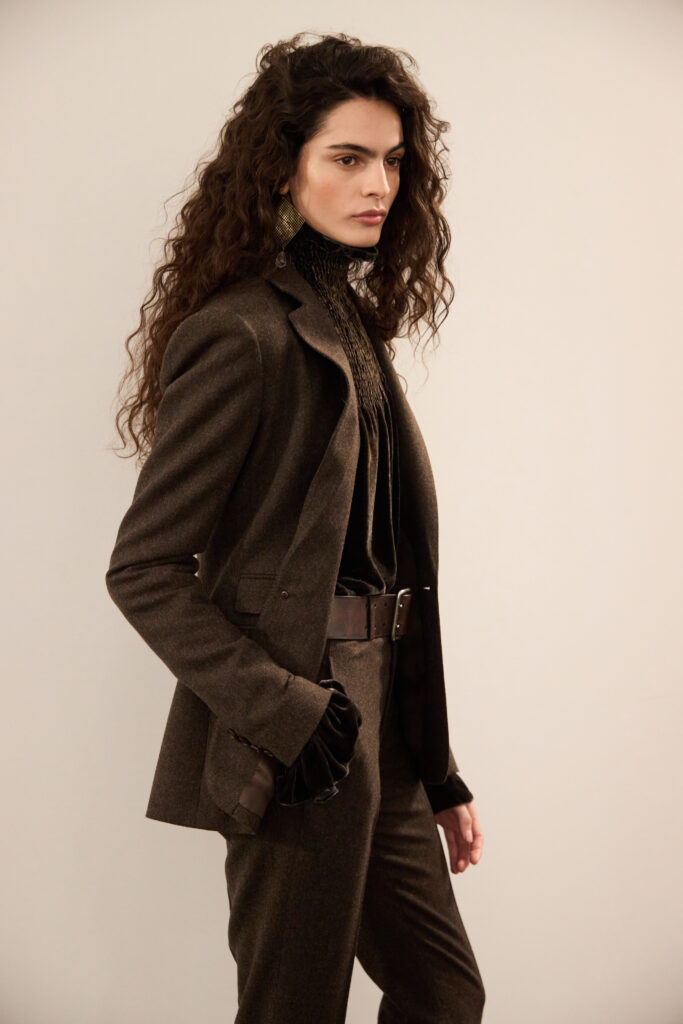 La collection revendique plus de cinquante matieres realisees specialement: tweeds, velours, jacquards, broderies, imprimés foulards, cuirs et peaux lainées. Parmi les exemples donnes, une veste courte reversible passe d’une laine a une surface metallisee craquele; une autre veste en velours jacquard avec motif de plumes est associee a un pantalon en flanelle stretch. Une robe en velours de soie couleur chardon, avec empiècement smocke a la main et orne de perles, voit sa feminite « challengee » par une veste oversize a chevrons. Et le soir, l’artisanat devient une methode: robe fourreau a col montant couverte de micro-paillettes, surimprimee de velours floque; robe dos nu dont le velours demande une double teinture (marron puis bleu fonce) pour obtenir une luminescence specifique; et un haut qui cumule plusieurs etapes de travail a la main (broderie sequins et fils, peinture, applique de bandes de cuir, franges en perles de verre).