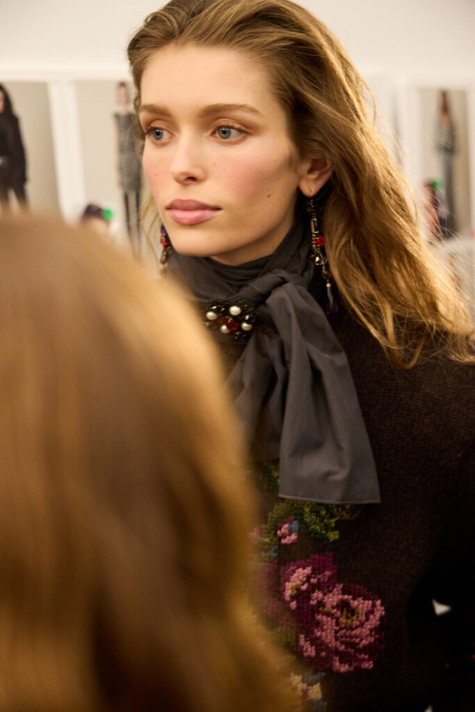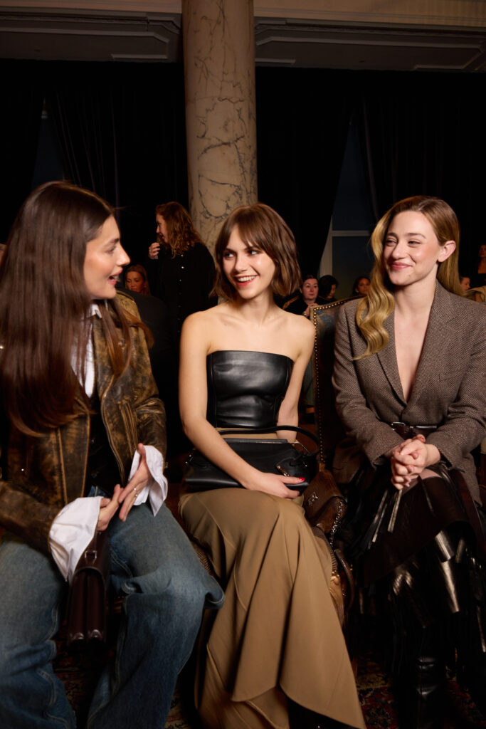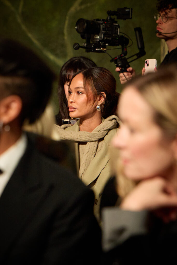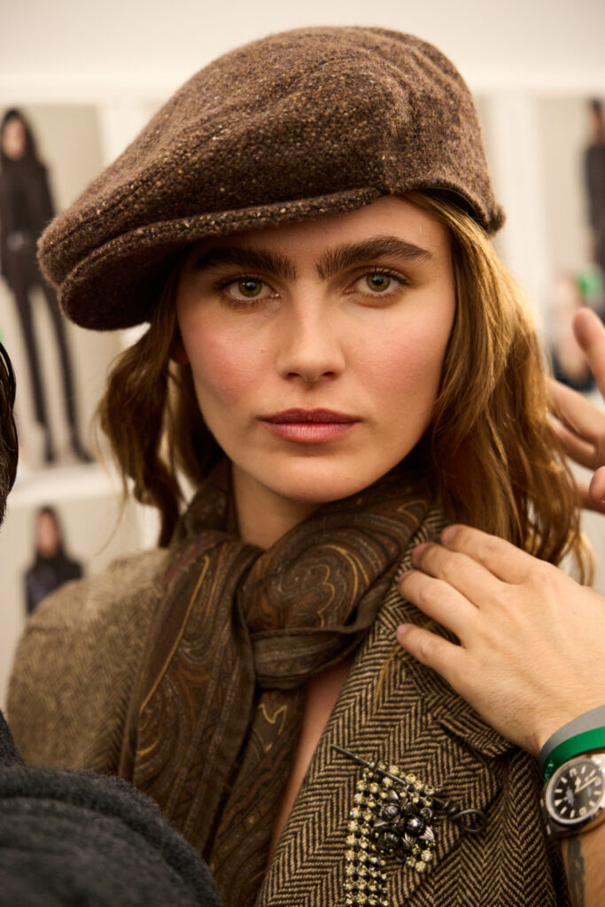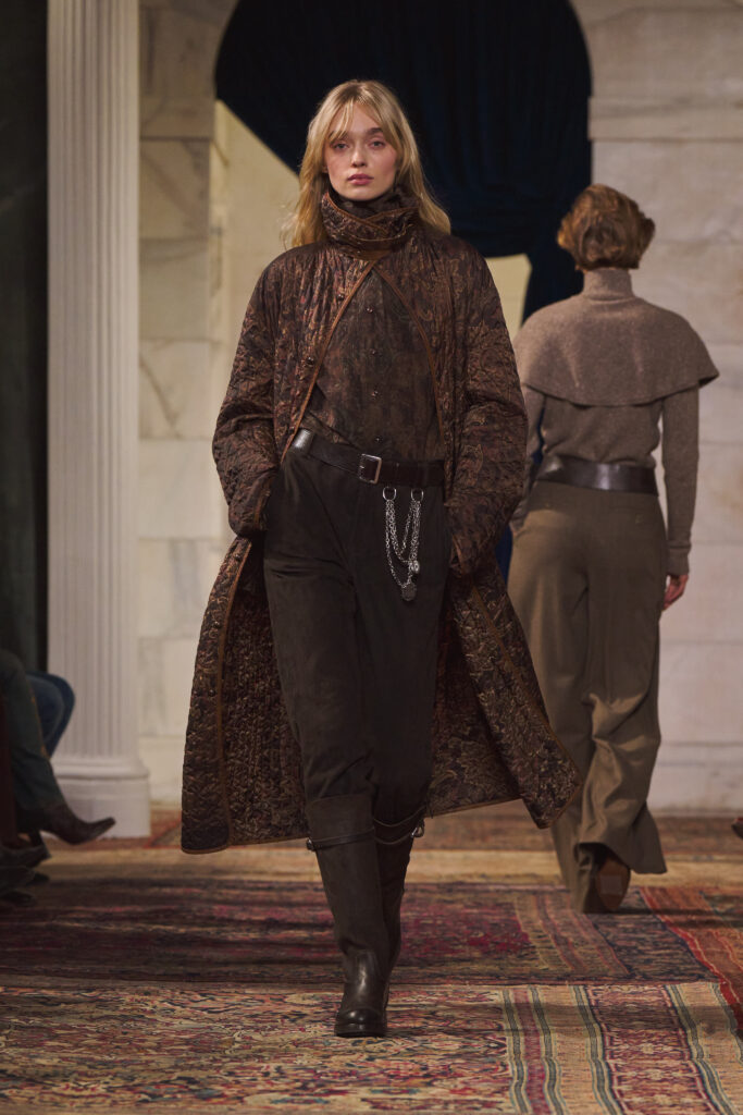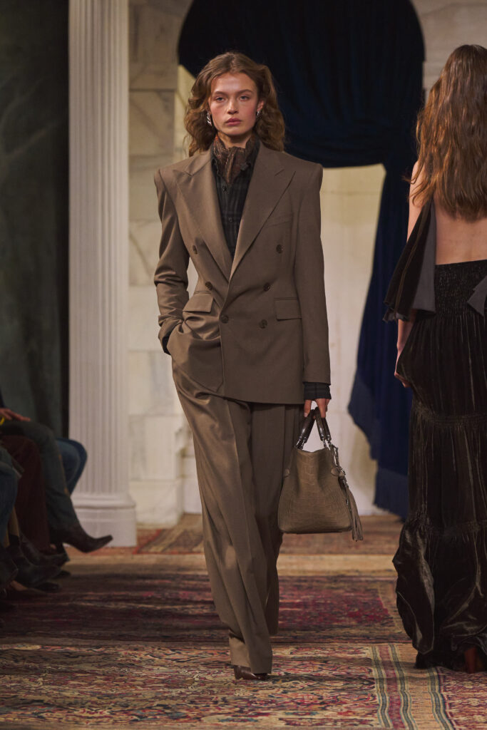 Les accessoires, enfin, « posent » le personnage. Bottes d’equitation et pantoufles en velours brode viennent ancrer les looks. Le sac Ralph se declinent, avec mention du Tote et d’un nouveau Mini Crossbody. Et une nouveaute: la pochette Deco Lock, avec poignee-chaine qui se pose sur la main « comme un bracelet », reprenant les accents metalliques de la collection. On est sur un detail d’usage, presque un bijou utilitaire, qui colle bien a l’idee d’un pragmatisme chic.