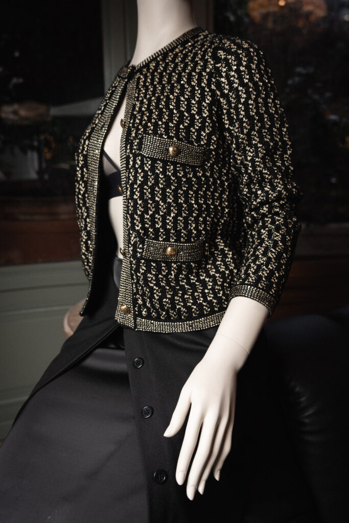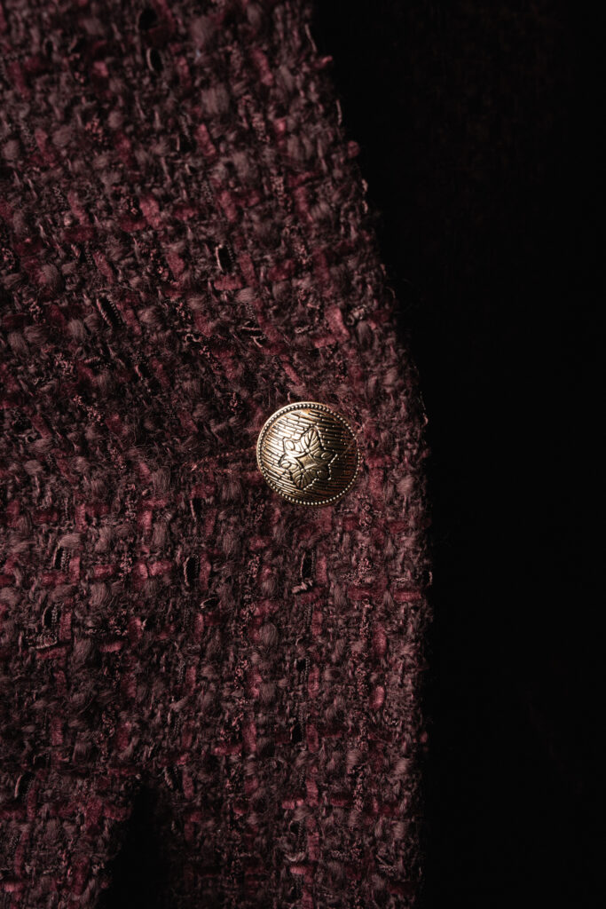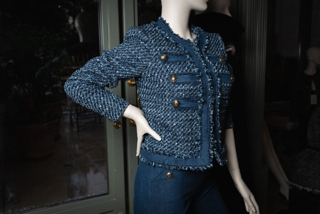 La matière raconte la même exigence. Tweeds à l’esprit craft, crêpes de laine à la main dense, denims haut de gamme : les tissus sont sourcés en France et en Italie, issus des filières du luxe. Le détail compte — boutons dorés, ganses, finitions — mais il ne détourne jamais l’attention de la coupe. La veste reste l’axe autour duquel tout s’organise.